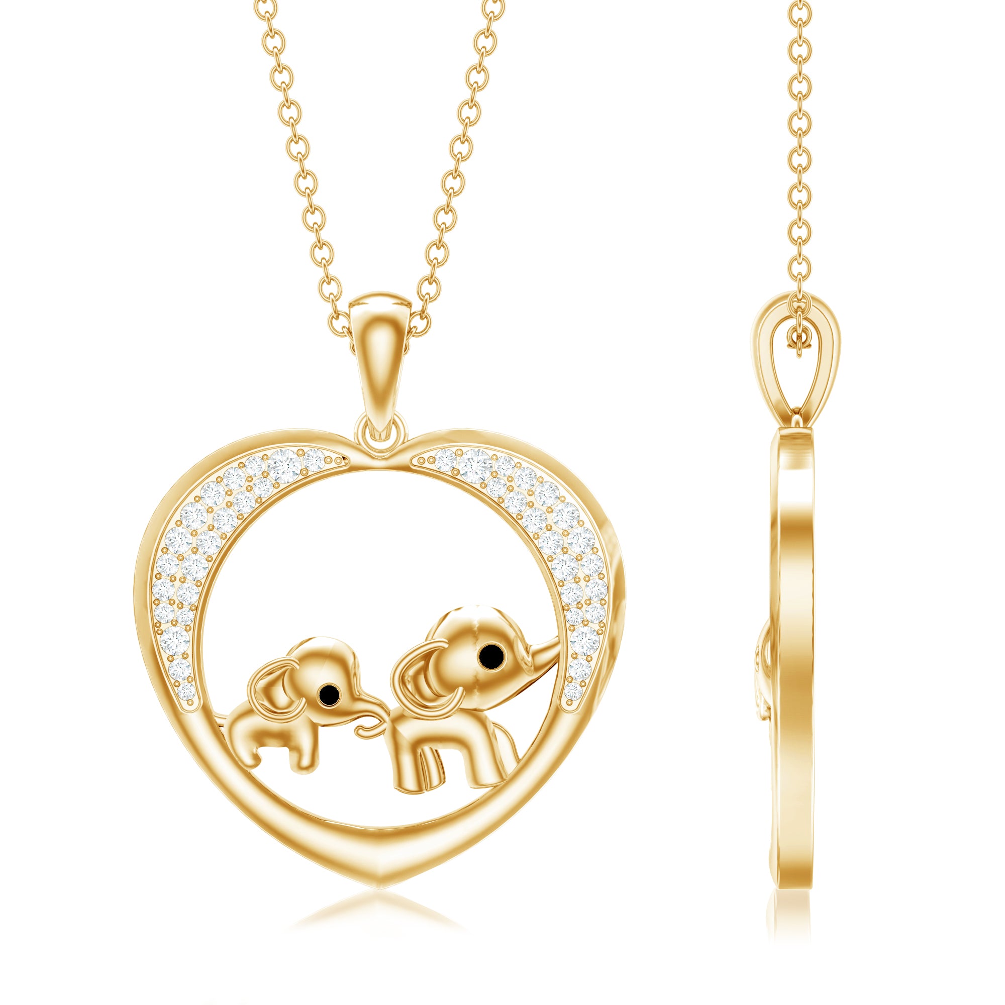 This cute Diamond Elephant Necklace celebrates the unique and special bond just like a mother and a child. As a tender crafted with precision and care, this Pendant is a constant reminder to mom and baby of the unwavering love between mom and baby. A heart symbol decorated with Round brilliant cut Diamond speaks volumes. Along with the graceful metal curves of the elephant mother intertwining with the babys form, representing the strength and depth of your connection. It is a testament to the nurturing, protective, and wise spirit of motherhood. Thus Mother and Daughter Necklace is the essence of maternal love and the kind giants of the animal kingdom. Dangling through a chain, this Elephant Necklace carries your cherished memories, imagining the tales whispering and the laughter shared. It is the enduring power of family love that is not easily forgotten and will always be linked together. Whether for a new mother embarking on this incredible journey or simply as a token of self-love, this Elephant Mother Child Heart Necklace is a meaningful and beautiful choice.