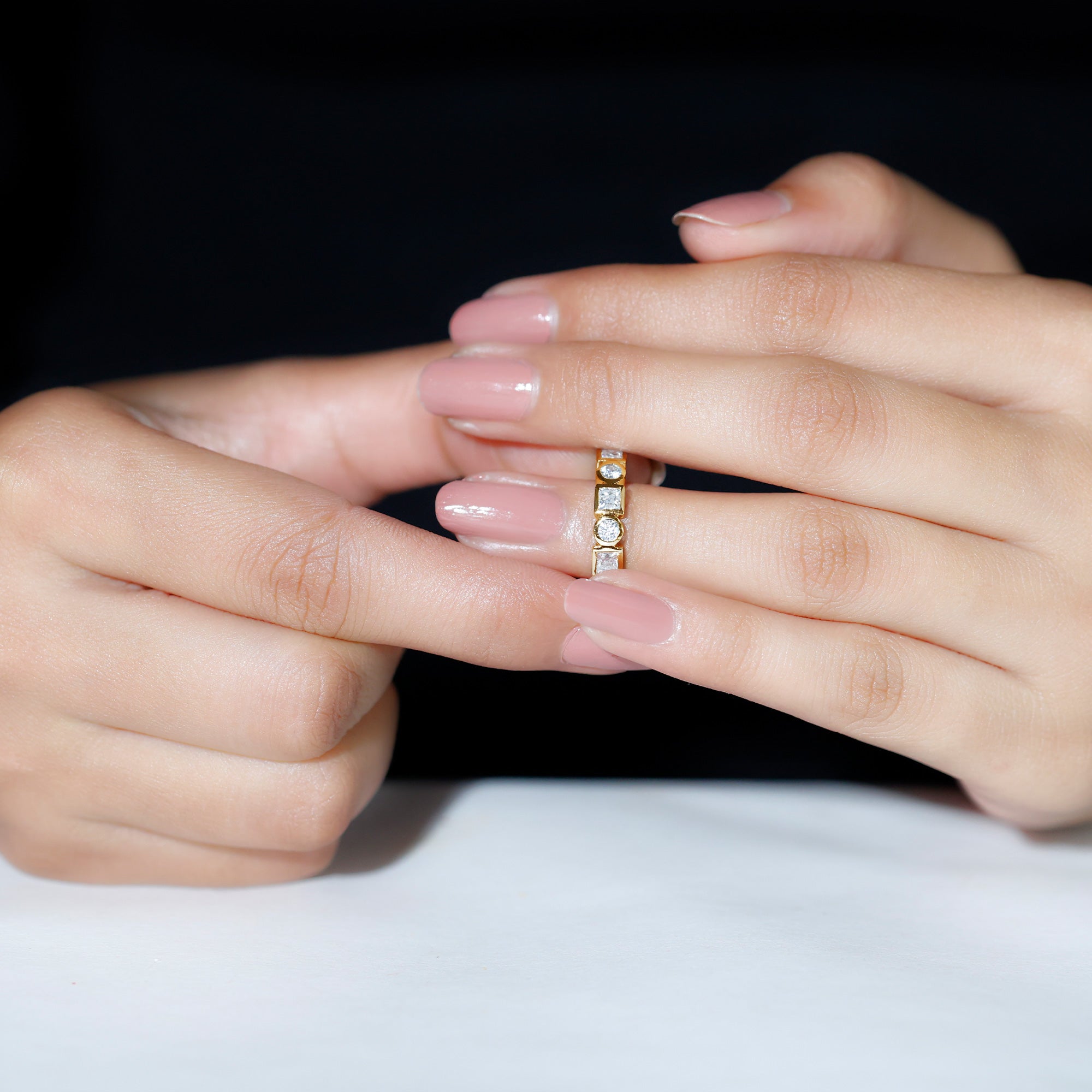 - Crafted for the woman who desires a hint of sparkle in her everyday jewelry, this Half Eternity Ring showcases alternating round and princess cut lab-created diamonds of EF-VS quality, all beautifully secured in bezel setting.