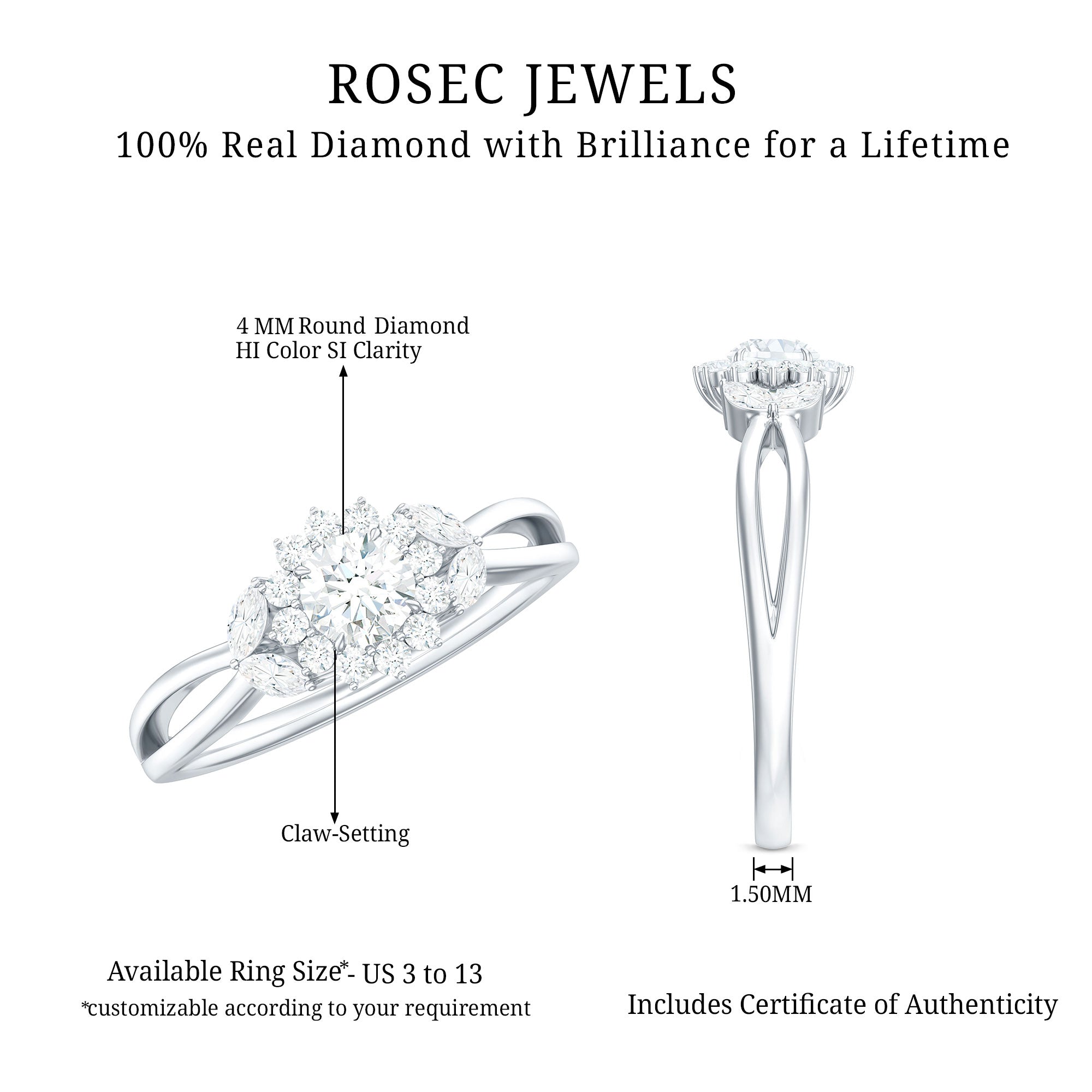 This Real Diamond Engagement Ring features a beautiful floral design, making it an ideal piece to celebrate your special day. It is a delicate and elegant piece that feels like a dream come true, inspired by the beauty of nature to create a feminine look. The ring showcases a 4 MM Round Shaped Diamond set in Claw Setting. With a Round Diamond Halo and additional Marquise Cut Stones, it resembles a delicate leaf, enhanced by a Split Shank. Crafted with great attention to detail, this Diamond Flower Engagement Ring highlights a floral motif. The intricate design paired with a timeless style makes the Diamond Halo Ring a fantastic choice, capturing the magical feelings tied to each bloom while honoring natural beauty. The HI Color SI Clarity diamond provides a unique variety of styles to elevate your appearance. Beautifully packaged in a signature jewelry box, this Split Shank Engagement Ring is ready to be gifted and cherished. Let your love shine with a sparkle that is gentle on the environment and perfect for your happily ever after. This Flower Ring exudes luxury and elegance, making it an absolutely stunning choice.