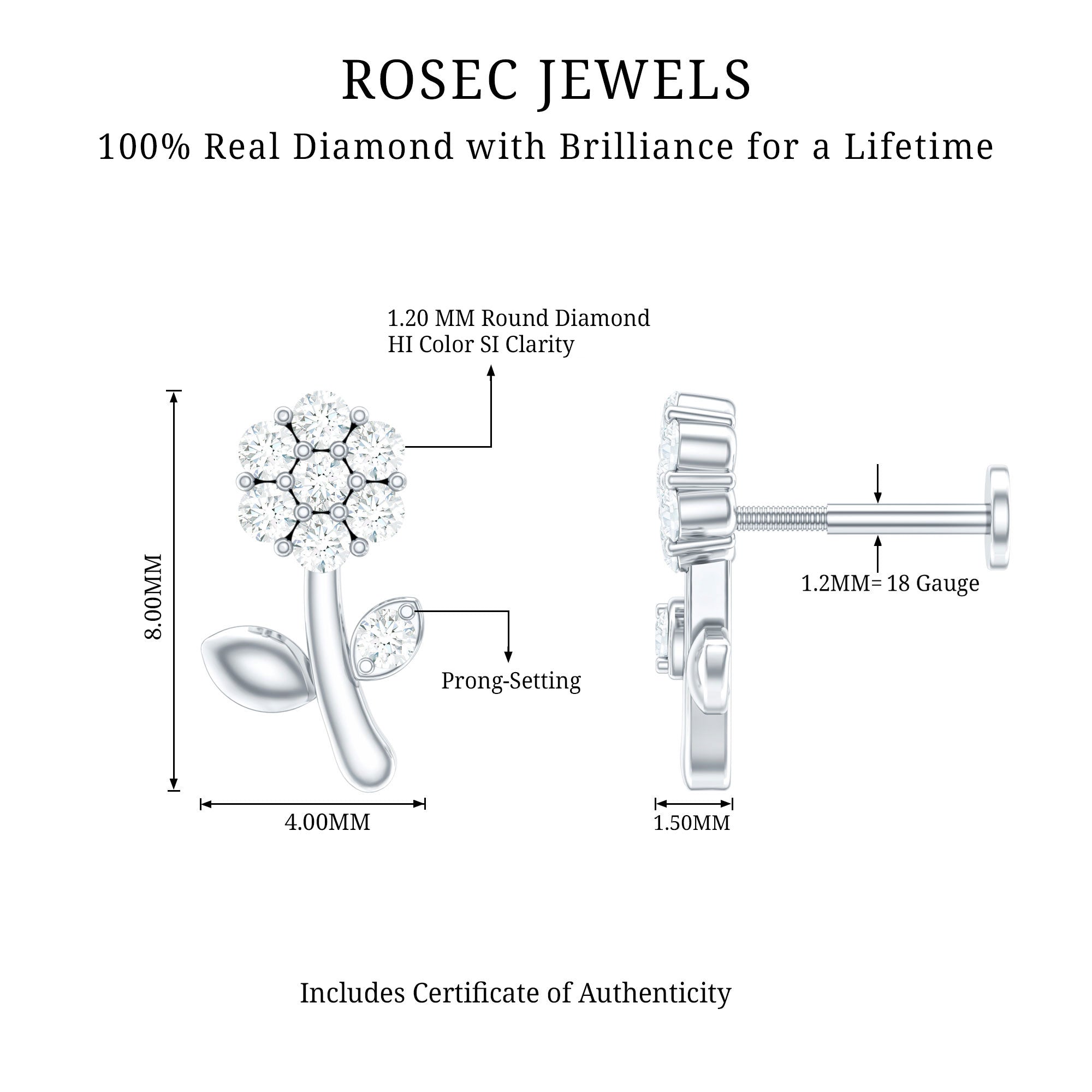 Beautiful and delicate, the Diamond Flower Earring is embellished with sparkling Round Shape Diamonds in Prong Setting that are assembled in a flower design. This Helix Earring is a stunning piece of jewelry, as you can probably turn any dull outfit into a bright and nicer one with the vibe it carries. You can style this Diamond Piercing Earring on your Helix, Cartilage, Upper Lobe, and Conch Piercing.Make your anniversary day even more special by presenting this Diamond Floral Earring to your lady love, she will definitely love it.