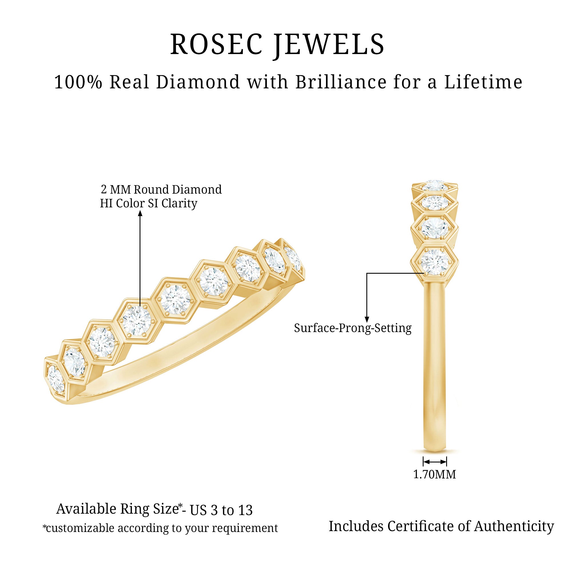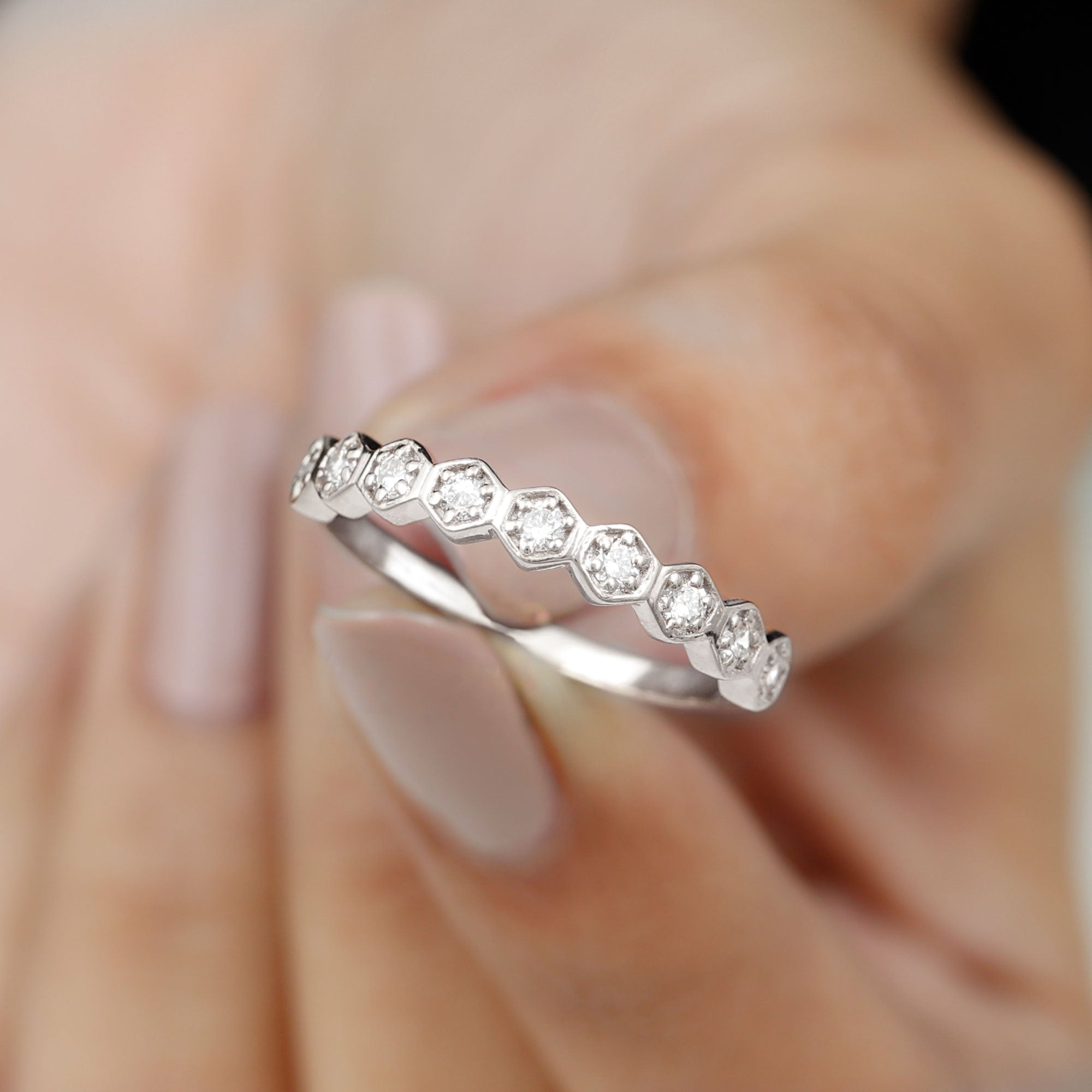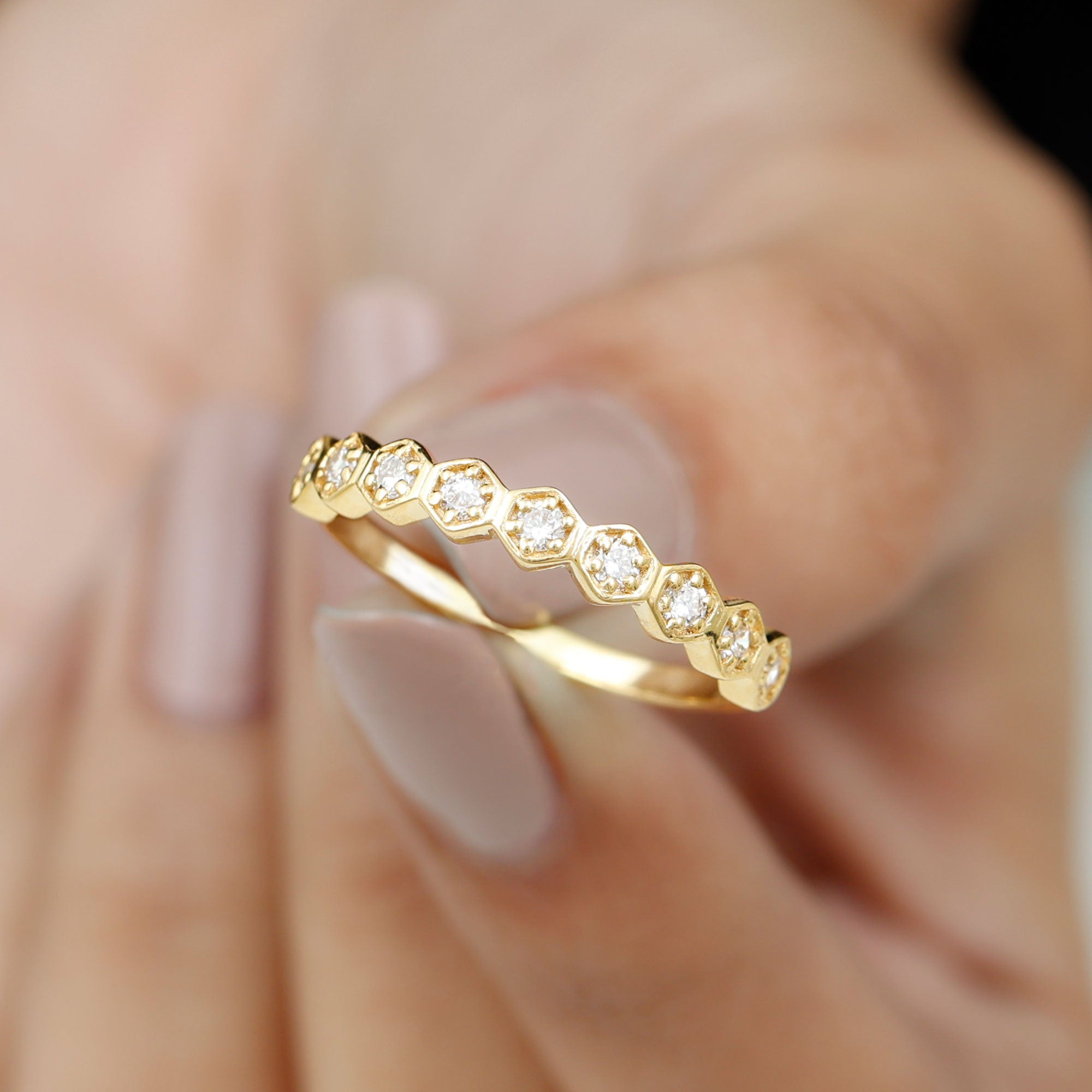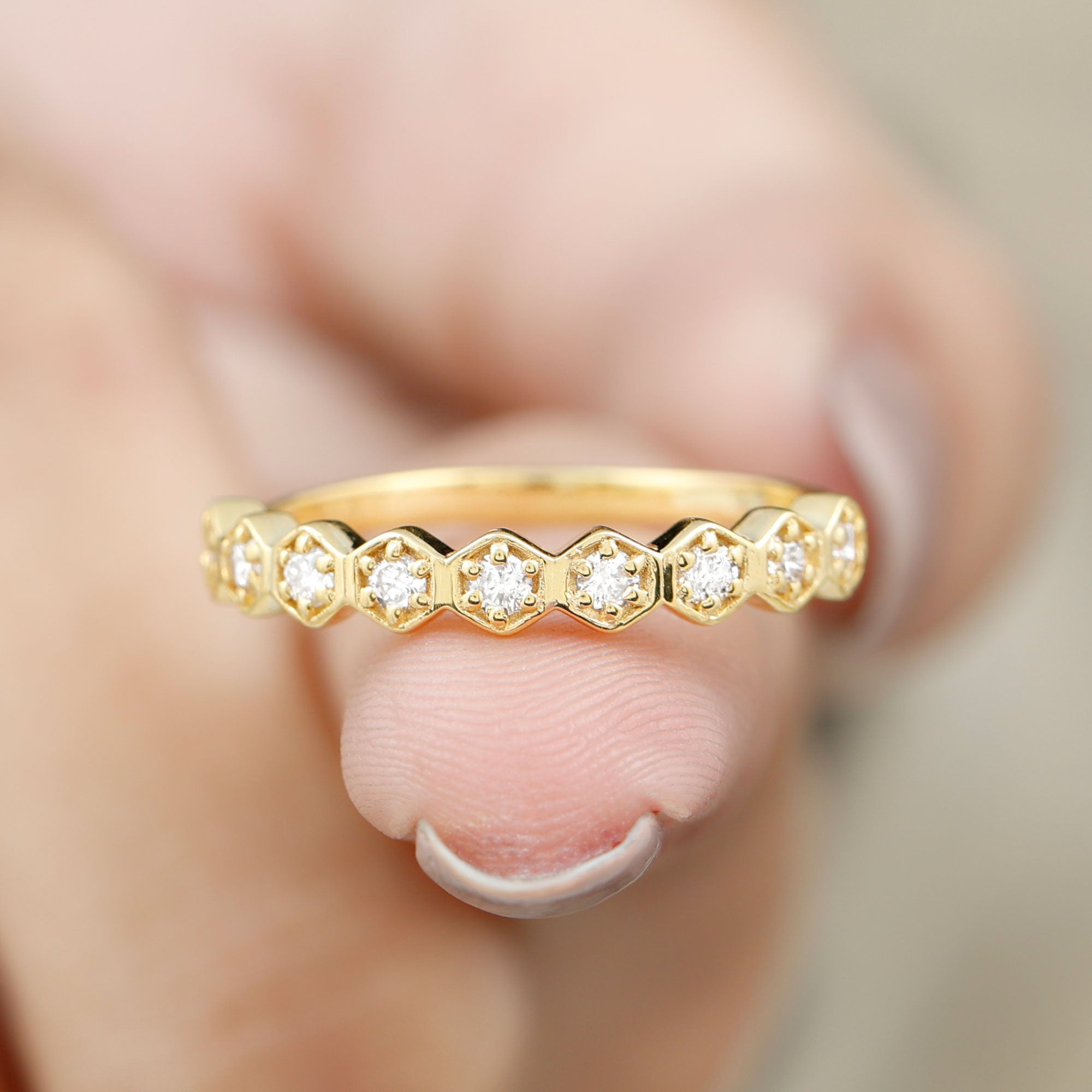 This gorgeous Stackable Ring is beautifully set with the sparkling Brilliant Round Diamond in the hexagon frame. Diamond Band is the perfect choice to compliment your outfit. We craft this piece in Solid Gold and is set in Prong Setting making it a stunning Ring.