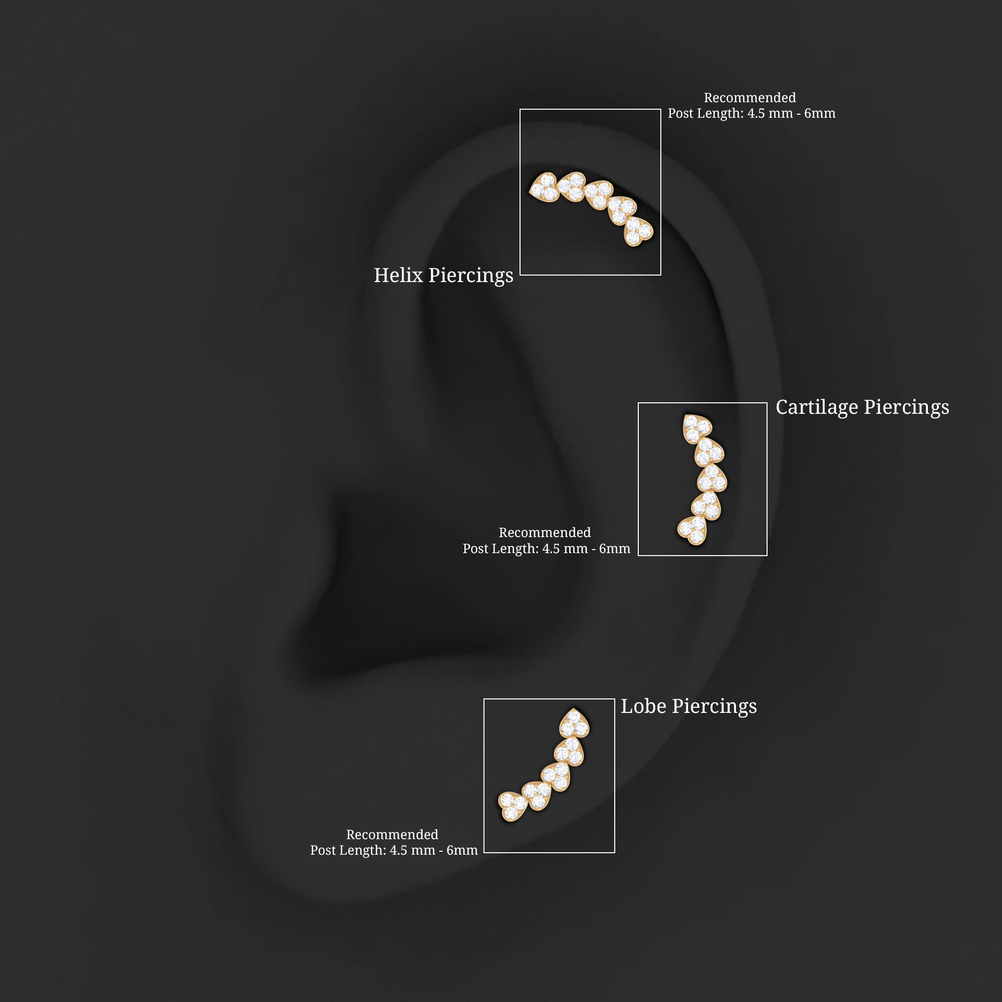 - This earring showcases delicate Round Diamonds held in place by Pave Setting on heart designs arranged in a curved crawler style.