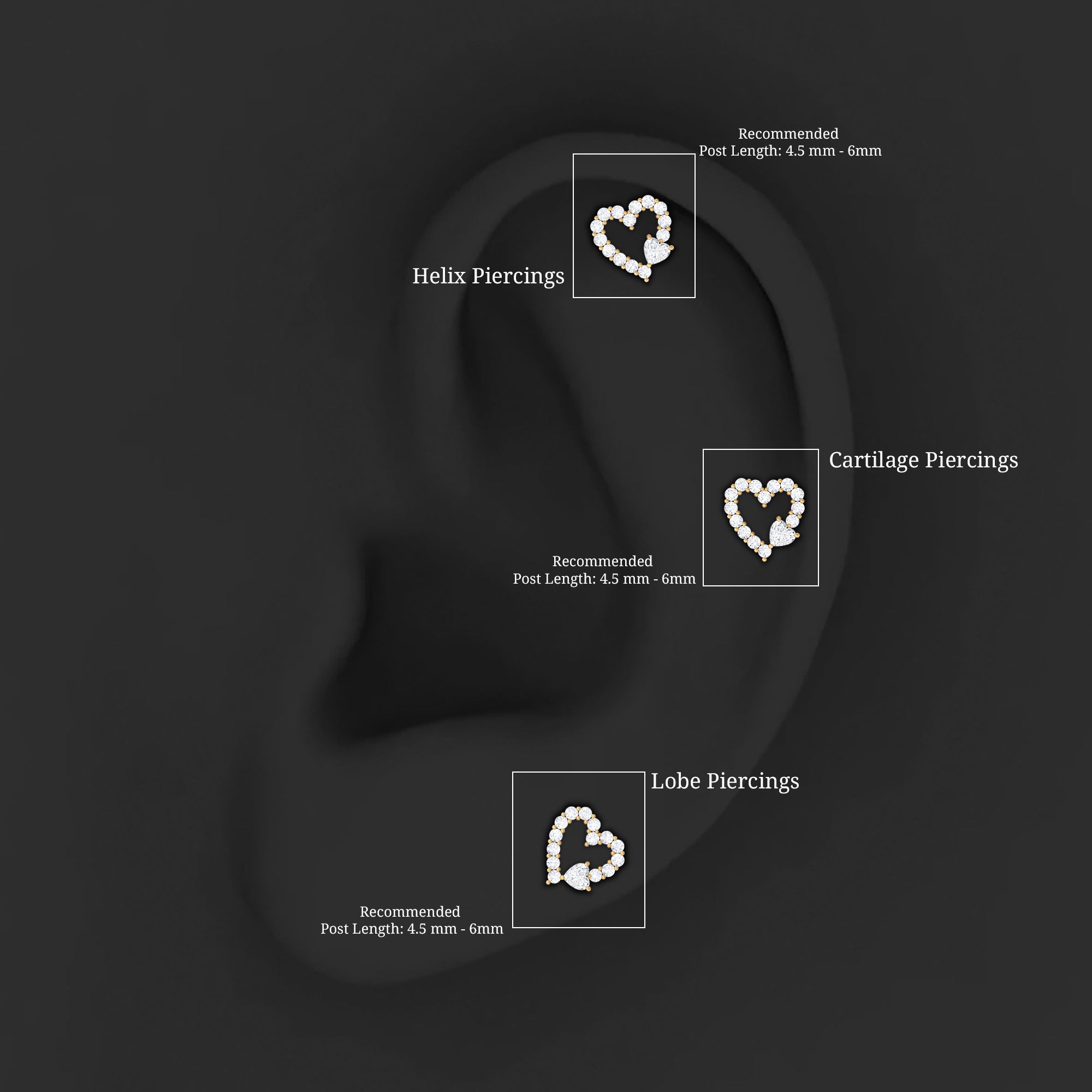 - You can wear this diamond heart earring on your multiple piercings like Helix, Cartilage, Tragus, Conch, or Upper Lobe Piercing.