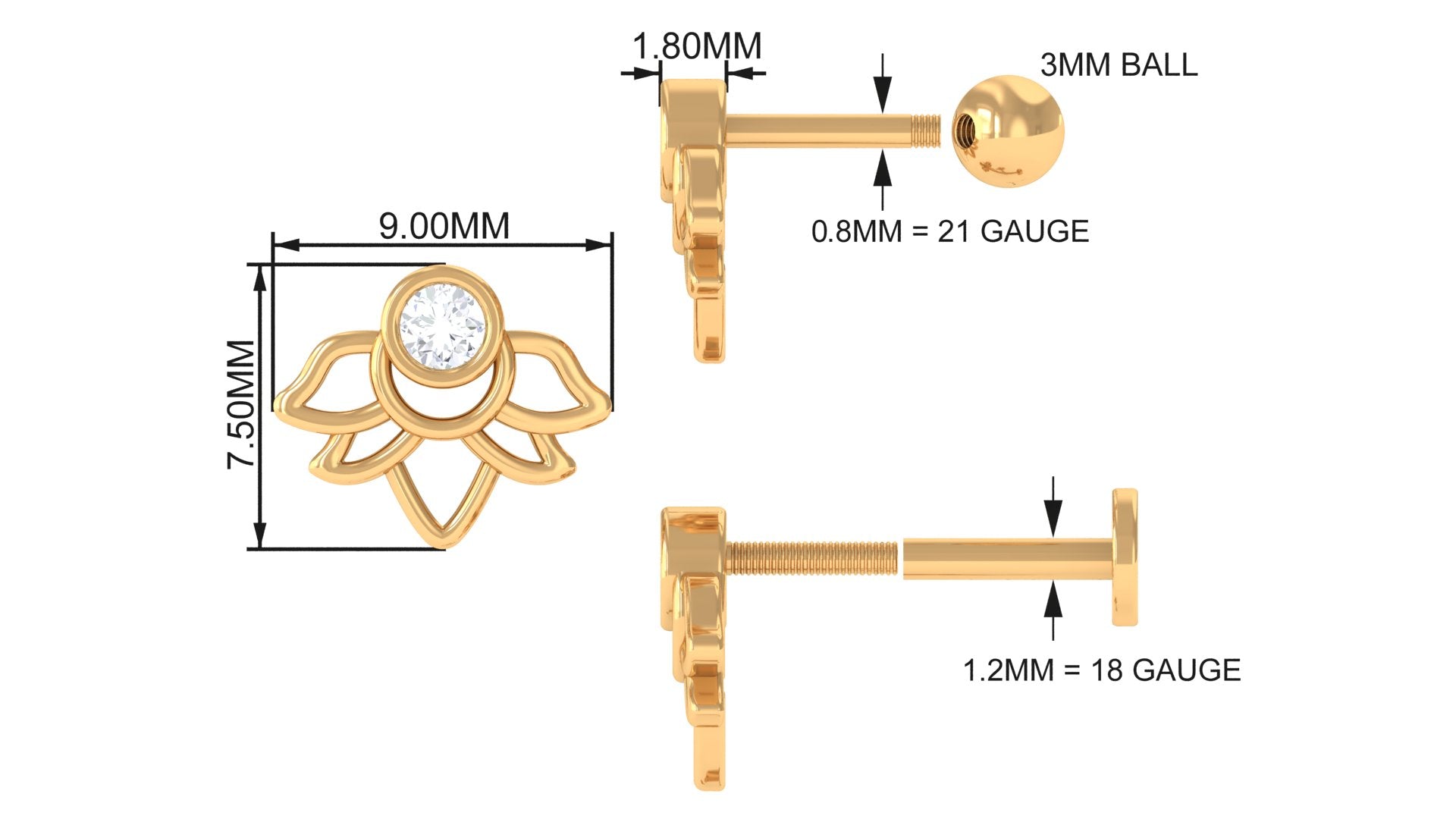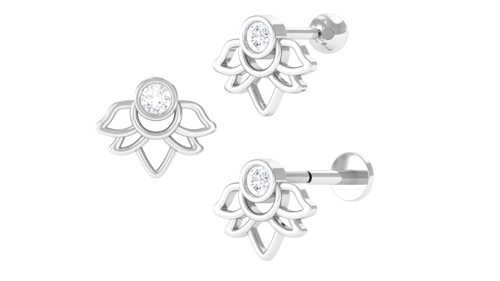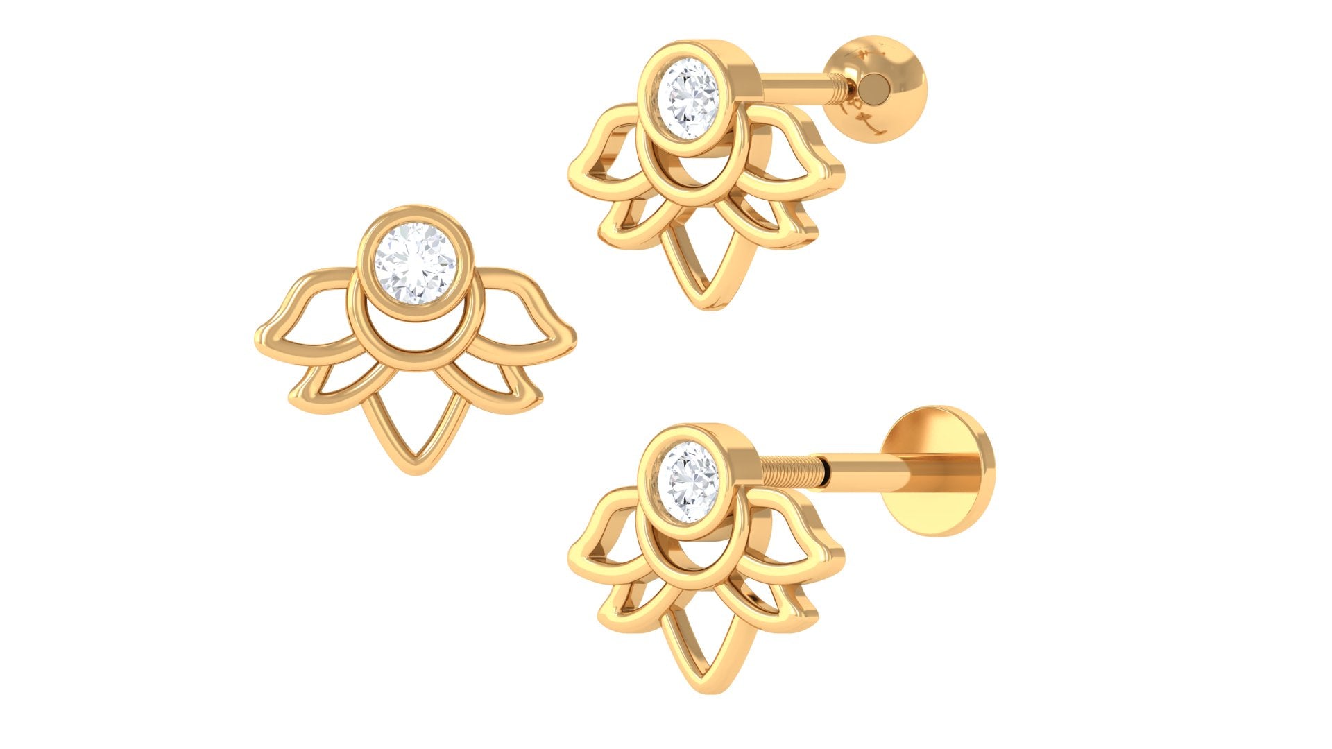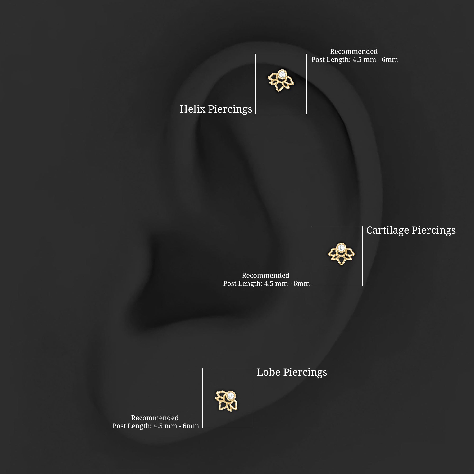 Floral inspired piercing earrings have become extremely popular, and they are more fashionable than ever before. If you are searching for jewelry to enhance your look with a layered design, consider this Diamond Floral Earring. This beautiful earring features a sparkling round diamond set in bezel setting set in a gold flower motif. Now, imagine the beauty of a flower earring designed to be a fit for your Helix, Cartilage, or Upper Lobe Piercing. This exquisite piece of jewelry can be the start of a collection of piercing earrings.