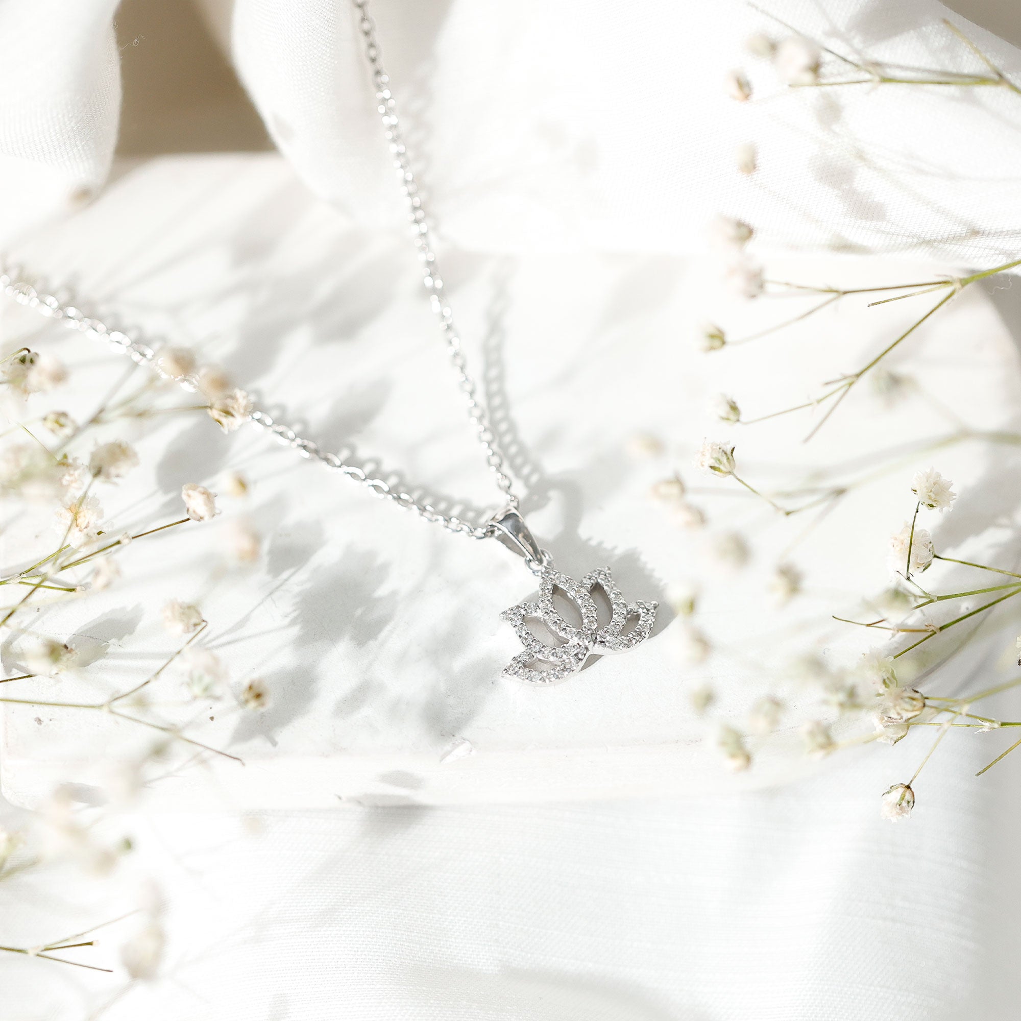 Add a touch of nature-inspired elegance to your look with this stunning Diamond Lotus Necklace. The pendant features a delicate lotus flower design, expertly crafted in gleaming metal and encrusted with a sparkling Round Diamond in Pave Setting. This elegant Lotus Flower Necklace is perfect for adding a touch of sophistication and glamour to any outfit, and makes an ideal gift for someone special. This Diamond Lotus Floral Pendant Necklace is sure to captivate with its intricate design and timeless beauty. Let its shimmering diamonds and delicate floral motif elevate your style and make you feel like a true natural beauty. The simplicity of the Diamond Necklace for Women is punctuated with charm and serenity that radiates wherever you go. The luxury, drama and mystery of this Diamond Pendant Necklace is designed to evoke the spirit of the show in a fun and playful way. So, shimmer and sparkle just as the lotus comes up from the bud, which is pure when it opens. Symbolizing enlightenment and determination, this Real Diamond Necklace combines the timeless beauty of the lotus flower with the captivating beauty of Natural Diamond.