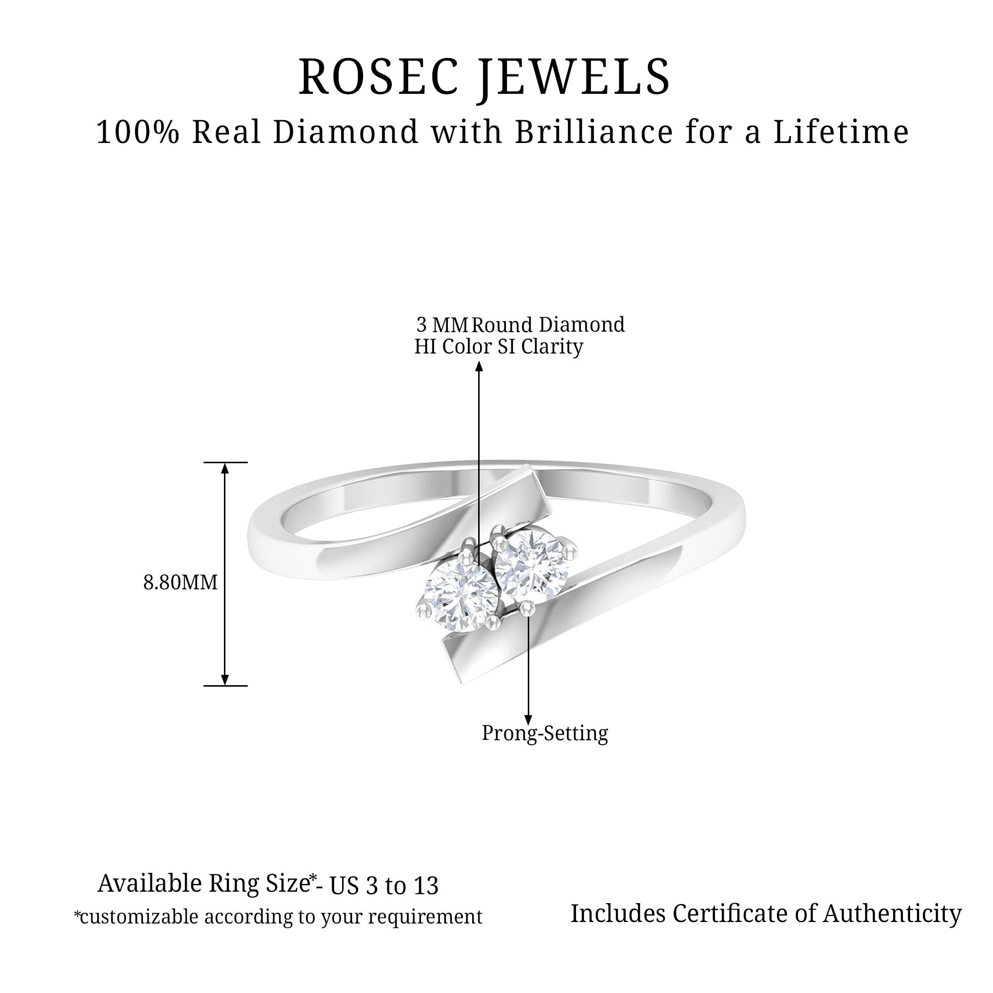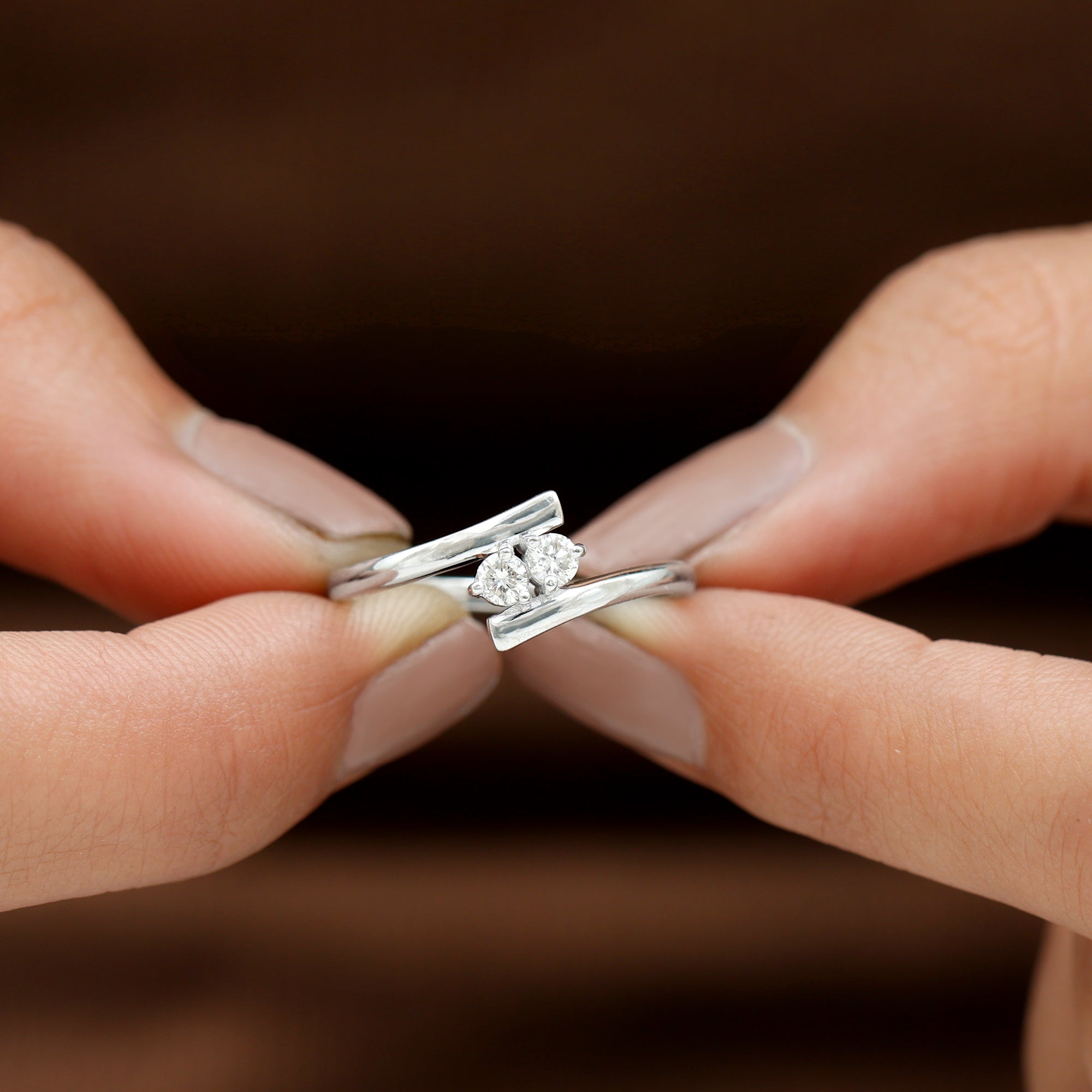 Unique and significant, this Diamond 2 Stone Ring represents the love and bond between two people, making it an ideal choice for engagements or simply as a surprise. Elegantly crafted, this Two Stone Promise Ring showcases two stunning round diamonds that unite to symbolize two souls in a captivating design. The stones are held in prong setting, giving it a sophisticated appearance over a bypass shank. This lovely Two Stone Ring enhances any outfit, adding a touch of classy shine and refined style. Whether you are marking a birthday, anniversary, Womens Day, or just searching for a thoughtful gift for your girlfriend, this Diamond Proposal Ring comes beautifully packaged in a high-quality jewelry box, ready to be gifted to someone special. Plus, to guarantee its quality, this Bypass Diamond Ring comes with a certificate of authenticity, offering you peace of mind. A striking statement piece that captures attention, symbolizing love and romance. Shine with the exquisite elegance of this Minimalist Promise Ring, which boasts luxury that radiates brilliance from every angle.