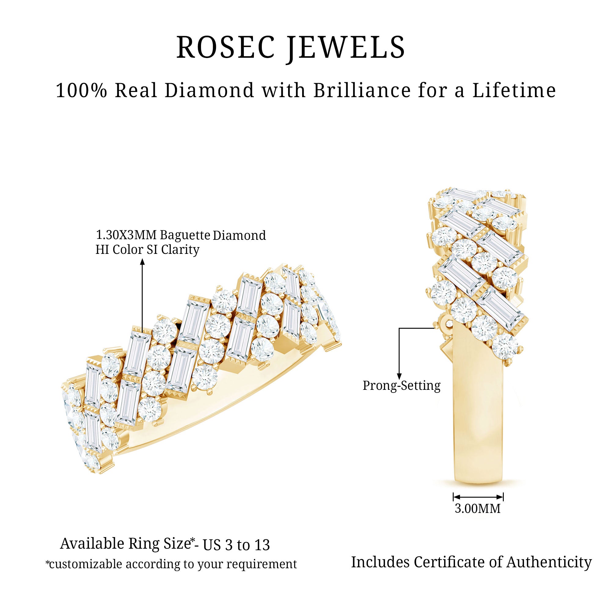Make your special moment unforgettable with a wedding band that feels bold, graceful and full of meaning. This Diamond Wedding Band is designed to stand out, just like your love story. Alternating Baguette and Round Shape Diamond stones are placed in slanted lines, creating a beautiful rhythm of sparkle and light. The design feels modern, yet still deeply romantic, perfect for a woman who loves elegance with a touch of individuality. Available in various ring sizes, this Wedding Band for Women is crafted to fit comfortably and become part of your everyday life. The band arrives in a signature jewelry box, ready to mark a meaningful promise or a once-in-a-lifetime yes. Whether it is for a wedding, anniversary or a moment that deserves to be remembered, this Baguette Wedding Band speaks straight from the heart. It is a symbol of love that grows stronger, brighter and more beautiful with time.
