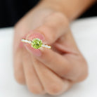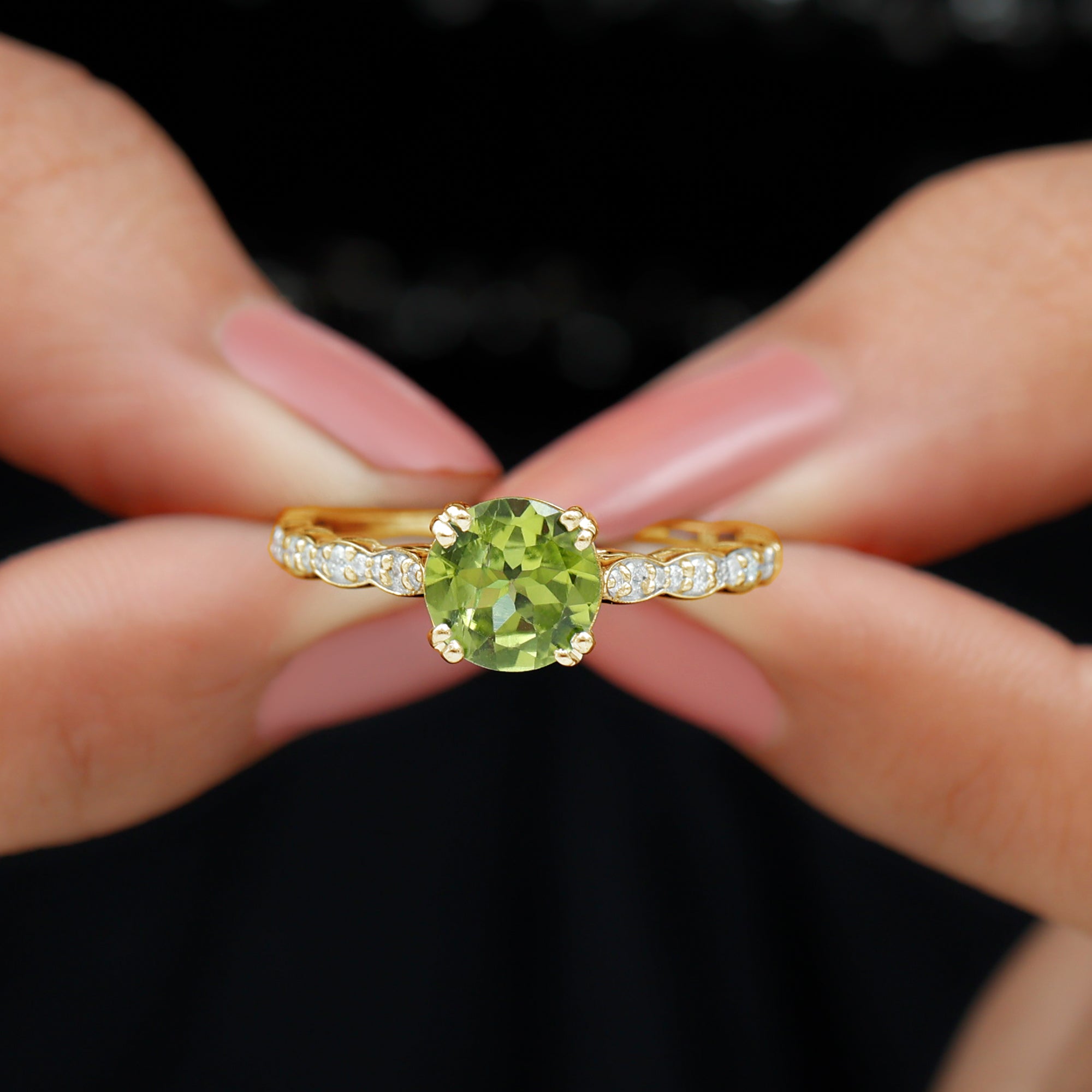 The Solitaire Engagement Ring is a lovely piece encased with 8 MM Round Shaped Peridot as a Solitaire in Double Prong Setting and the Unique Design is set with Diamond as Side Stones. Grab this Beautiful Ring for your Lady Love as a Gift.