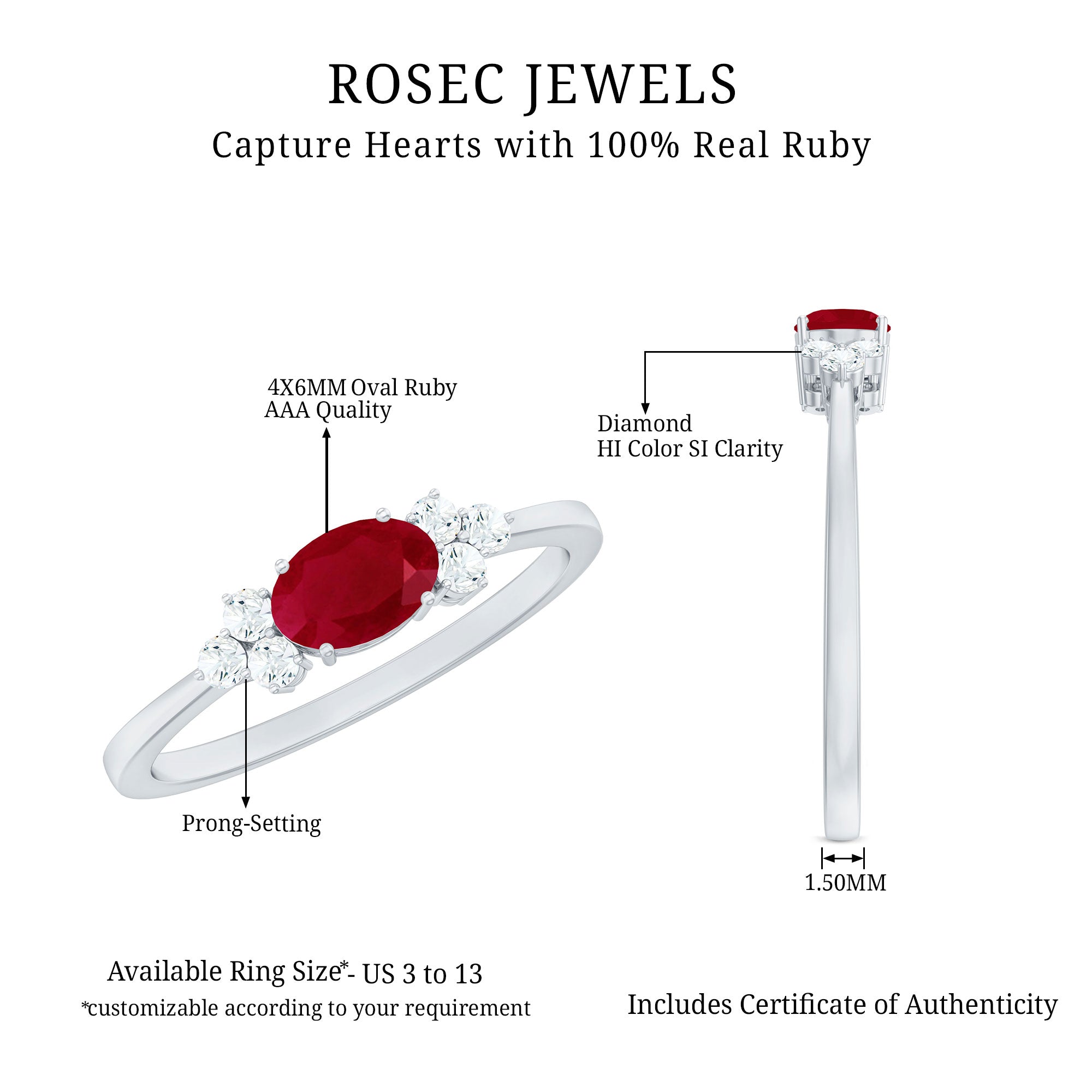 Gift her this gorgeous East West Engagement Ring to show her you care for her forever. Embedded with an Oval Shape Ruby at the center in East West style with Round Shape Diamond trio on each side. This Ruby Engagement Ring will captivate everyones attention.