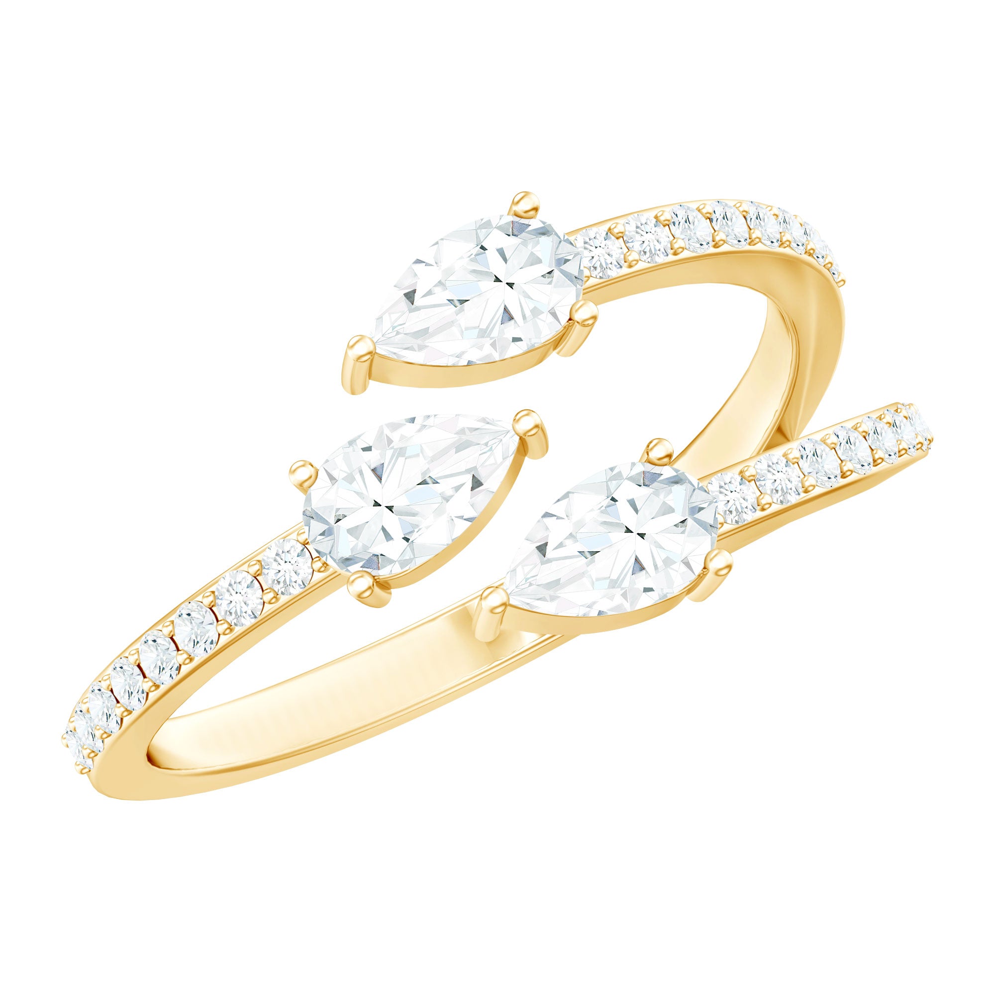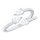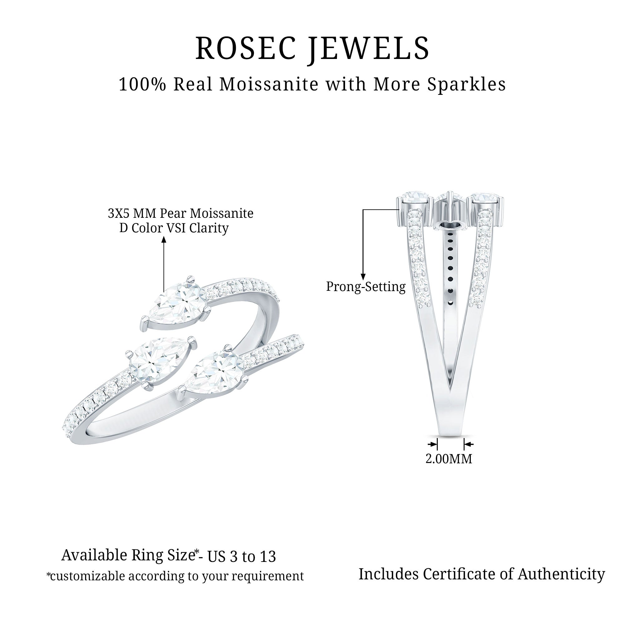 Bold style meets deep meaning in this eye catching Moissanite Wrap Ring, crafted to represent your unconditional love. With its elegant wrap around design, this Open Cuff Ring makes a powerful statement while holding a heartfelt message close. Three stunning 3X5 MM pear shaped moissanite stones sit gracefully at each end of the wrap in east west style, symbolizing the past, present, and the future. Nestled over the bands are round moissanite stones. All three stones are set securely in prong setting, allowing light to reflect beautifully from every angle. The open end style creates a flowing, modern look, adding extra brilliance and depth. The wrap shape gently curves around the finger, offering a bold yet graceful fit that feels both contemporary and meaningful. The symbolism of past, present, and future makes it a truly personal piece. Available in multiple sizes for a comfortable fit, this Moissanite Three Stone Ring is designed to feel as good as it looks. It comes with a certificate of authenticity and is beautifully packaged in a luxury jewelry box, ready for gifting or treasuring for yourself.