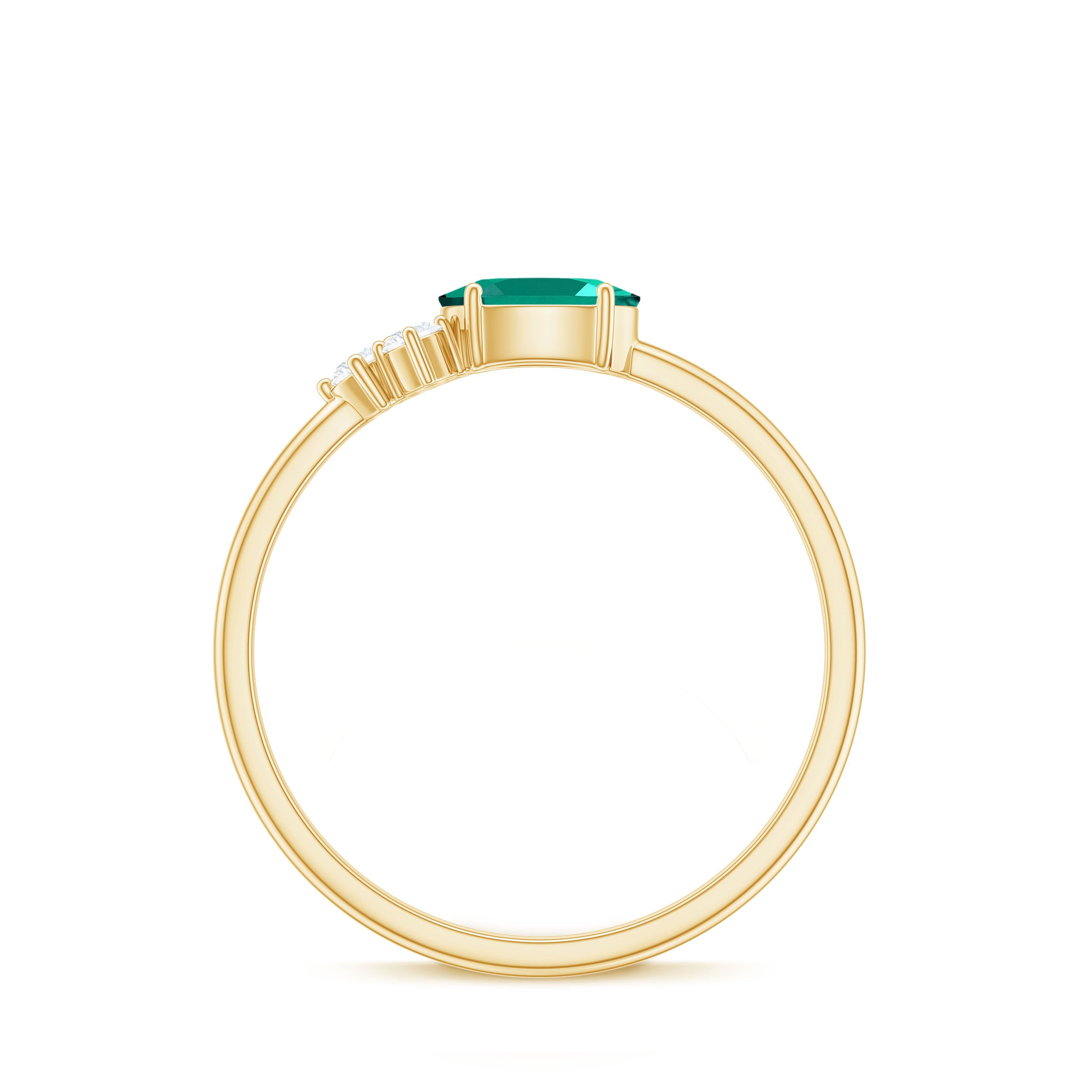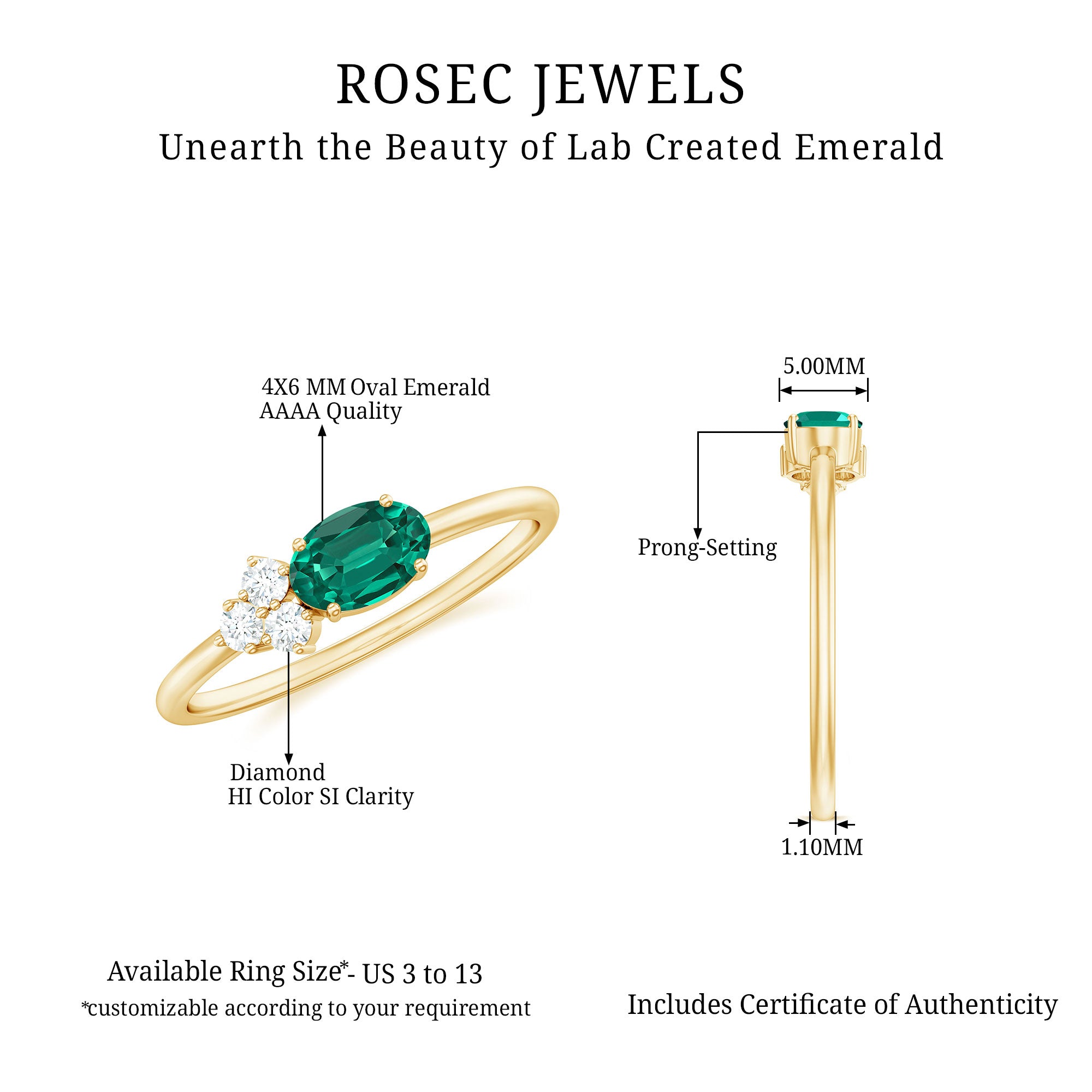 Propose to her with an adorable Promise Ring that symbolizes everlasting love with a twist, just like this Lab Emerald Diamond Ring. Featuring a horizontally set 4X6 mm Oval Shape Lab Created Emerald set in Prong Setting, this East West Ring breaks away from tradition to showcase a fresh and modern design. The rich green Lab Emerald symbolizes balance, growth and everlasting love, while the unique East West style adds a contemporary edge that makes a statement. On one side of the Lab Emerald, a trio of dazzling Diamond stones sparkles subtly, that enhances the brilliance of the center stone and adding refined elegance. The sleek band keeps the focus on the striking combination of AAAA Quality Lab Emerald and HI-SI Diamond stones, perfect for someone who loves bold yet graceful style. Designed for beauty, this Lab Emerald Diamond Ring brings together a Certified Lab Grown Emerald and Natural Diamond stones, that offer a lasting shine and significance. This Lab Emerald Proposal Ring is available in various ring sizes to ensure the ideal fit. Presented in an elegant Jewelry Box, this Oval Emerald Ring is a symbol of your unique love story, thoughtfully designed to celebrate individuality, passion and a bright future together.
