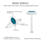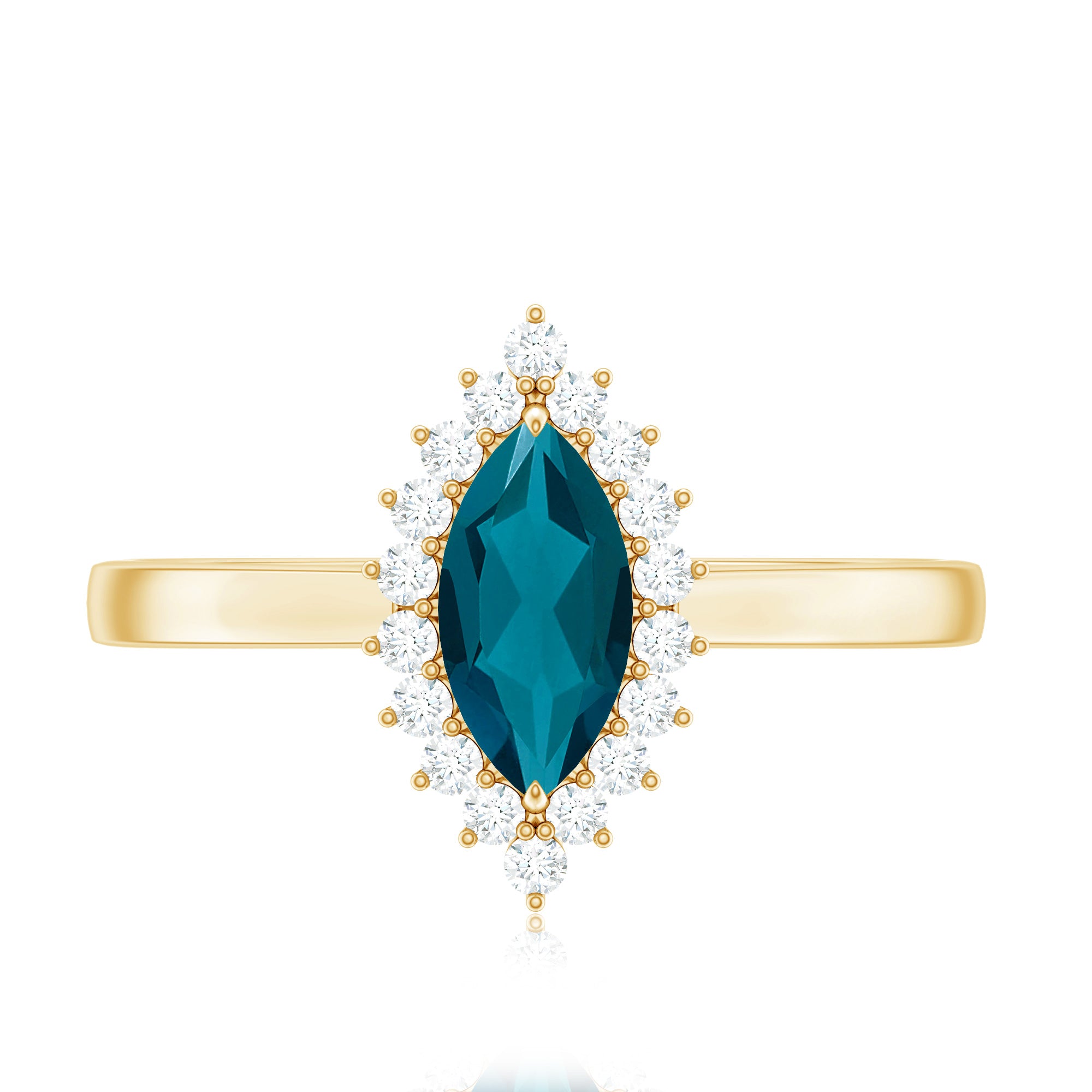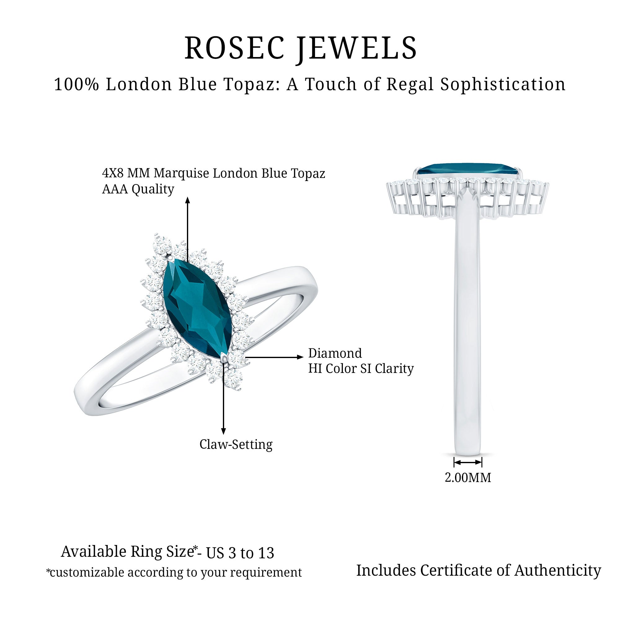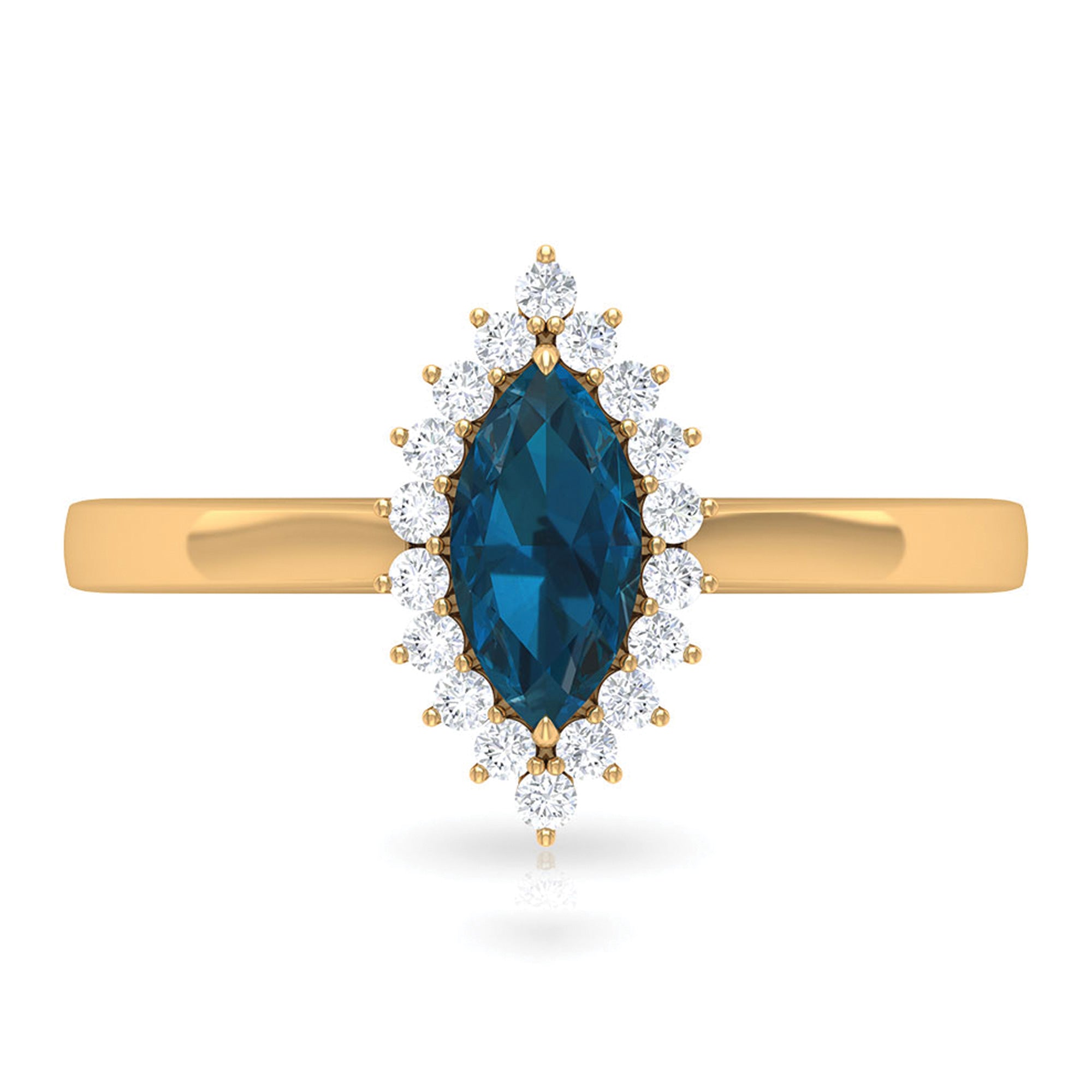 Give your hand a whole new look with this elegant London Blue Topaz Engagement Ring. Designed to reflect timeless beauty, it is a perfect choice for someone who loves a mix of classic and modern style. The center of the Halo Engagement Ring features a stunning 4X8 MM marquise cut London Blue Topaz, carefully set in secure prong setting. Surrounding the topaz is a delicate halo of round cut diamonds, also set in prongs, creating a soft sparkle that highlights the center gem beautifully. Made with AAA quality London Blue Topaz and HI-SI quality diamonds, every detail of this Marquise Engagement Ring is crafted to offer lasting beauty and brilliance. Whether it is an engagement, anniversary, or another special occasion, this Blue Topaz and Diamond Ring is a meaningful and stylish way to mark the moment. Its sleek design also allows it to pair well with other rings or stand out beautifully on its own. The Marquise Blue Topaz Ring comes in a lovely jewelry box, making it ready for gifting. It also includes a certificate of authenticity, ensuring the quality and value of your purchase.