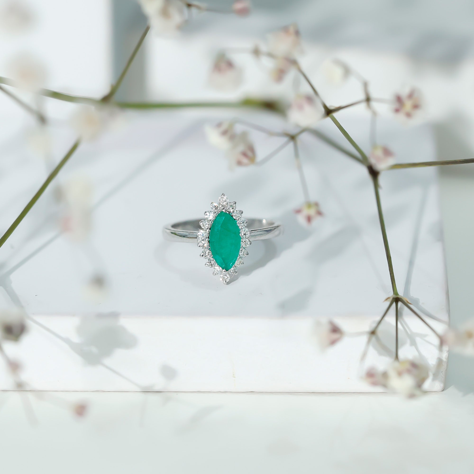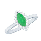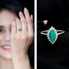 Elongated Marquise Cut Emerald Engagement Ring with Diamond Halo
