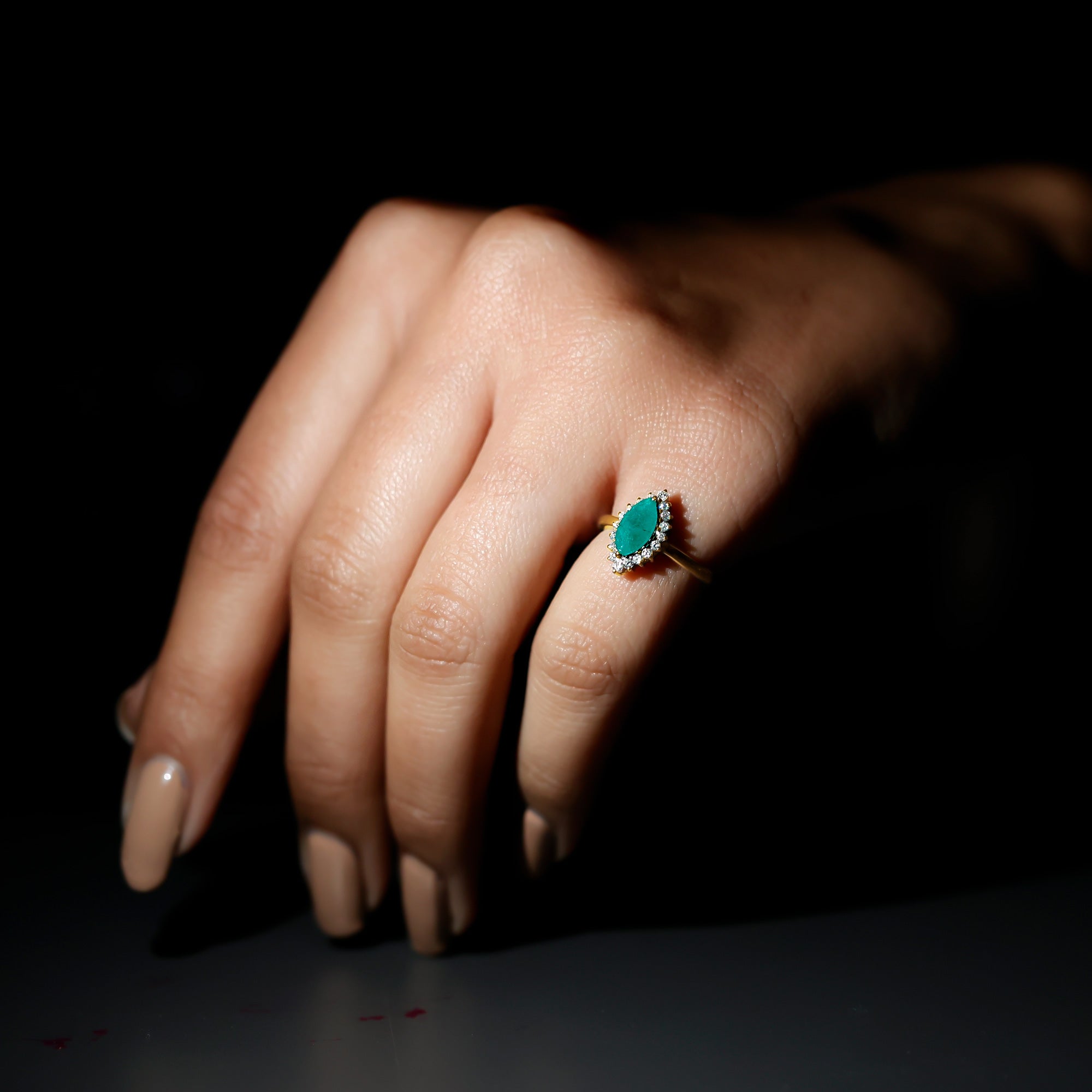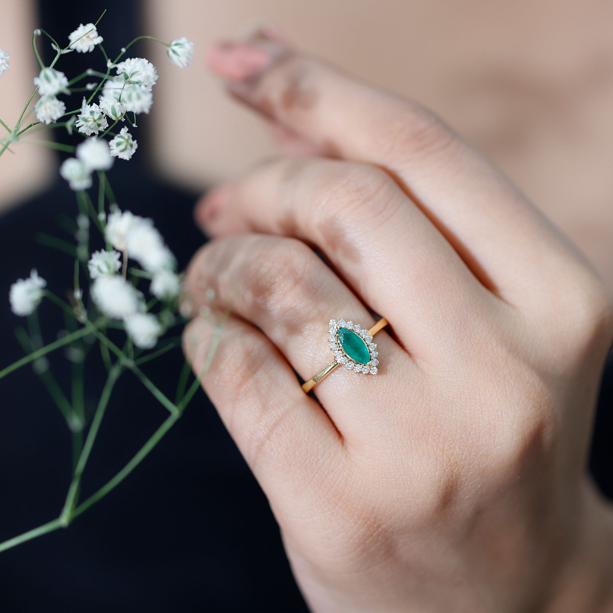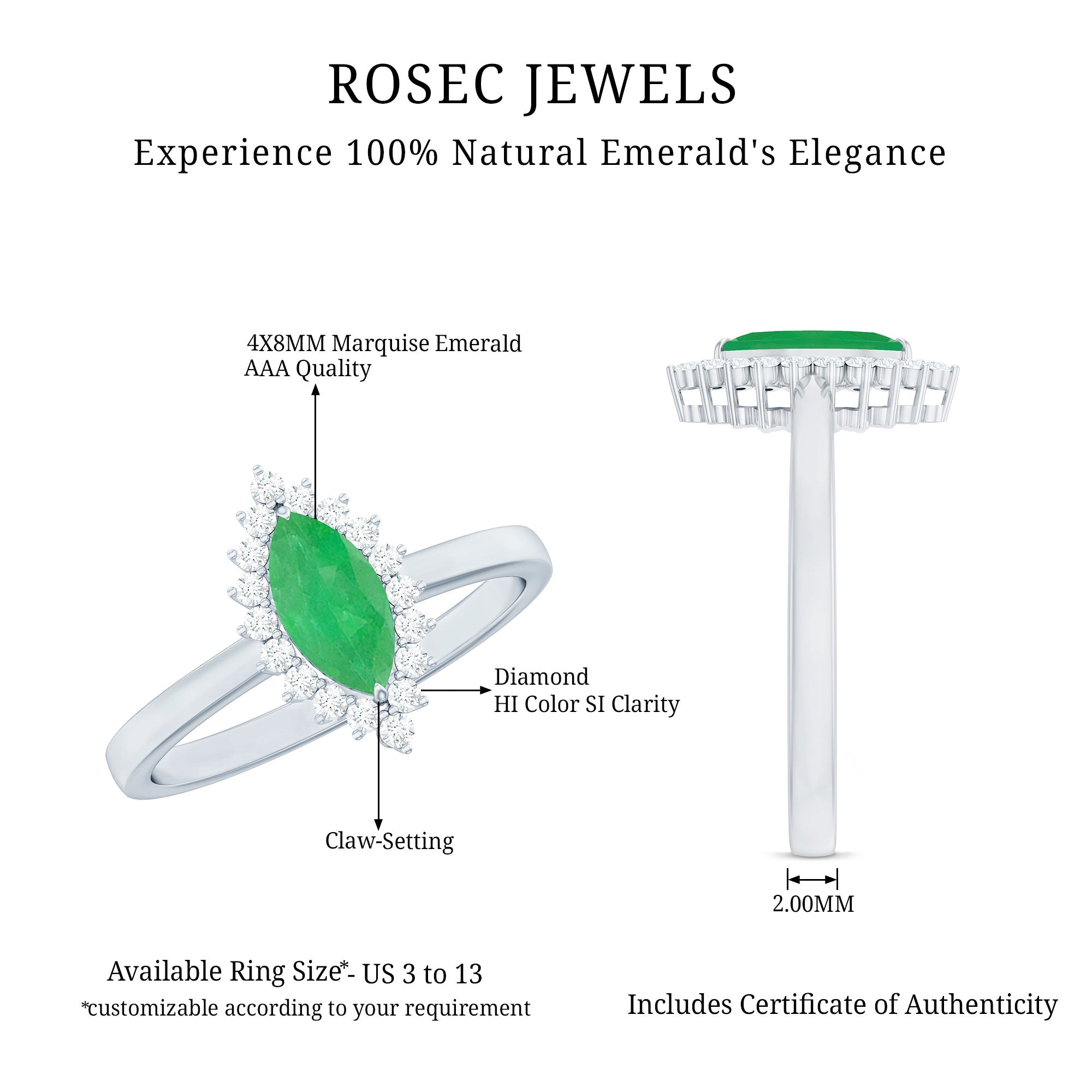 Show your lady love how much she means to you with our beautiful Emerald Engagement Ring on her special day. Its simple yet elegant design perfectly showcases the central gemstone. This classic Marquise Engagement Ring features a AAA quality 4X8 MM marquise cut emerald, ensuring the brilliance and fire that represent love and commitment. Surrounded by a halo of round Diamond stones that add extra shine and enhance the size of the main gem. The halo creates a stunning and eye-catching look, reflecting your unique style and personality. This Marquise Halo Engagement Ring presents a timeless and brilliant shape with perfect curves that draw all eyes. It blends traditional beauty with a modern touch, offering an elegant appearance that shines with remarkable brilliance. This Marquise Emerald Ring comes in various sizes, guaranteeing a perfect fit that feels tailor-made just for you. Every aspect of this Emerald and Diamond Ring showcases precision, passion, and a hint of magic that only true craftsmanship can provide. Let your fingers share your story and let your love shine with a brilliance as unique as your bond.