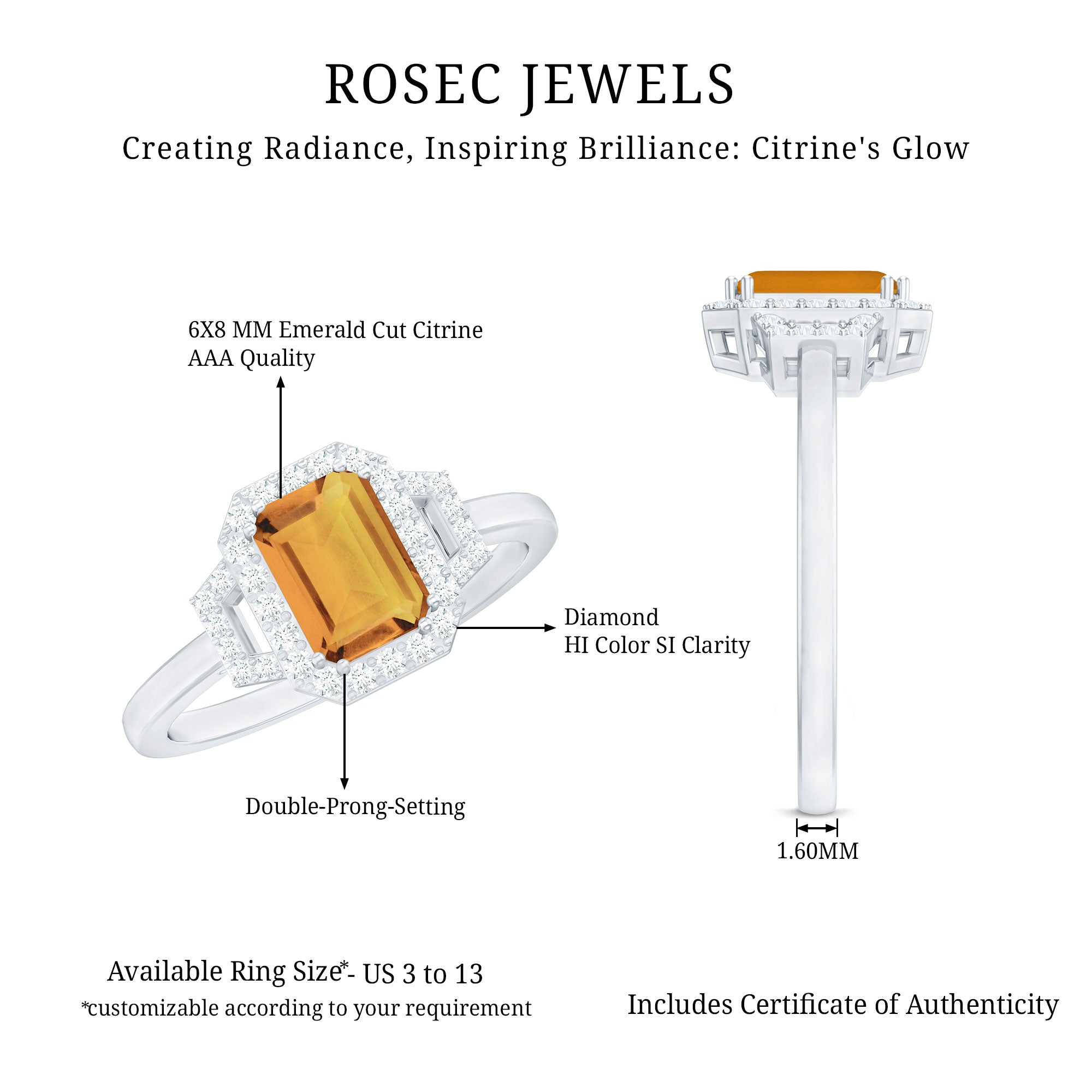 Make a bold statement with this magnificent engagement ring, featuring a stunning Emerald Cut-cut Citrine centerpiece, encircled by a sparkling halo of round Diamond stones. Crafted with high-quality gold, this Citrine ring is designed to last a lifetime. The striking yellow of the Citrine is beautifully complemented by the brilliance of the Diamond stones. With its unique and eye-catching design, this ring is the perfect symbol of your love and commitment to your significant other. Its a truly exceptional piece that will leave your loved one speechless.