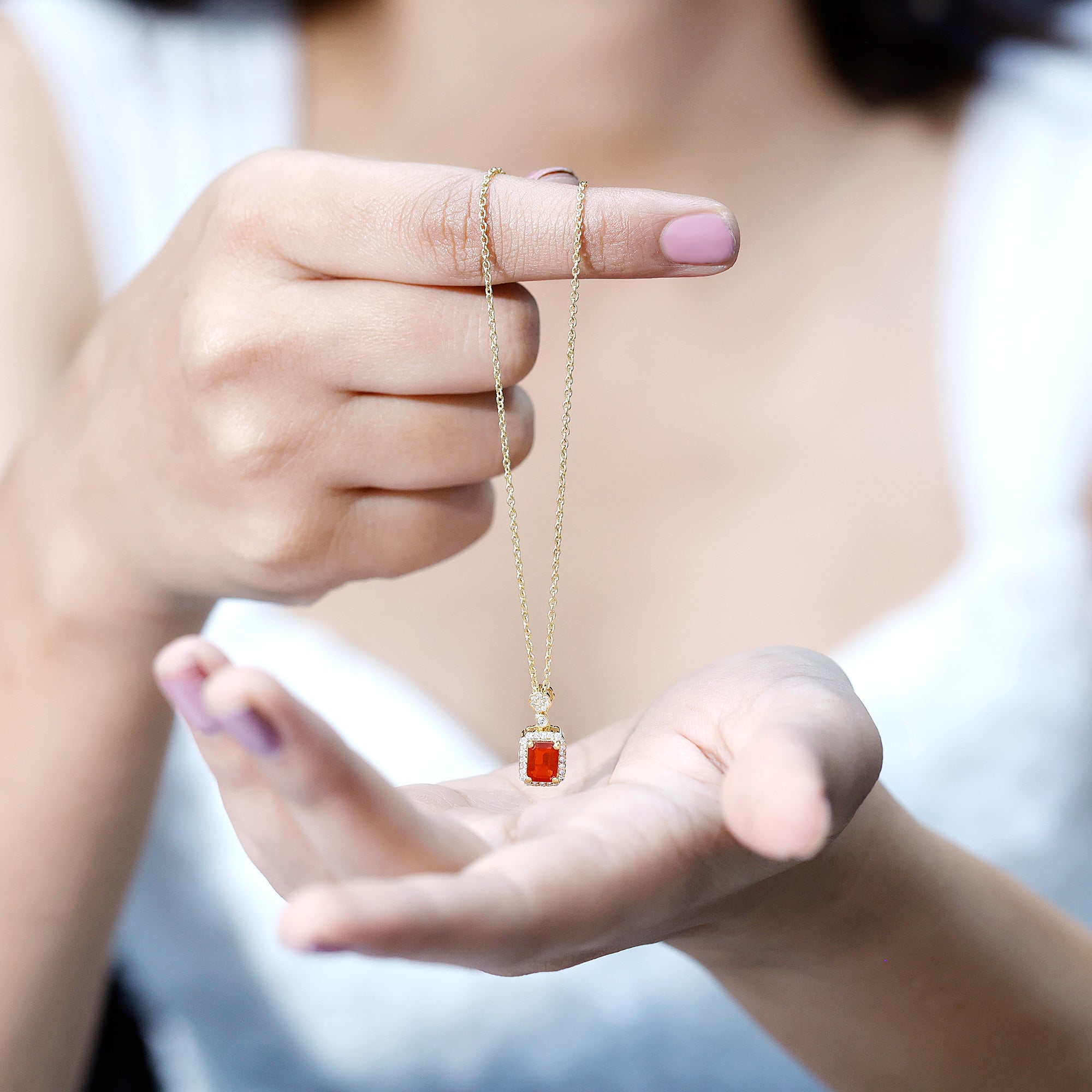 Turn up the heat on your style with this radiant Fire Opal Necklace, designed to brighten every occasion with its fiery charm. Handcrafted in yellow gold plated silver, this Vintage Art Deco Necklace features a captivating 5X7 MM emerald cut Fire Opal in prong setting. Surrounding the center stone is a shimmering halo of lab grown diamonds, adding a layer of brilliance that enhances the richness of the opal. Above the halo, a delicate flower motif adorned with sparkling round lab diamonds brings a soft, feminine touch to this bold design. The combination of AAA quality Fire Opal and EF-VS quality lab grown diamonds offers exceptional color, clarity, and sparkle, a match made in gemstone heaven. Suspended from a sleek chain, this Opal Bridal Necklace sits beautifully on the neckline, catching the light and admiration with every move. As the October birthstone, Fire Opal also makes a thoughtful gift for birthdays, anniversaries, or any special milestone. Delivered in a signature jewelry box, this Fire Opal and Diamond Necklace is ready to be treasured, a glowing symbol of beauty, strength, and individuality.