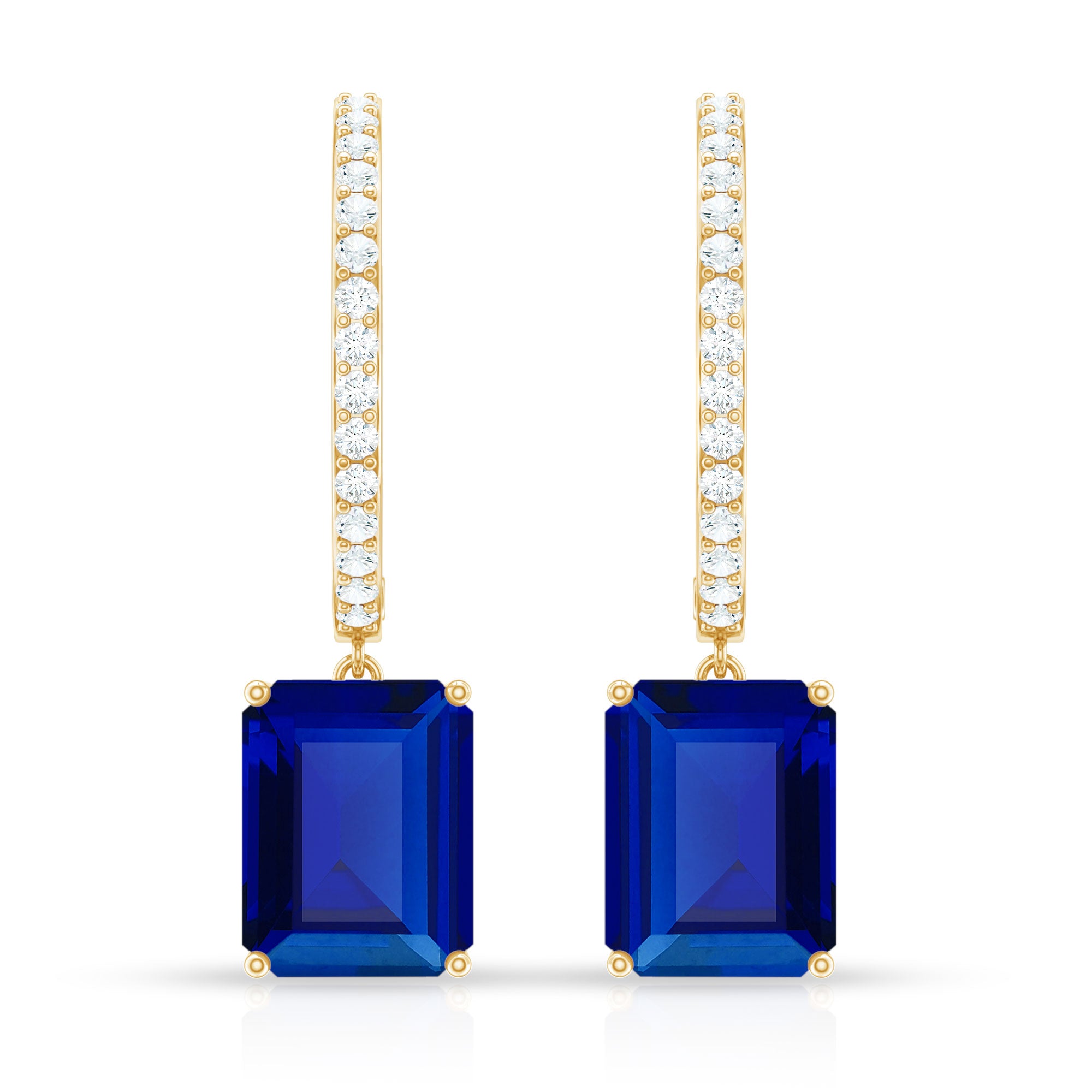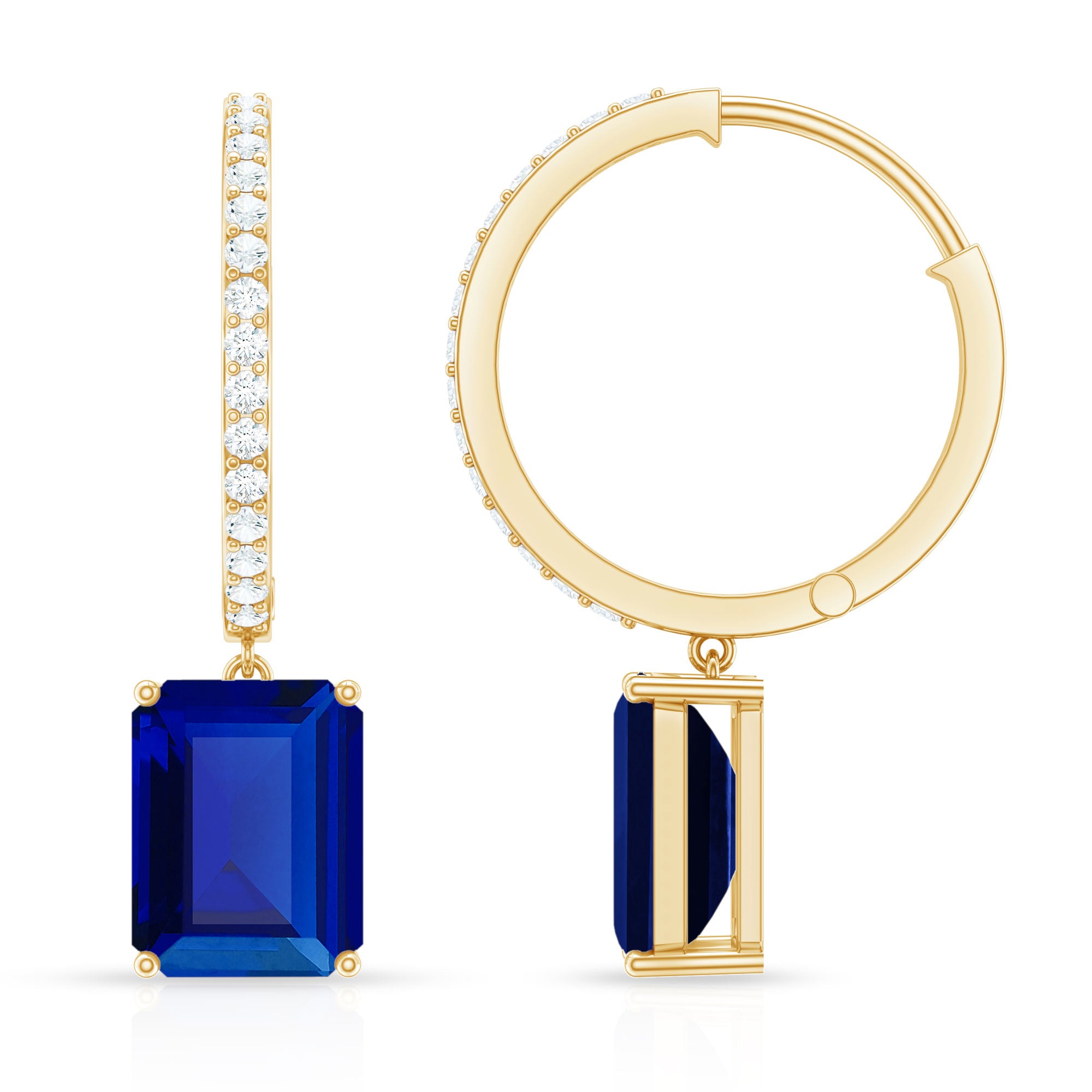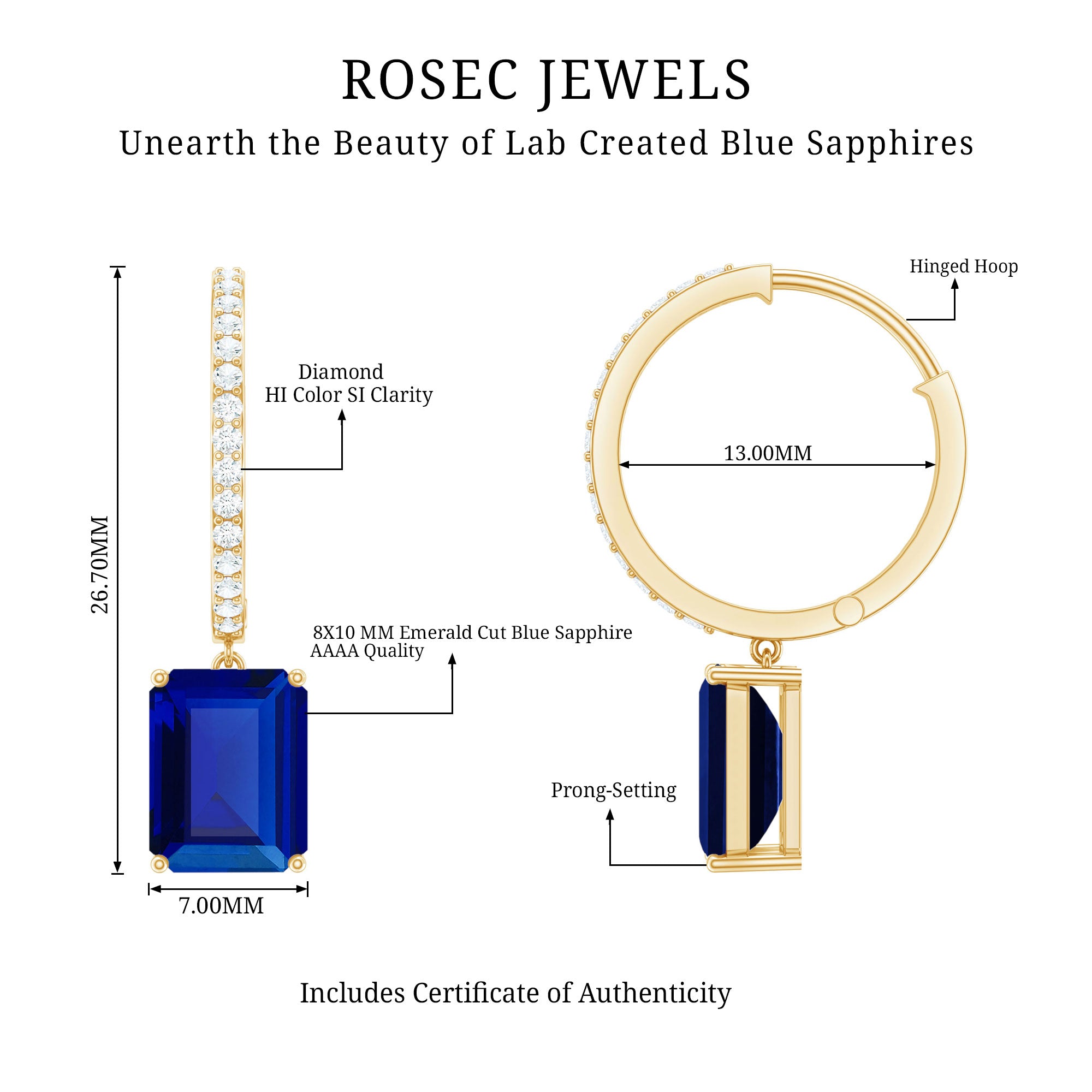 Showcasing a unique style and passion, these Lab Grown Blue Sapphire Earrings celebrate timeless beauty and modern elegance. Enhancing any outfit, these Hoop Drop Earrings feature an 8X10 MM Emerald Cut Lab Grown Blue Sapphire in Prong Setting as a drop. To highlight the hoop, Round Shape Diamonds beautifully adorn these Hinged Hoop Earrings. The Emerald Cut Drop Earrings take center stage and catch everyones eye, representing refined style and effortlessly merging timeless charm with a modern hoop design, ideal for making a striking impression on any occasion. As a blend of vibrant color and stunning sparkle, these Blue Sapphire and Diamond Earrings draw attention by offering a contemporary twist on classic glamour. They truly captivate onlookers, making them perfect for special events or a bridal appearance. These Sapphire Hoop Earrings embody elegance, sophistication, and unmatched beauty, capturing attention with their deep blue hue of AAAA Quality Lab Grown Sapphire and HI-SI Quality Diamond.