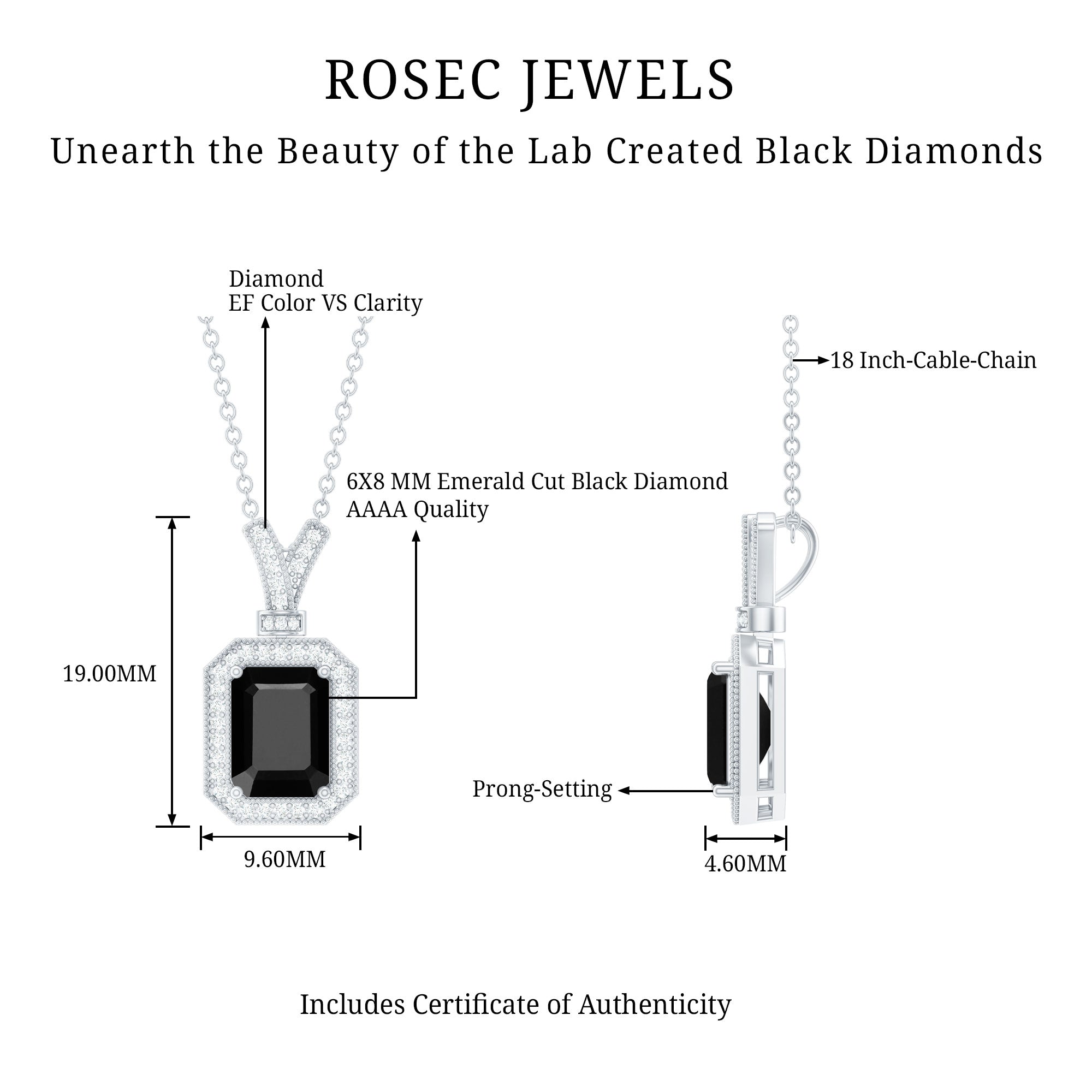 Meticulously crafted, this lab grown Black and White Diamond Necklace epitomizes timeless elegance. The 6x8 mm Emerald Cut Black Diamond takes center stage, exuding sophistication and allure. Encircled by a dazzling Halo of round shaped White Diamond gemstones and Beaded Detailing the Halo Pendant exudes luxury and modernity. This Black Diamond Pendant Necklace (Unnatural) is a testament with Aaaa Quality Black Diamond and Ef-Vs Quality Diamond which reflects the essence of Rosec Jewels dedication to both style and conscience.