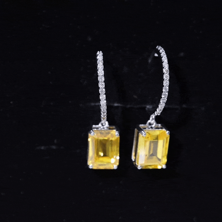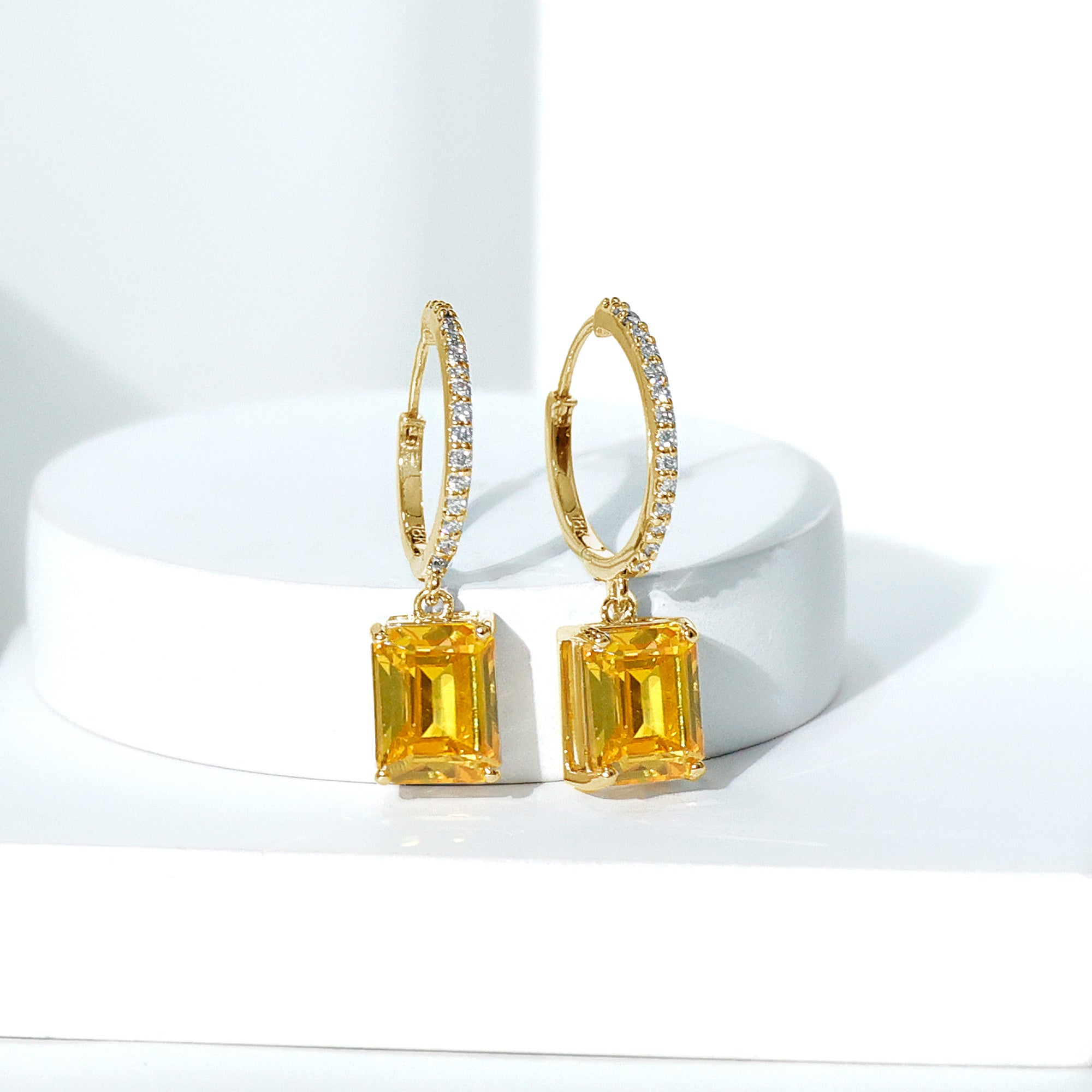 These exquisite hoop drop earrings showcase a central emerald cut Created Yellow Sapphire, encircled by Diamond gems. Their simple hinged hoop design adds a touch of elegance, suitable for both special occasions and everyday wear. Crafted with high quality materials, these created sapphire earrings guarantee durability and longevity. Their comfort and ease of wear make them an excellent choice for those who like to make a statement with their jewelry.