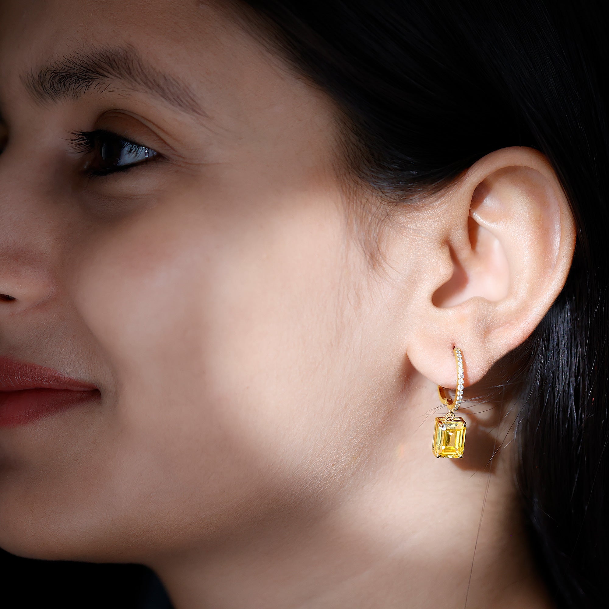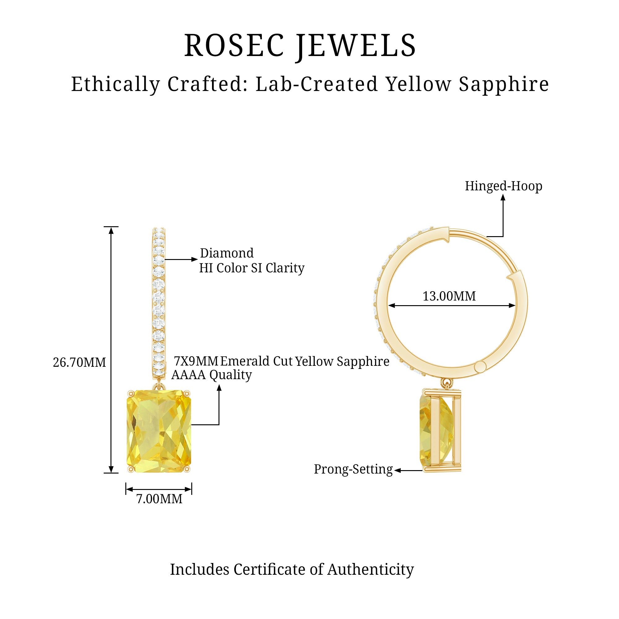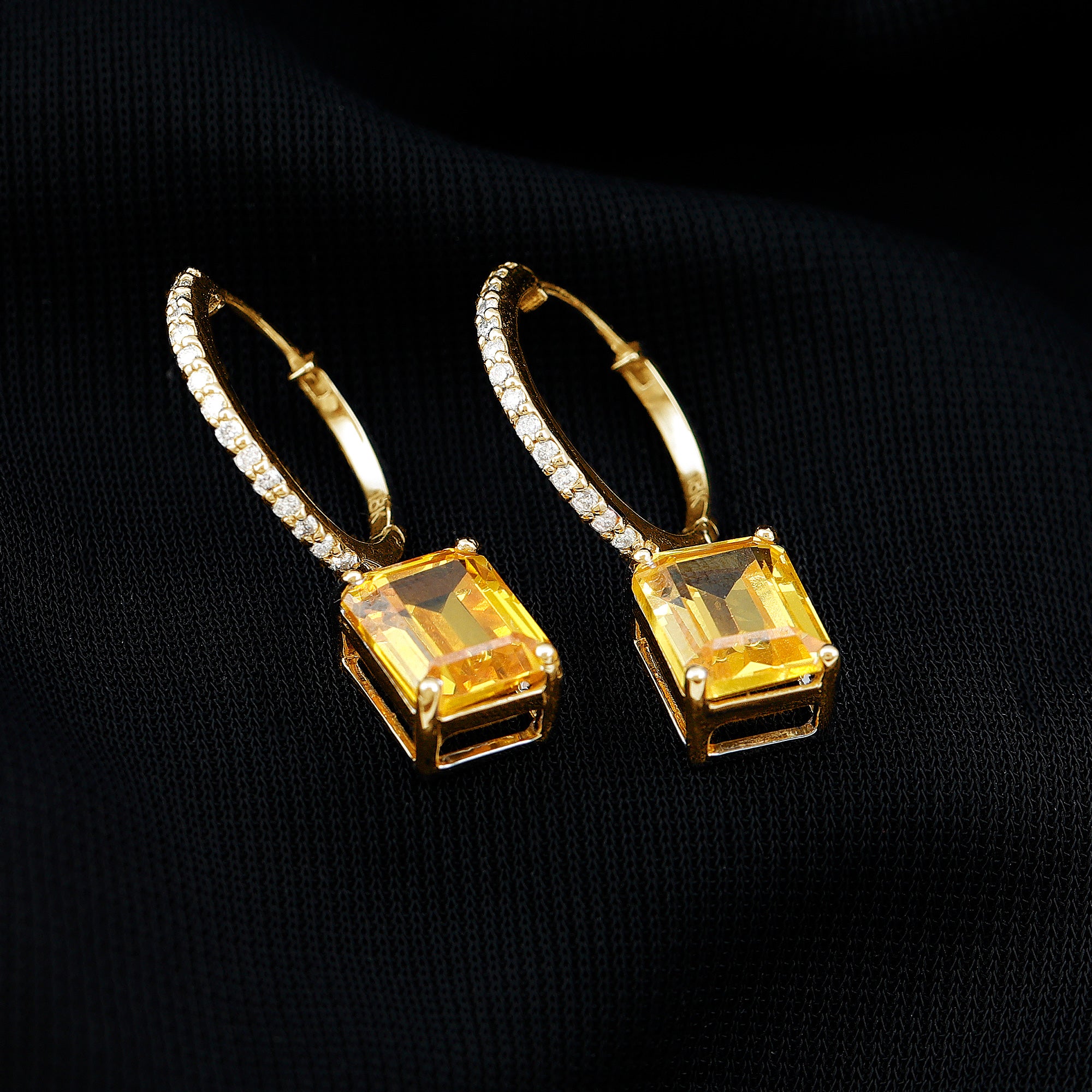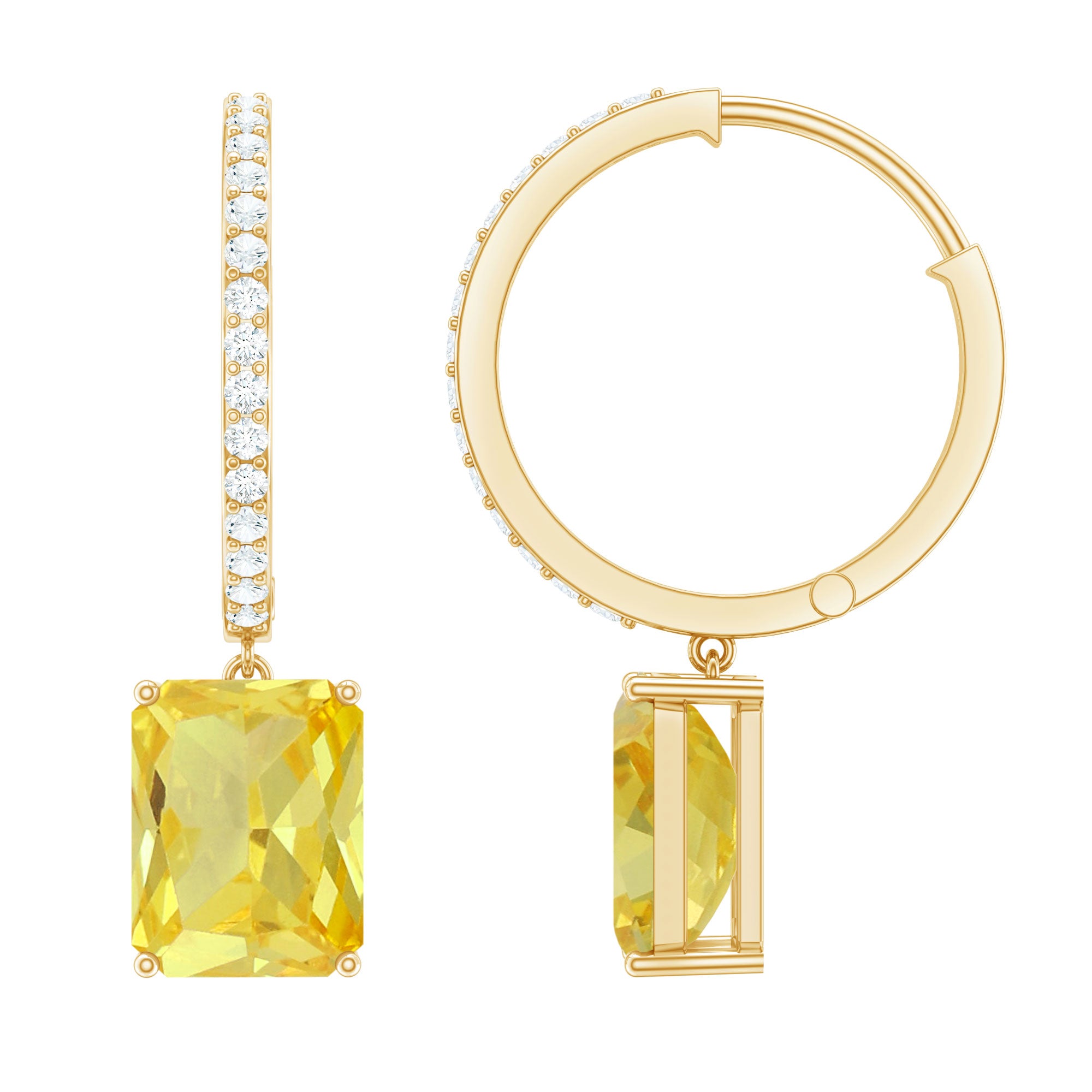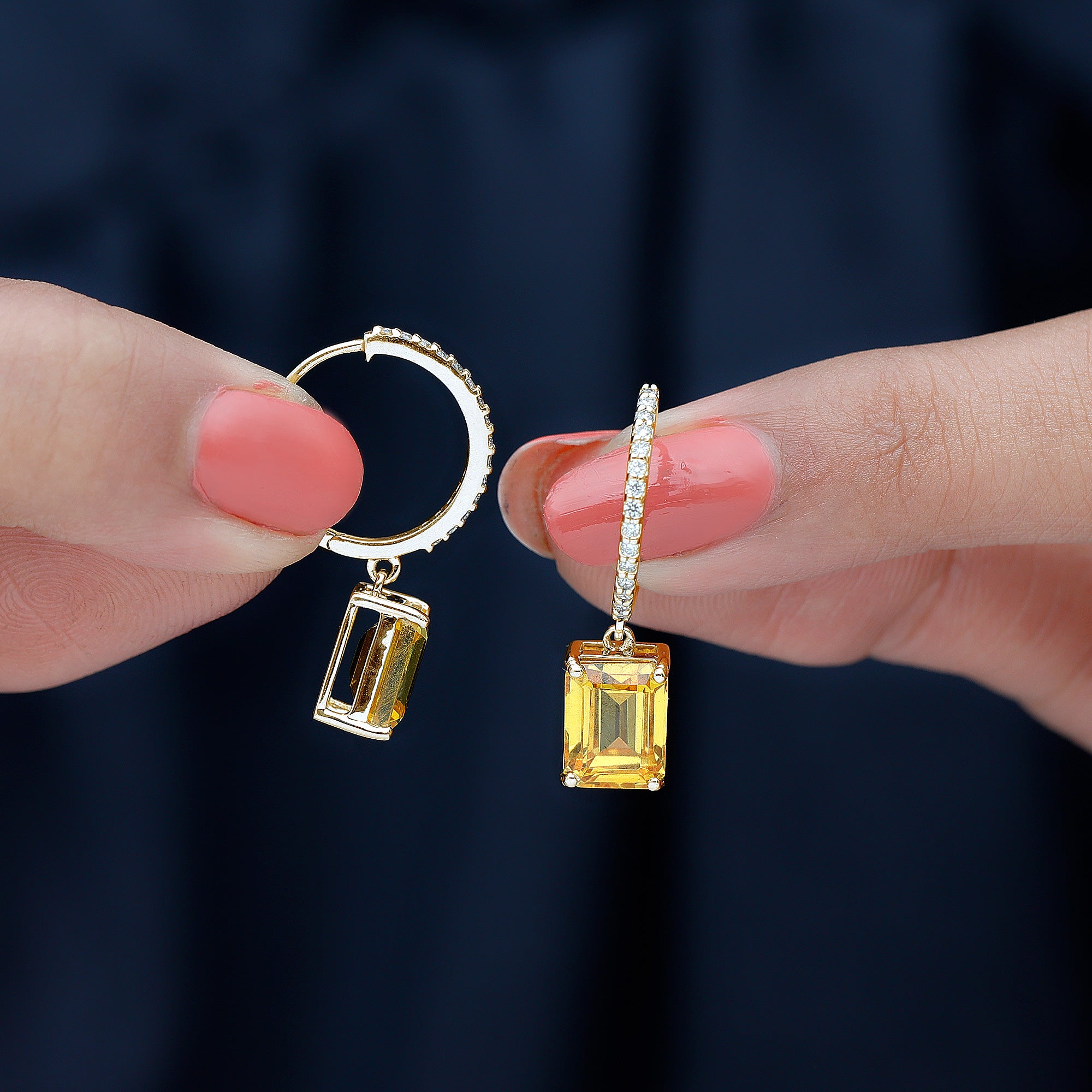 Emerald Cut Lab Grown Yellow Sapphire Minimal Hoop Drop Earrings with Diamond