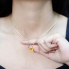 Radiating the warmth and brilliance of a golden sunrise, this stunning Solitaire Pendant Necklace centers around a captivating 6X8 MM emerald cut lab created yellow sapphire. Above the yellow sapphire sits a delicate round lab grown diamond, dainty yet full of sparkle, providing a soft accent that complements the boldness of the center stone without overshadowing it. This thoughtful pairing of stones brings harmony to the design - bright, radiant, and effortlessly chic. The Lab Grown Yellow Sapphire Necklace is suspended from a rabbit ear bail, which not only adds a graceful, flowing silhouette to the piece but also offers a secure and stylish connection to the chain. Crafted in 14K yellow gold plated silver, the warm metal beautifully complements the golden tones of the sapphire while offering lasting durability and a polished, luxurious finish. The piece is gracefully hung from a matching cable chain that provides just the right balance of delicacy and strength, ensuring the Emerald Cut Pendant remains the centerpiece. Handcrafted with care and artistry, this Sapphire and Diamond Necklace is a modern expression of sophistication and warmth, perfect for marking special occasions or brightening everyday style with a touch of sunlit elegance.