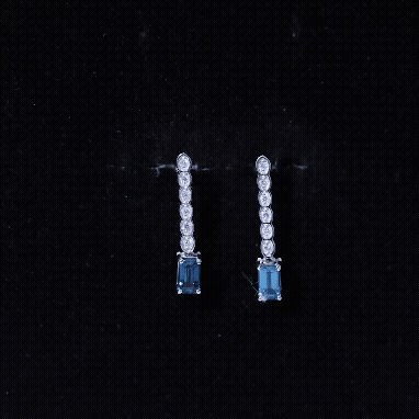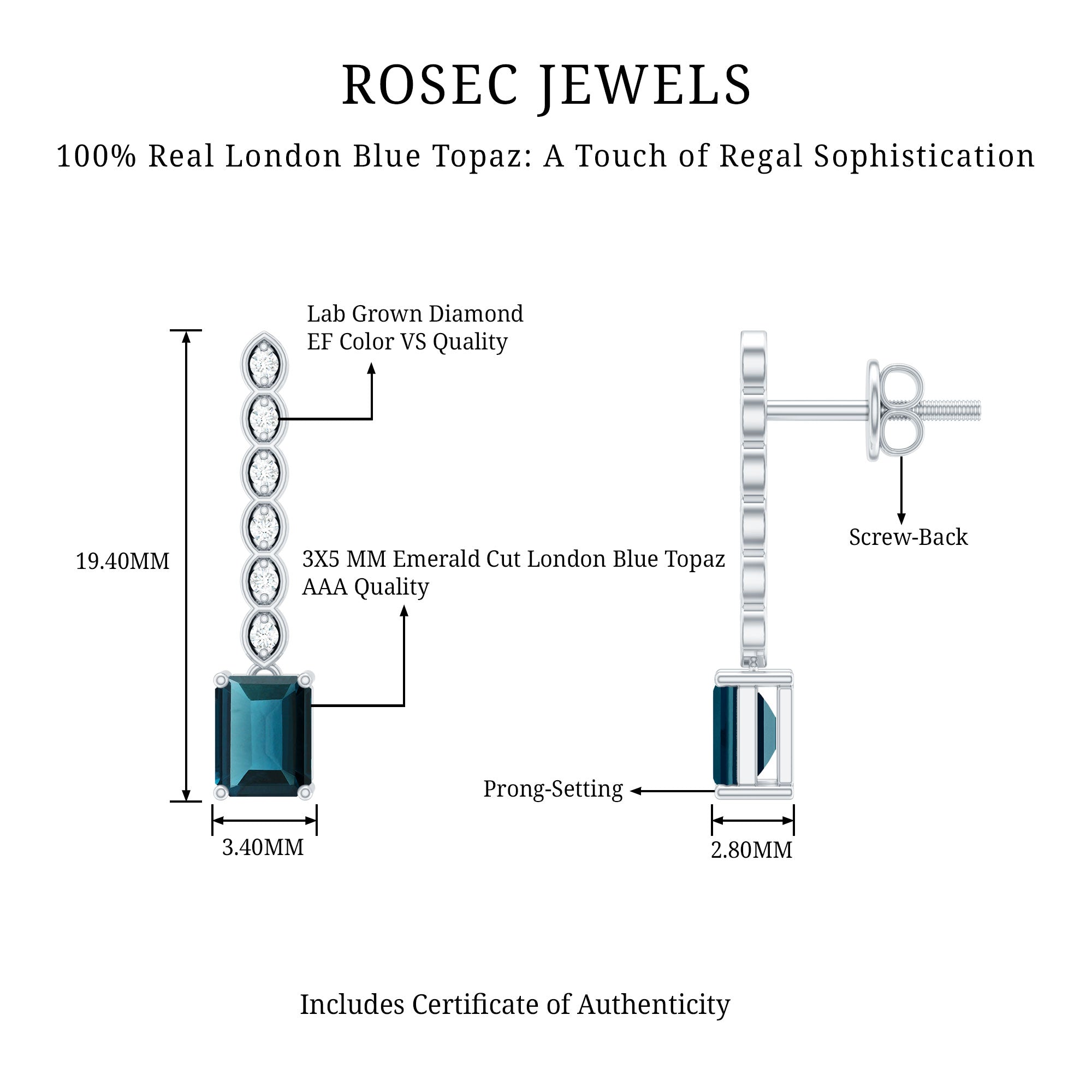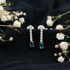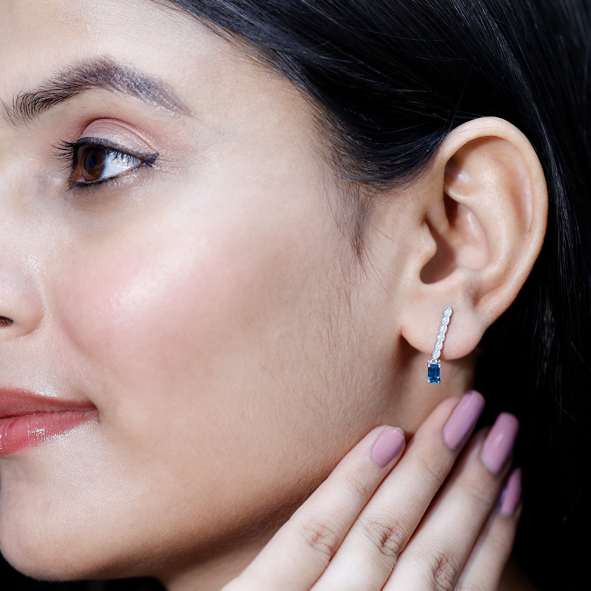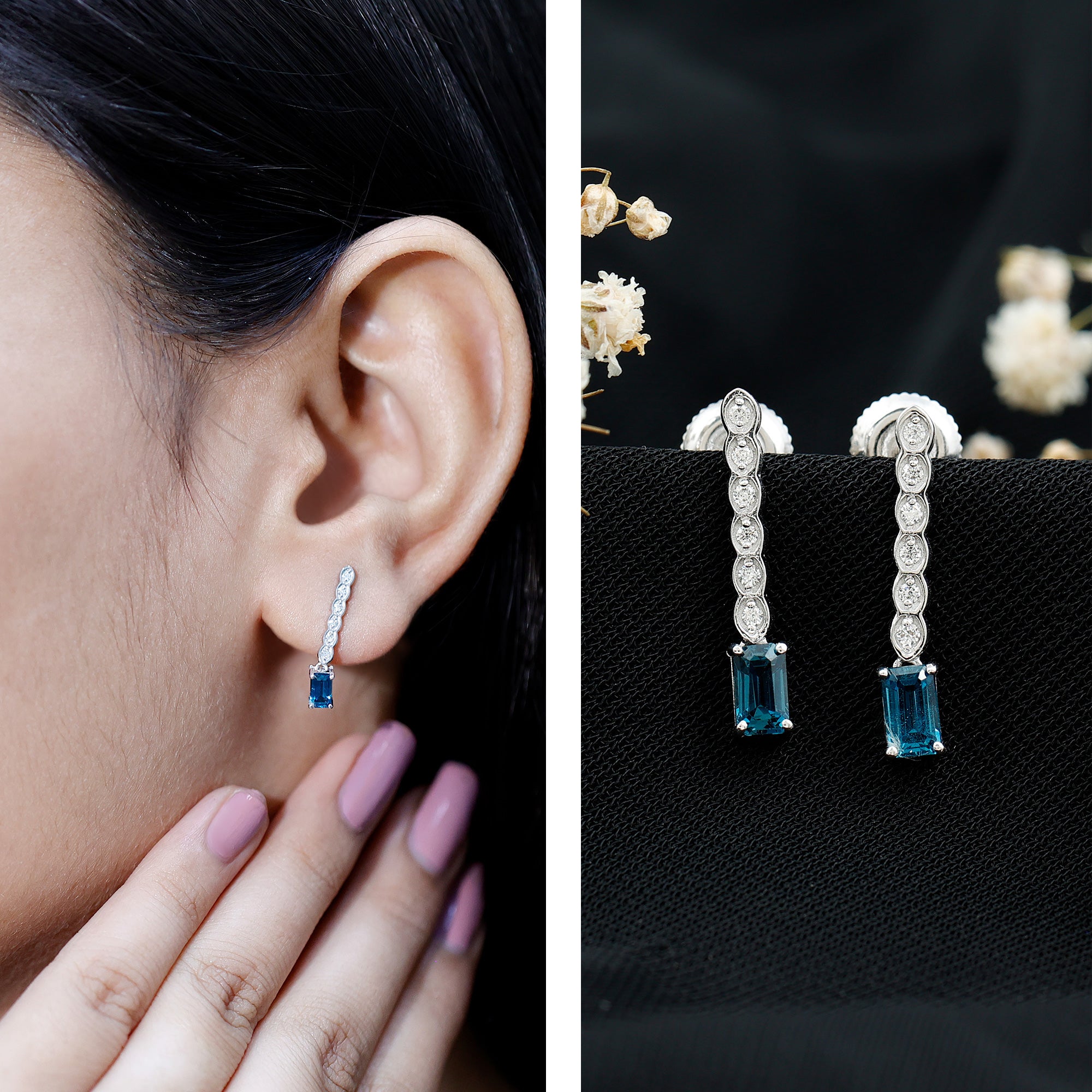 Let your look flow effortlessly with every step in these stunning London Blue Topaz Dangle Earrings. Designed with just the right balance of elegance and simplicity, this pair adds a graceful charm that works for both everyday wear and special moments. Handcrafted in 14k white gold plated silver, each earring begins with a sleek, polished vertical bar that features a delicate line of round brilliant cut lab grown diamond stones. These sparkling accents add a subtle shimmer, perfectly complementing the elegant drop that follows. Hanging gently from the base of the bar is a beautifully cut 3X5 MM emerald cut London Blue Topaz, held securely in prong setting that lets the stone move with you, catching light from every angle. Whether you are stepping into a meeting or out for a special night, these Dangle Drop Earrings offer the kind of polish that feels effortless. Screw back closures ensure a snug and secure fit, giving you peace of mind so you can wear them all day without worry. Lightweight yet full of presence, these Topaz Drop Earrings are easy on the ears while being high on style.