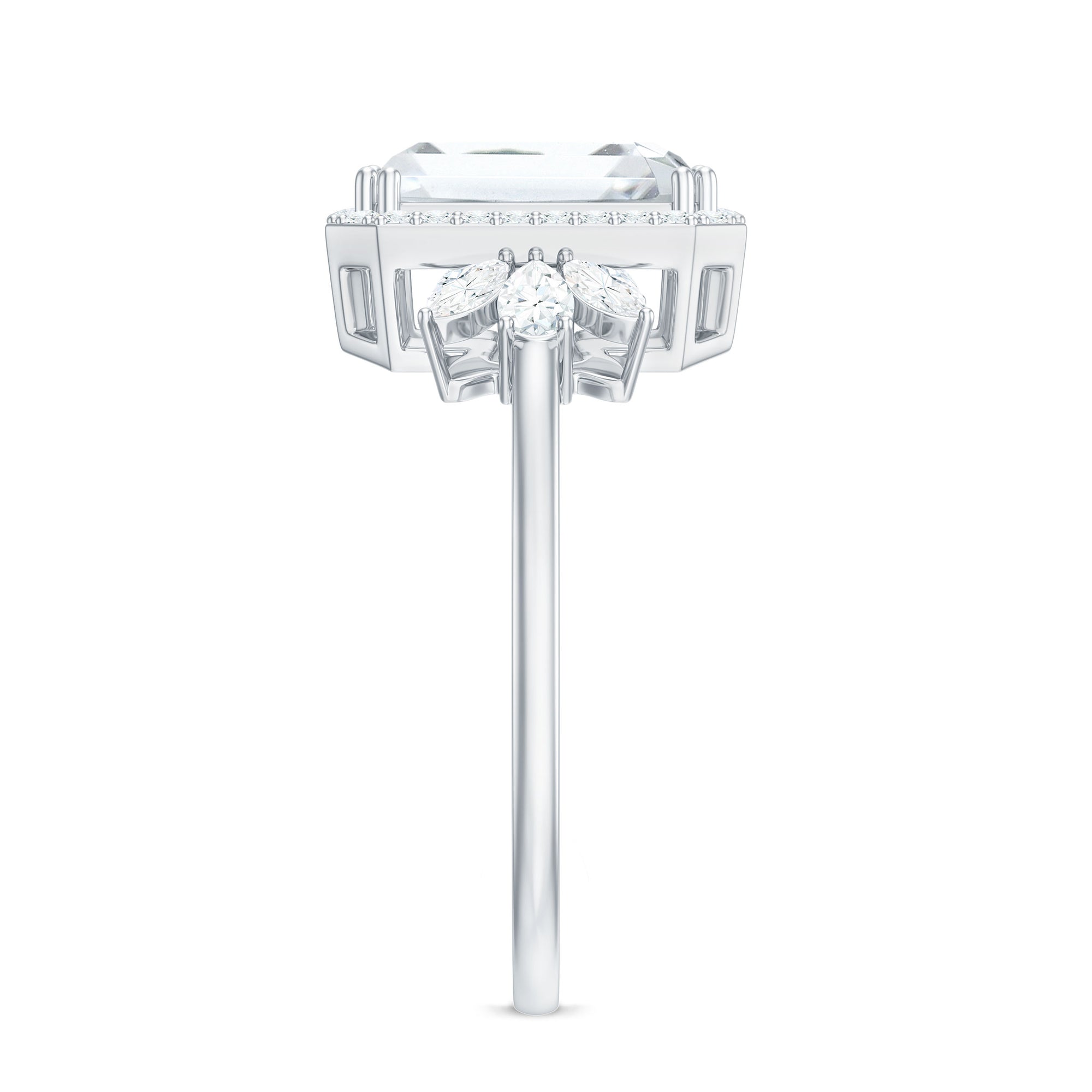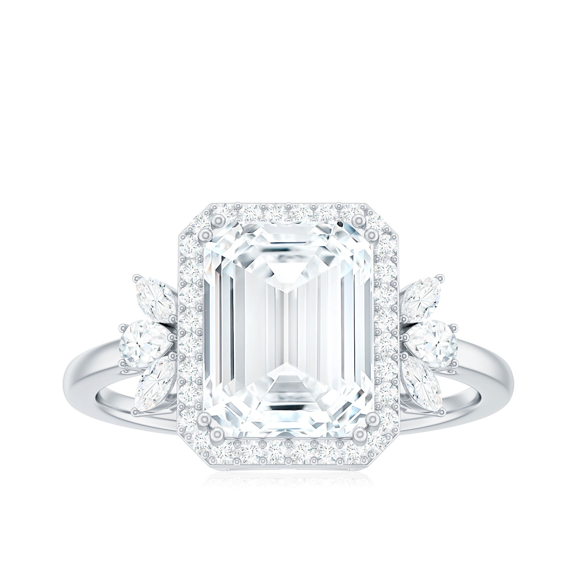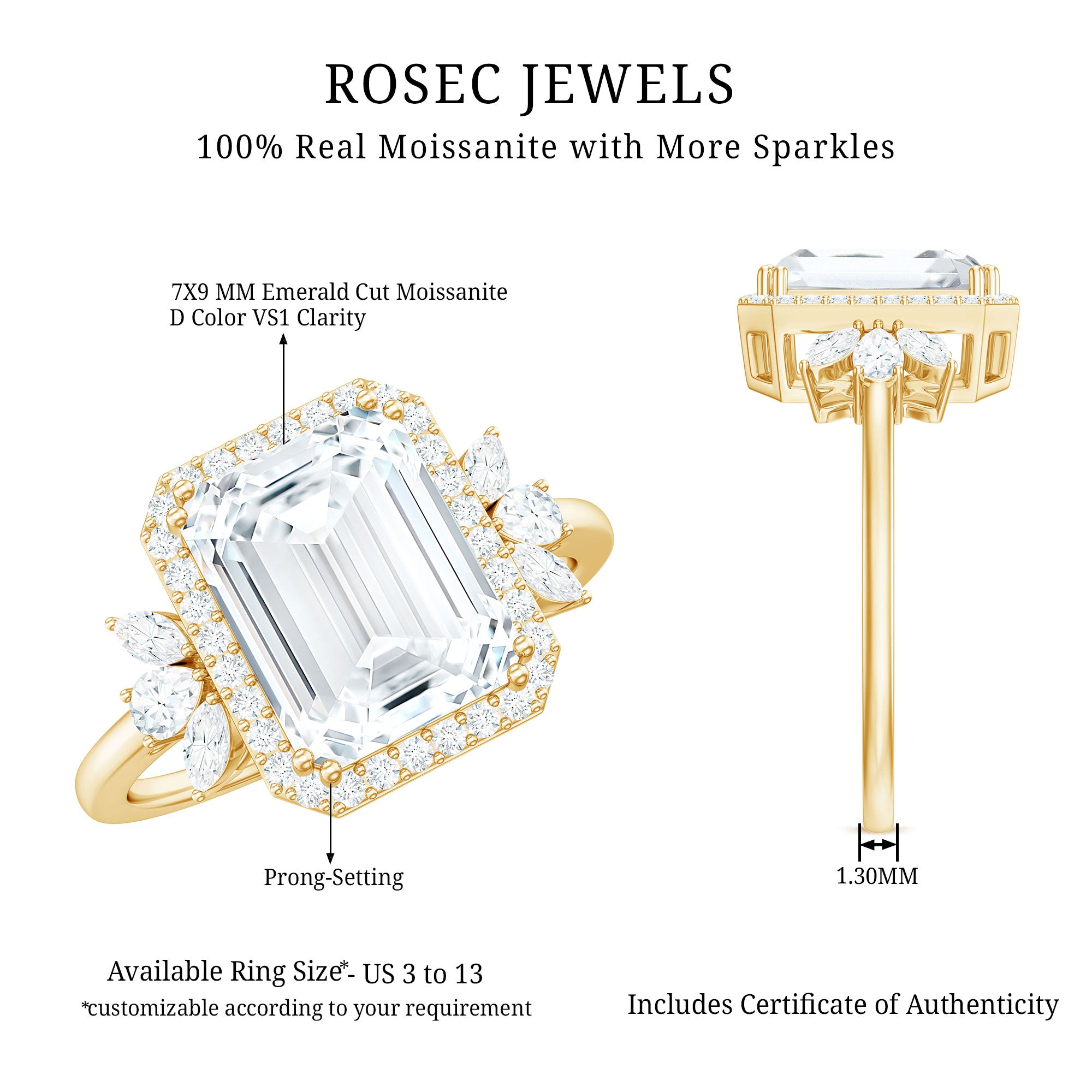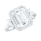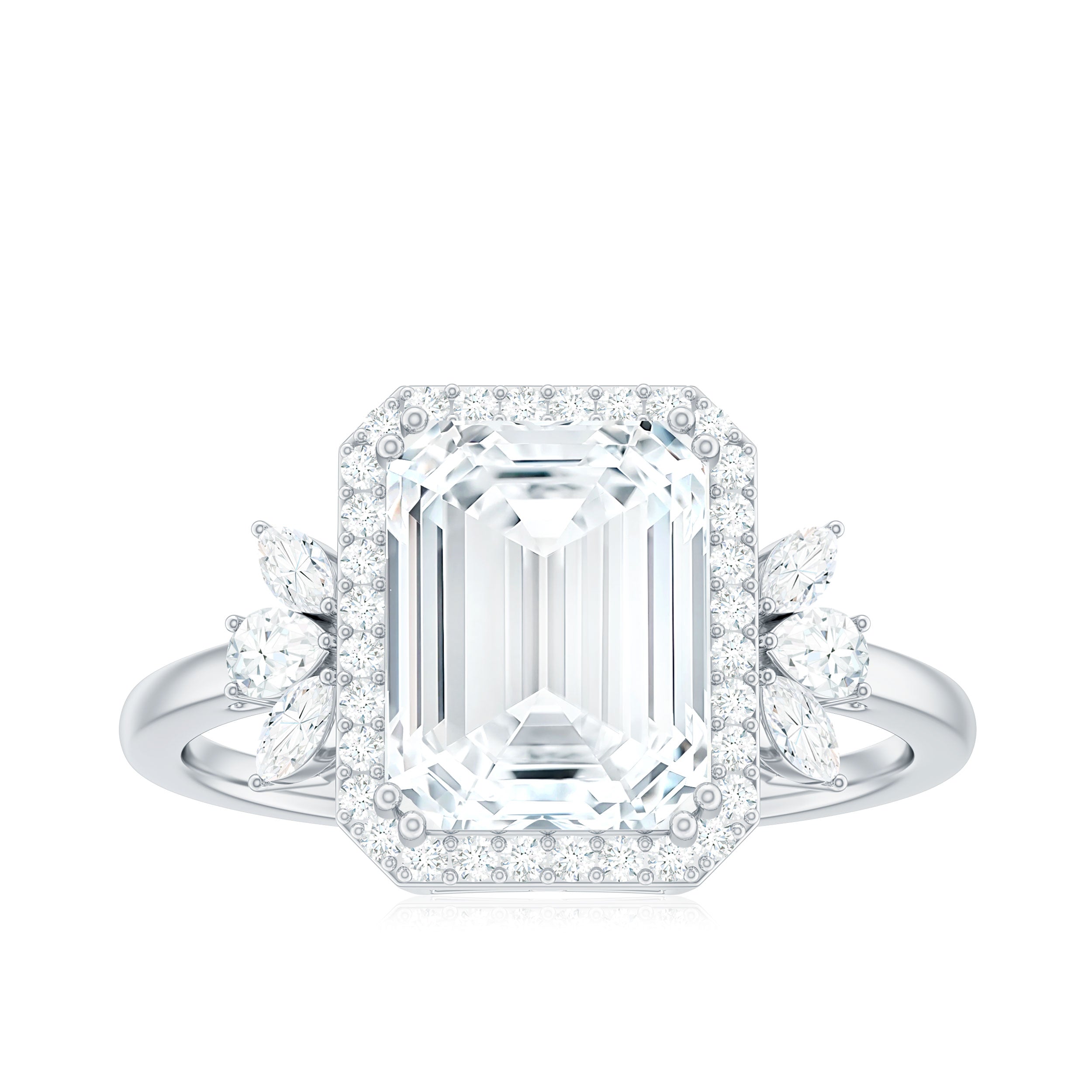 Captivate your forever moment with this dazzling moissanite halo engagement ring, a timeless treasure in moissanite ring. Celebrate your love story with this emerald cut moissanite ring, featuring a 7X9 MM certified D-VS1 quality center stone that radiates sophistication. The emerald cut solitaire ring is framed by a brilliant round moissanite halo, adding dramatic sparkle and enhancing the clean lines of the octagon cut center. Each side is gracefully accented with a trio of pear and marquise cut moissanite stones, forming a floral-inspired detail that exudes elegance and feminine charm. With a proper total carat weight of 3.228 ctw, this moissanite engagement ring is securely held in a classic prong setting, ensuring maximum brilliance with lasting durability. Whether youre searching for a halo engagement rings emerald cut or a modern yet classic solitaire engagement ring, this piece is the perfect expression of everlasting love, making it an ideal choice among women’s moissanite ring for your most special occasion.