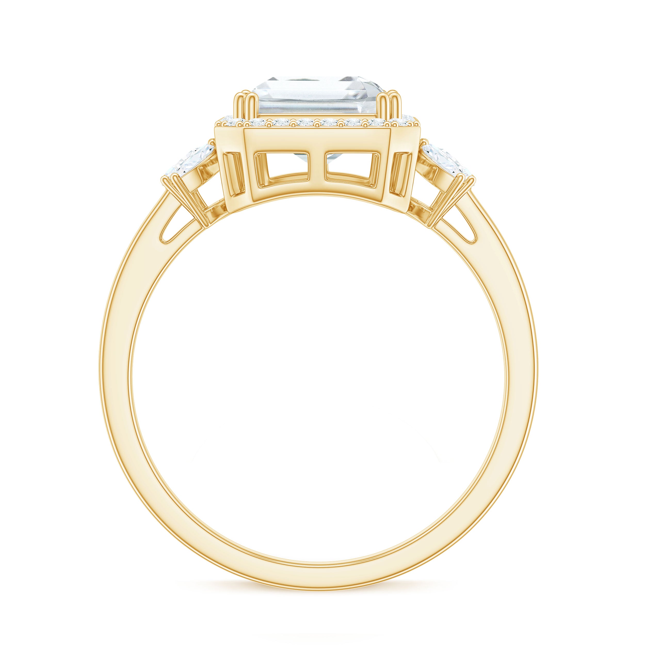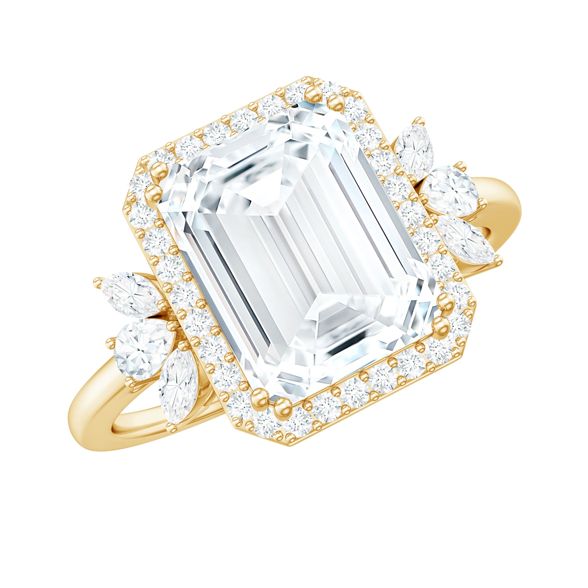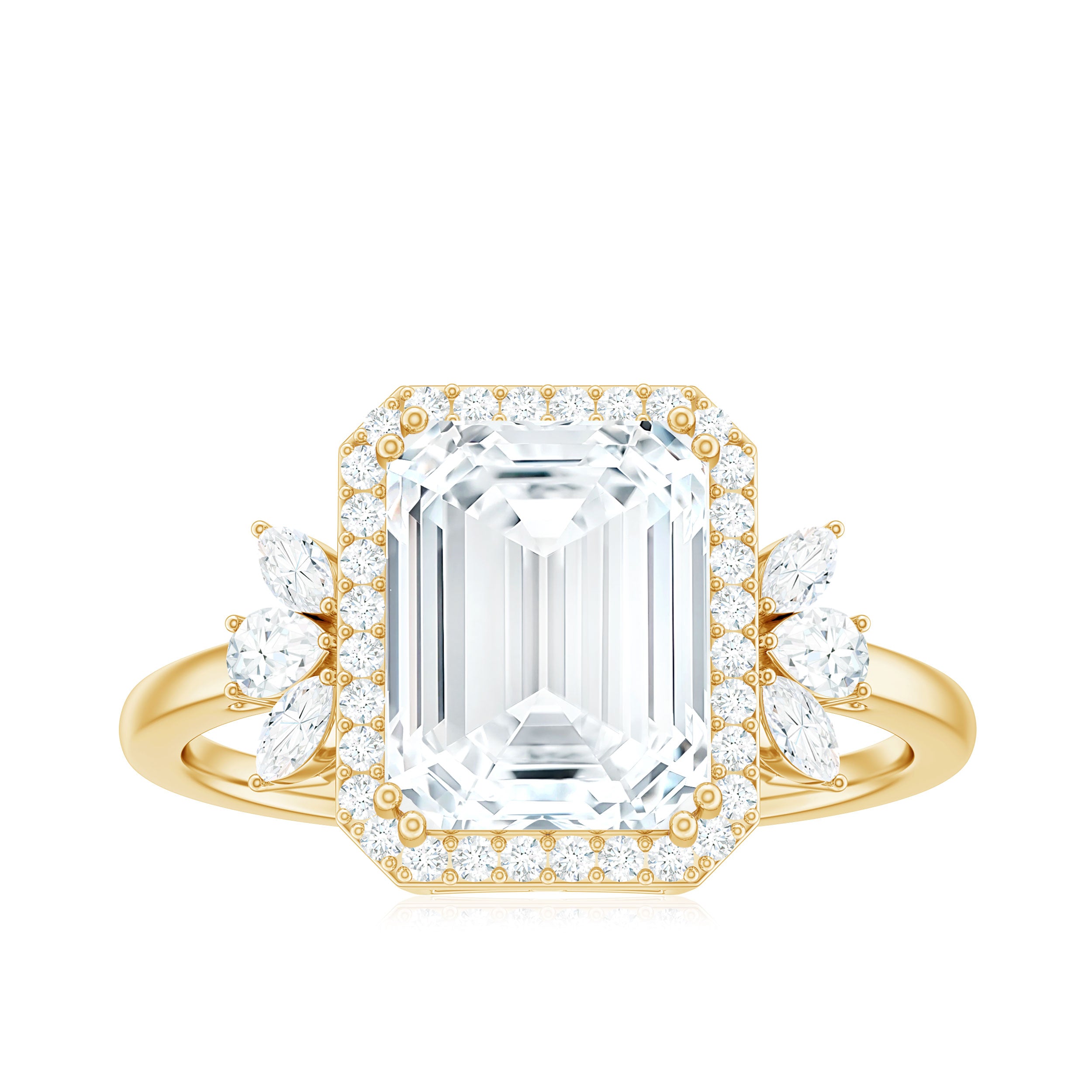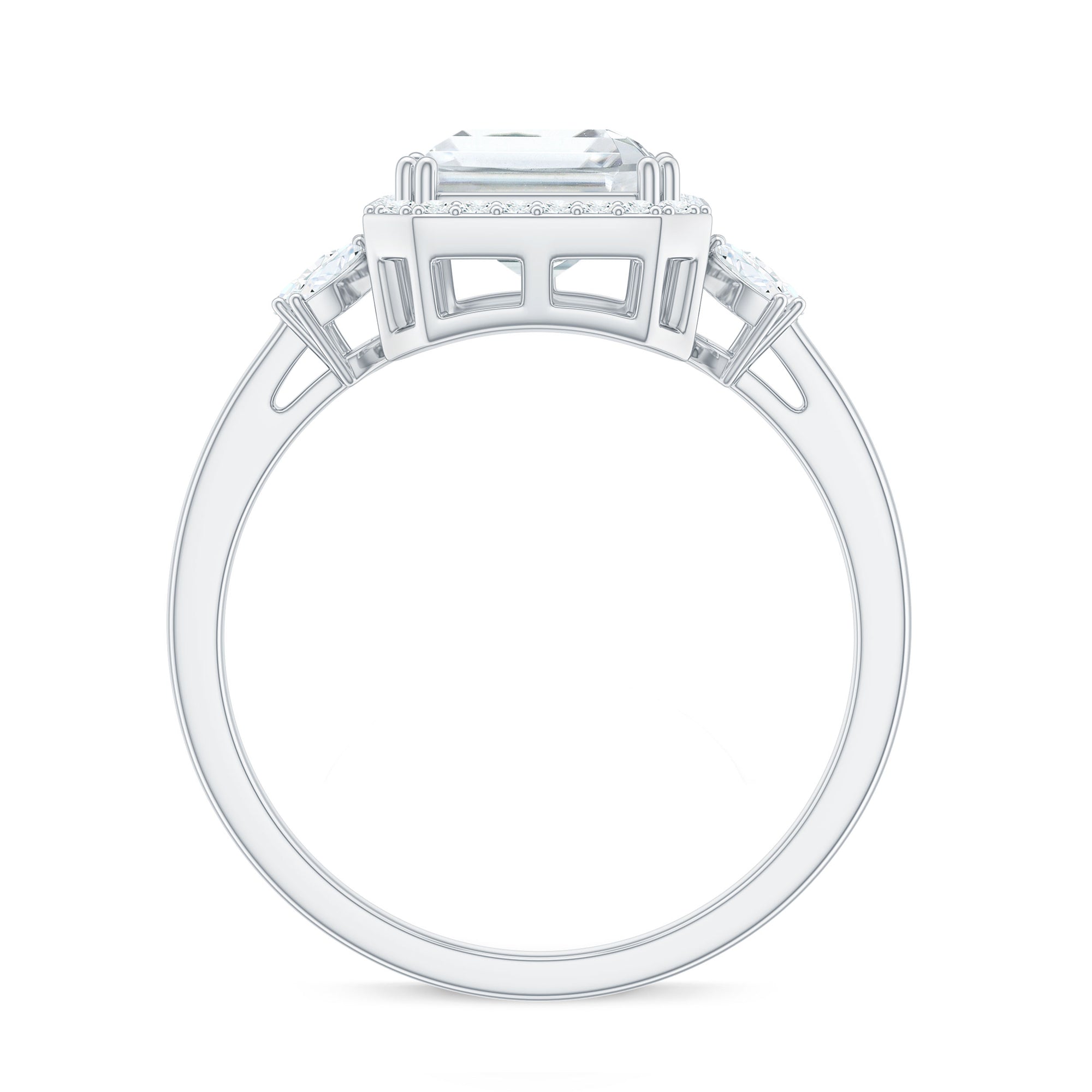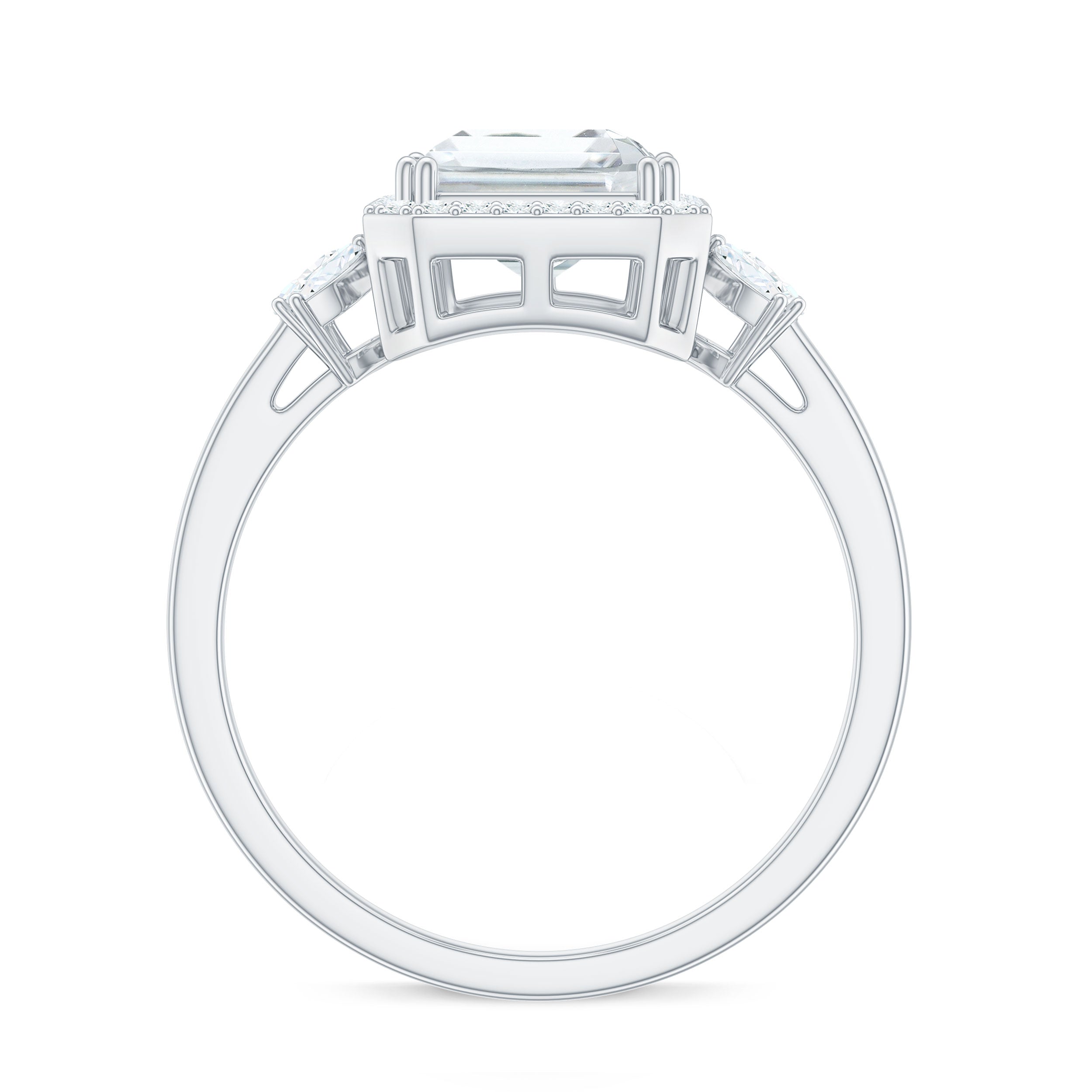Captivate your forever moment with this dazzling moissanite halo engagement ring, a timeless treasure in moissanite ring. Celebrate your love story with this emerald cut moissanite ring, featuring a 7X9 MM certified D-VS1 quality center stone that radiates sophistication. The emerald cut solitaire ring is framed by a brilliant round moissanite halo, adding dramatic sparkle and enhancing the clean lines of the octagon cut center. Each side is gracefully accented with a trio of pear and marquise cut moissanite stones, forming a floral-inspired detail that exudes elegance and feminine charm. With a proper total carat weight of 3.228 ctw, this moissanite engagement ring is securely held in a classic prong setting, ensuring maximum brilliance with lasting durability. Whether youre searching for a halo engagement rings emerald cut or a modern yet classic solitaire engagement ring, this piece is the perfect expression of everlasting love, making it an ideal choice among women’s moissanite ring for your most special occasion.