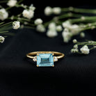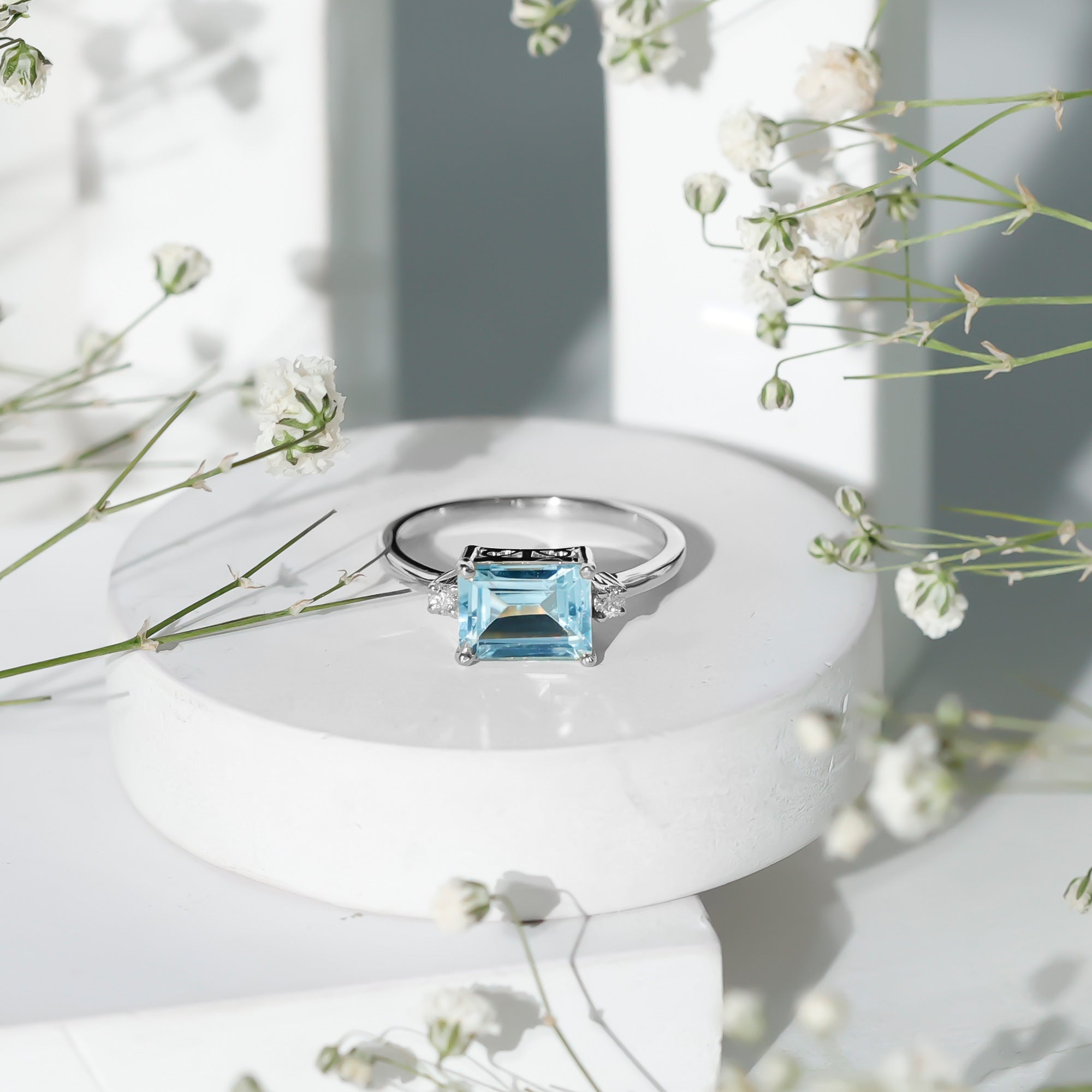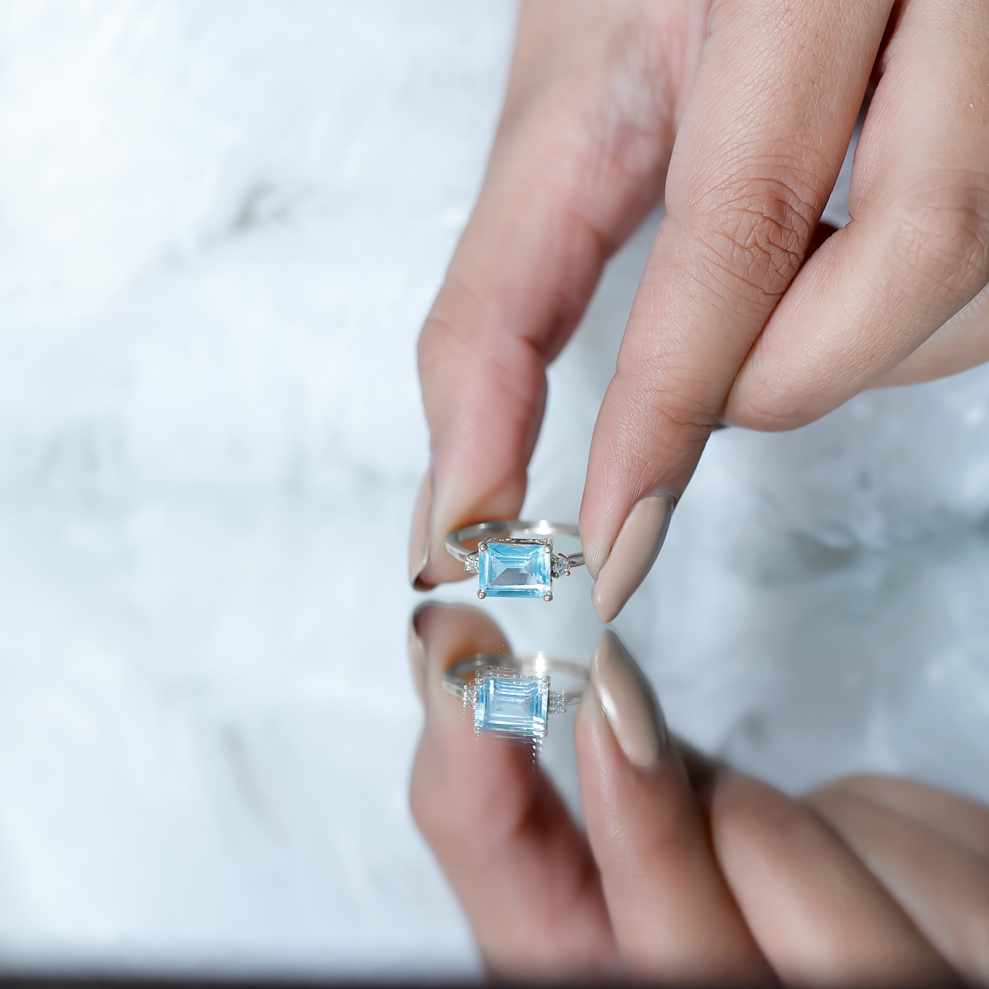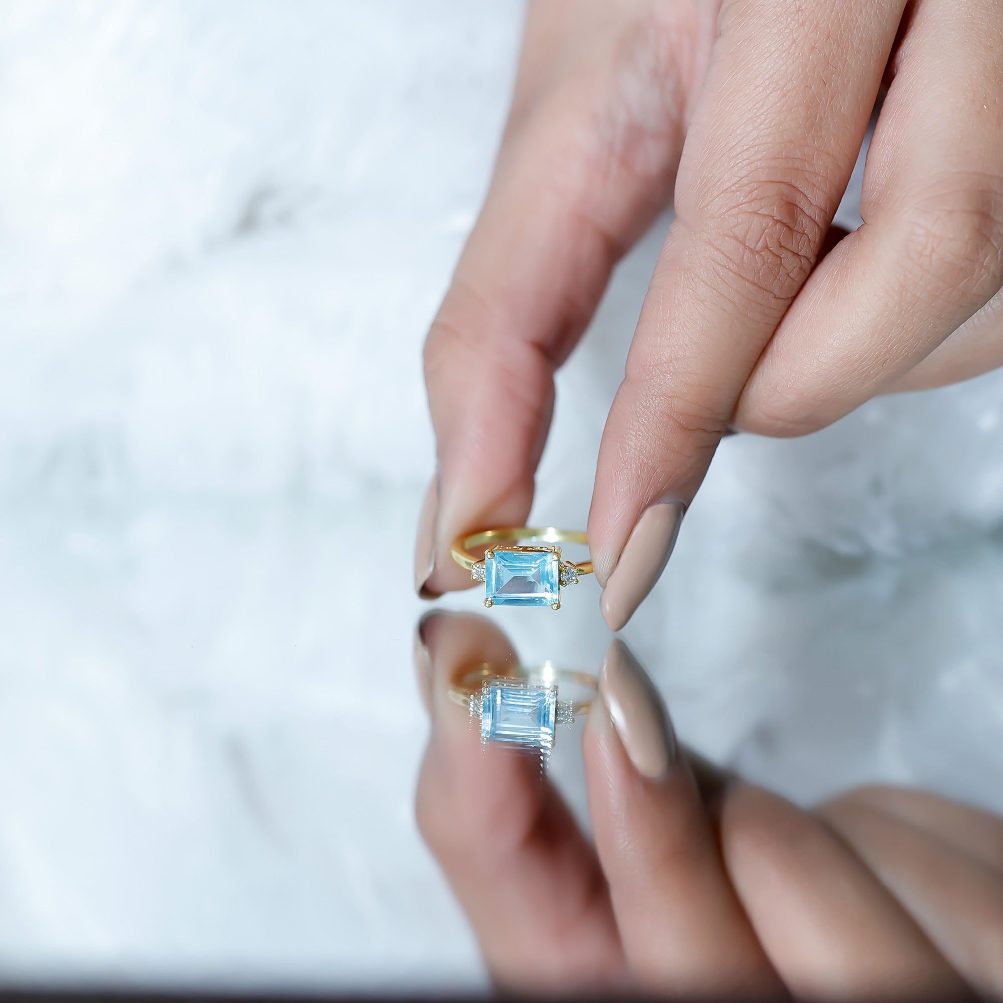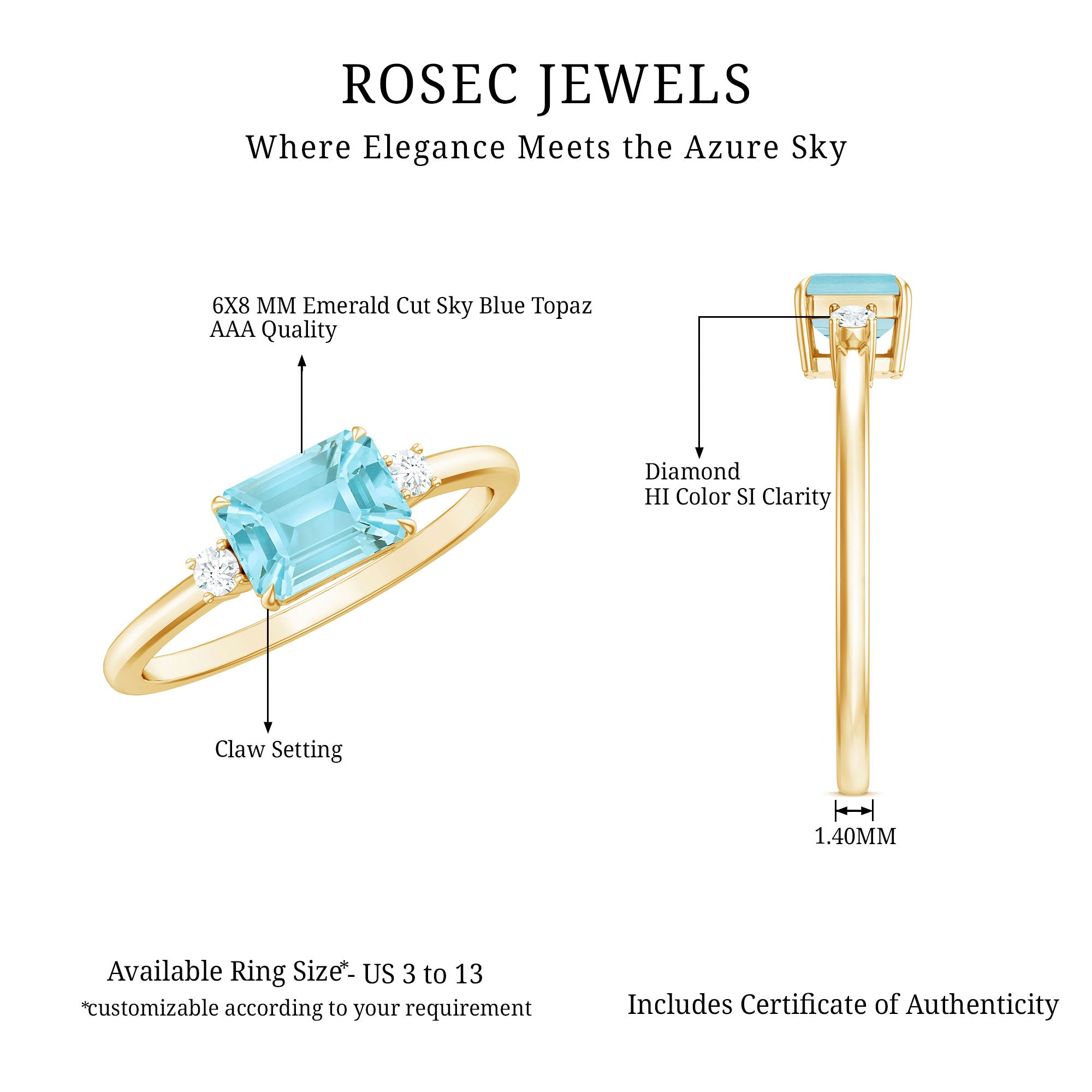 Elevate your style with this exquisite Solitaire Engagement Ring, featuring an alluring Emerald Cut Shape Sky Blue Topaz that is set in an East-West pattern, further enhancing its unique and captivating appeal. The stunning Sky Blue Topaz is beautifully showcased in a claw setting, accentuated by sparkling Round Diamond side stones, adding to its sophisticated and refined allure. The Sky Blue Topaz ring is expertly crafted with the highest quality gold, ensuring a luxurious and opulent feel. Give your special someone a gift that they will cherish forever, and symbolize your commitment to a lifelong promise of love and devotion with this exceptional and enchanting Solitaire Engagement Ring.