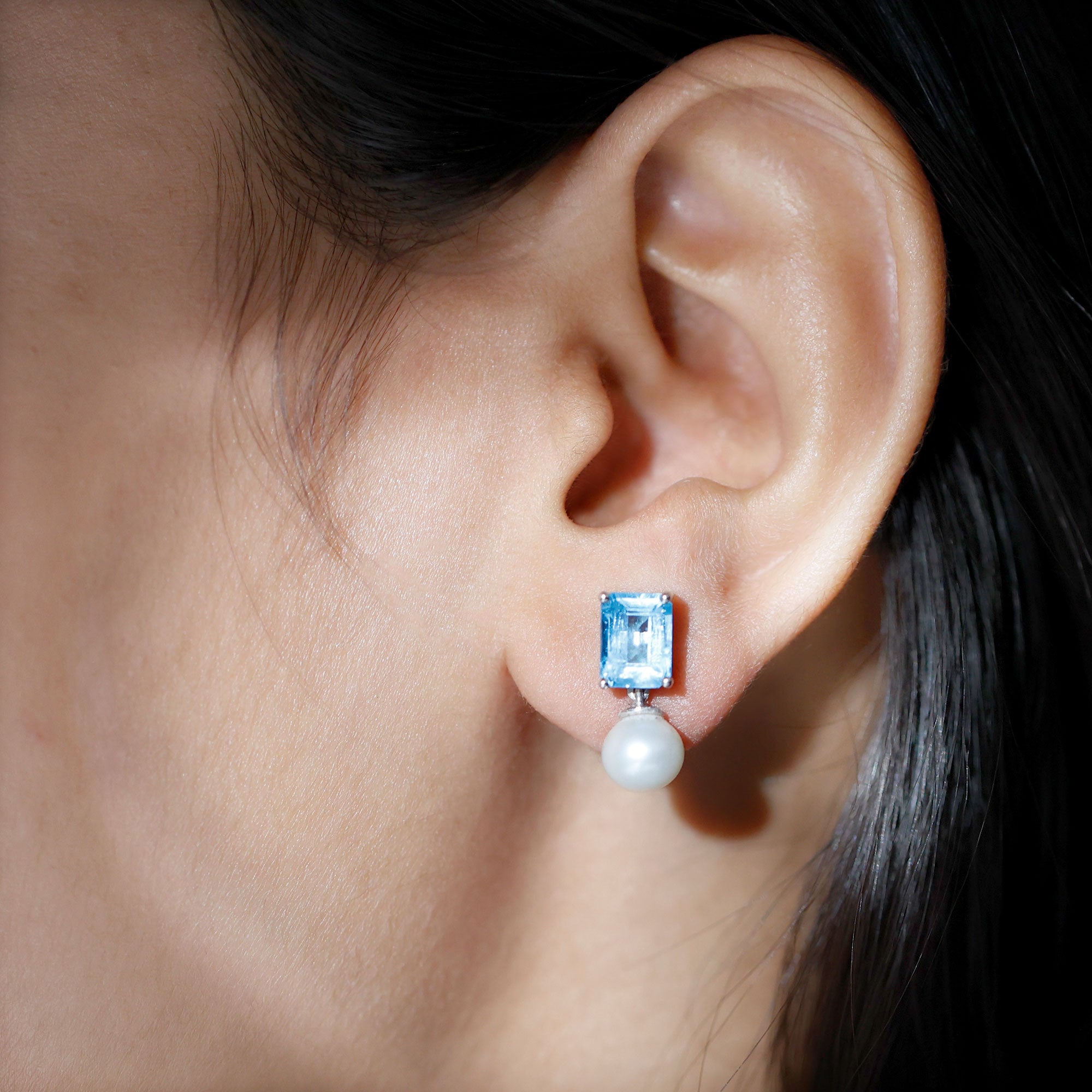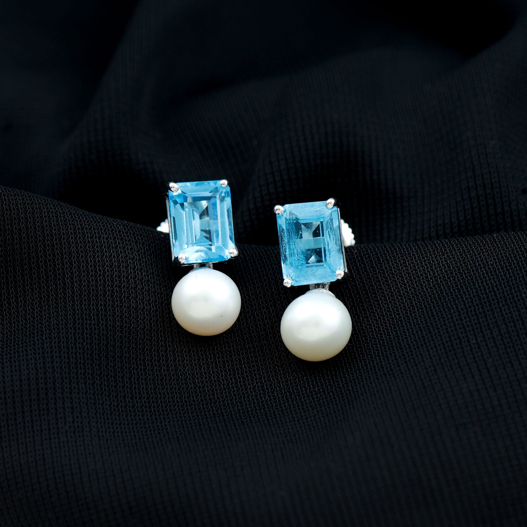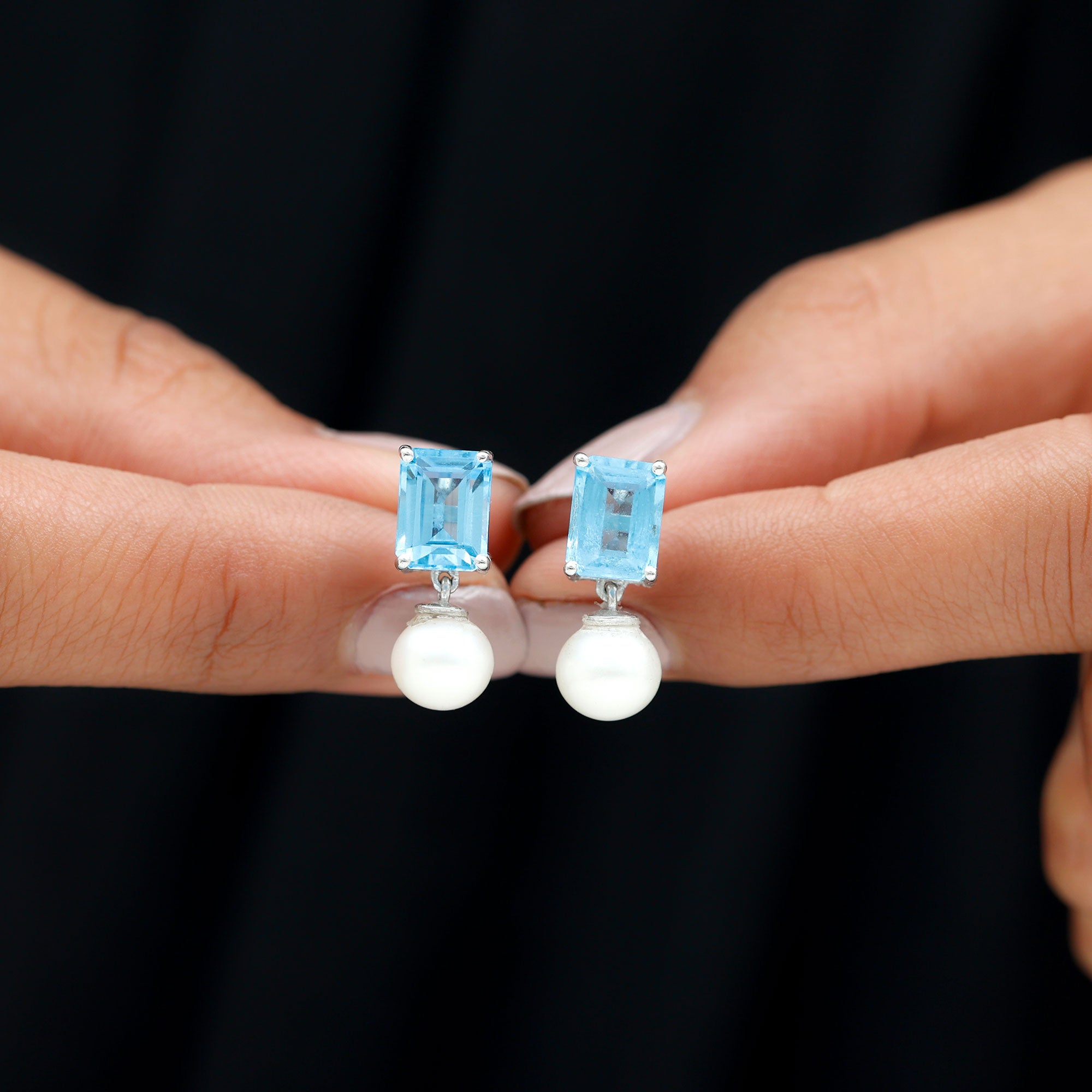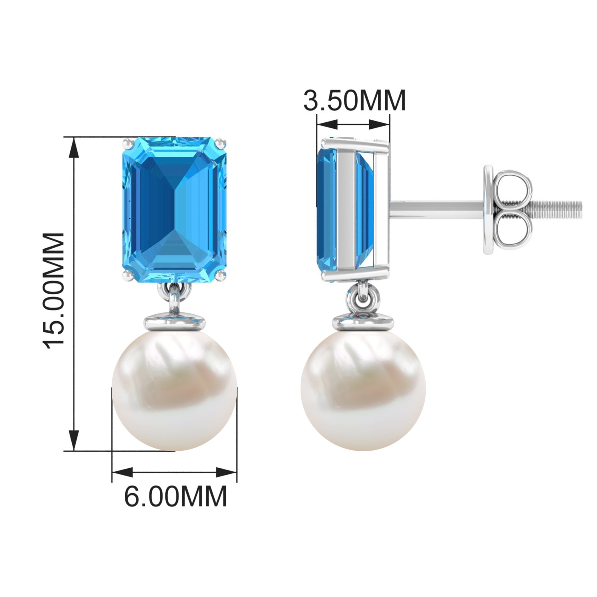 Emerald Cut Swiss Blue Topaz and Freshwater Pearl Drop Earrings