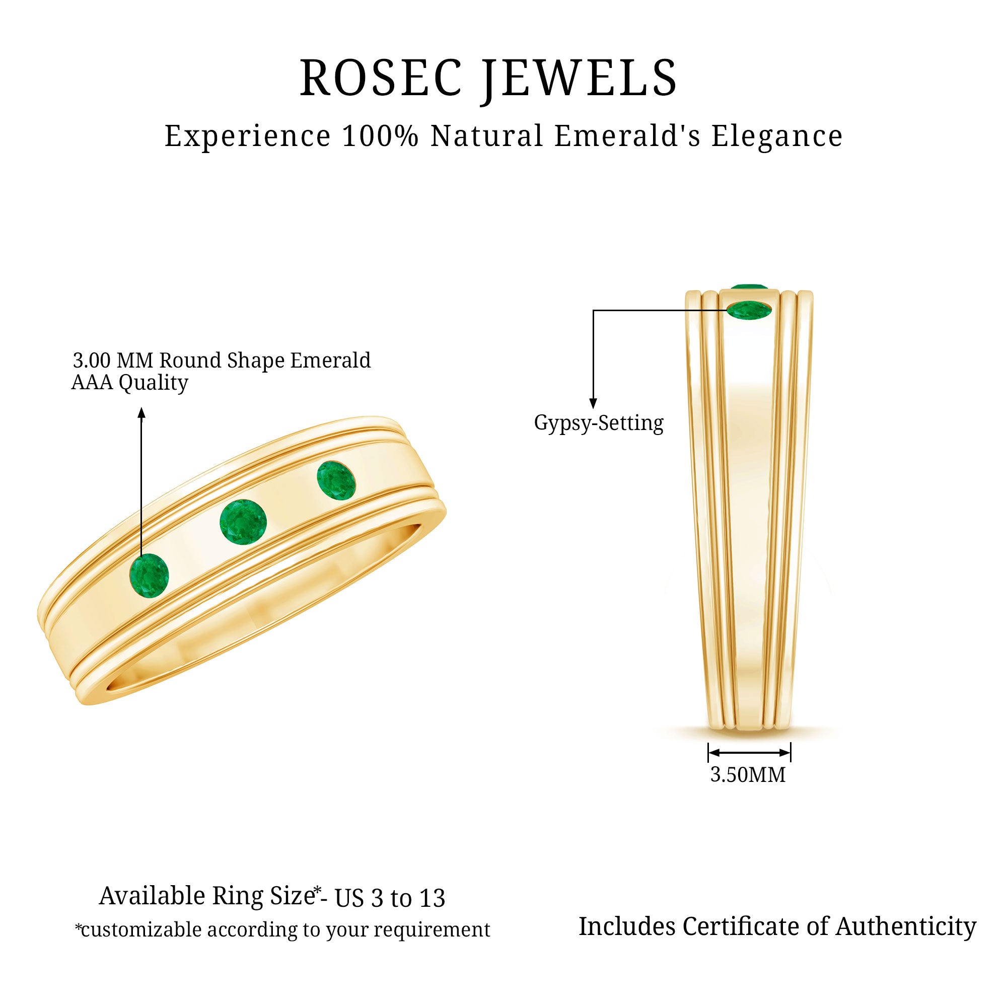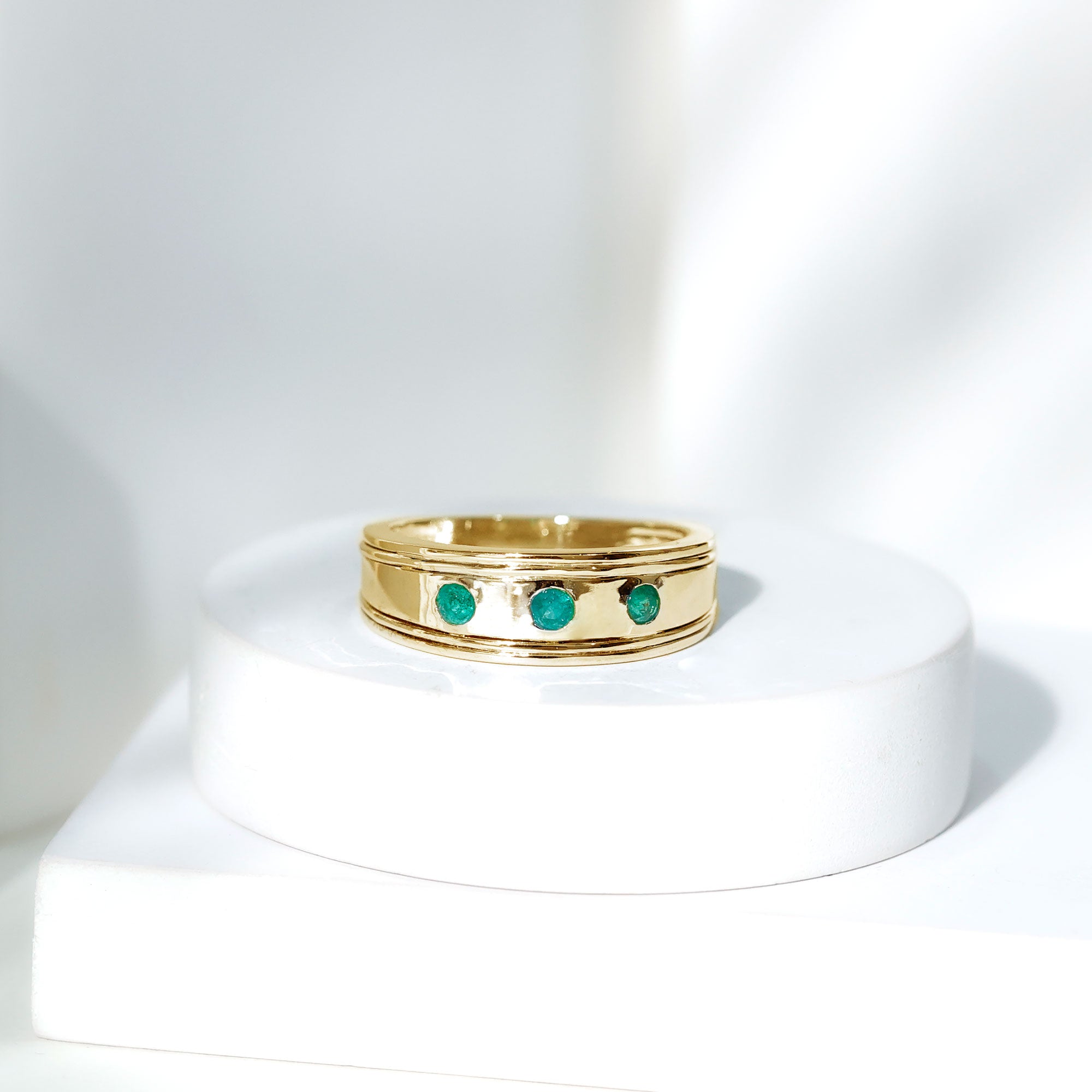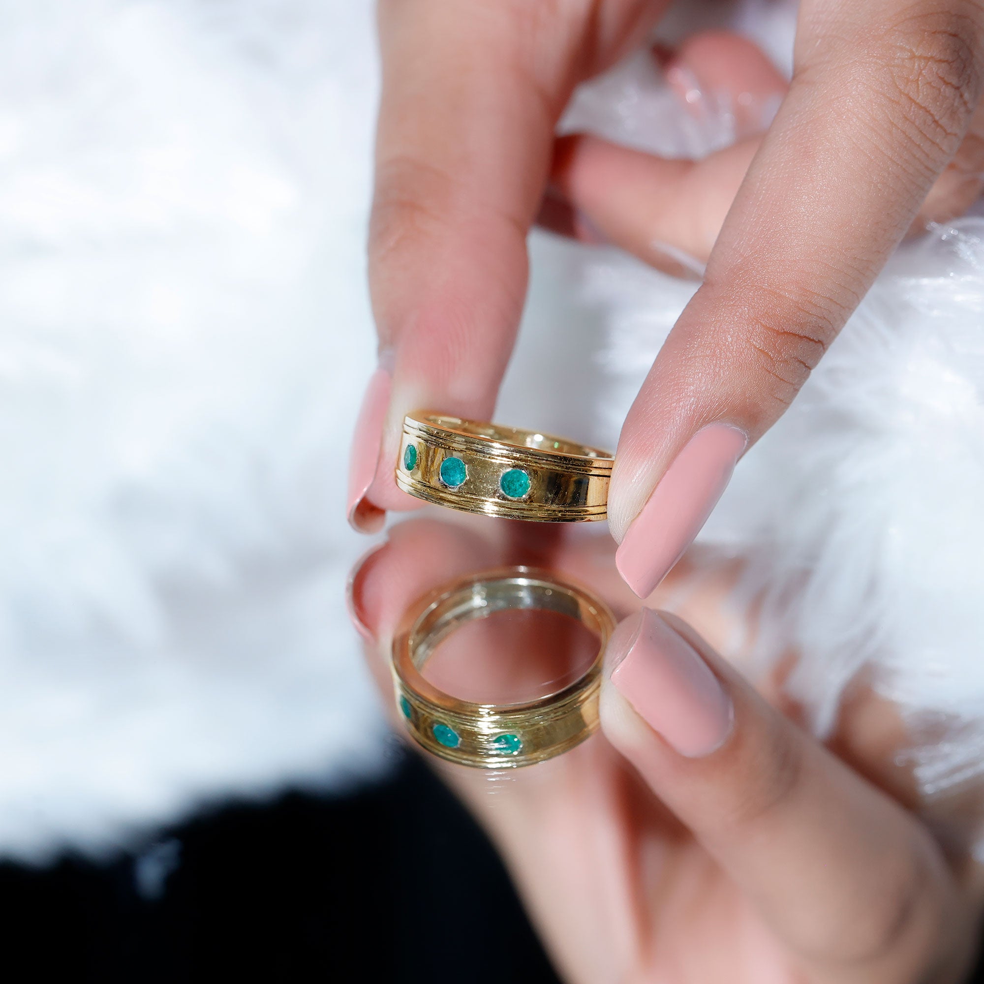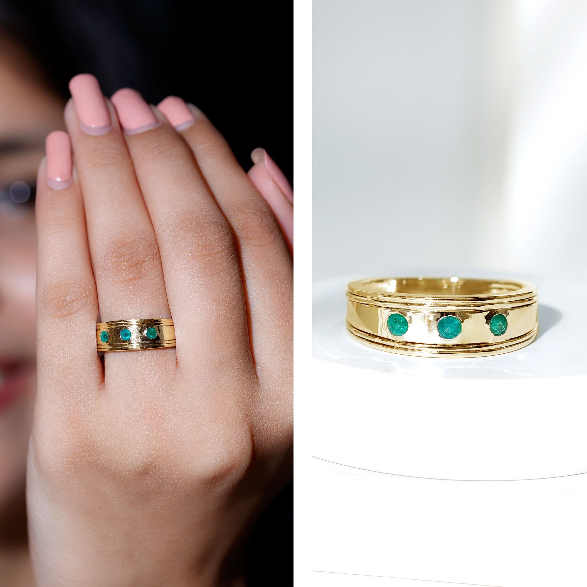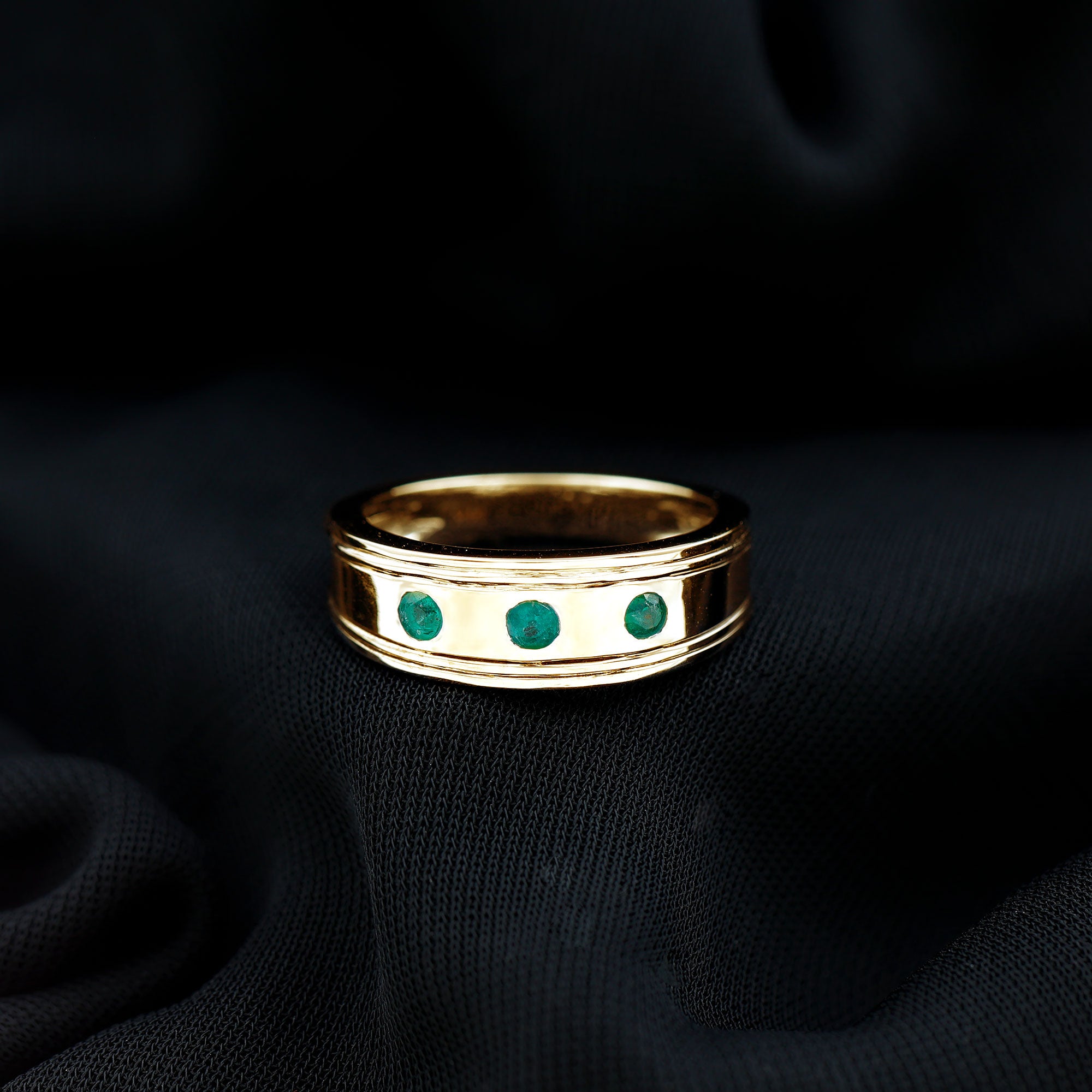 Celebrate the beauty of elegance and everlasting love with this Mens Band Ring - a stunning piece that seamlessly combines traditional sparkle with contemporary design. Expertly handcrafted by talented artisans, this Emerald Band Ring is crafted from high-quality metal and certified gems, providing remarkable brilliance and value. This Minimal Band features dazzling round shape three emerald gemstones in a gypsy setting. The thoughtful arrangement results in a sophisticated Wide Band Ring that is striking yet not overpowering, making it the ideal representation of your enduring connection. Whether you are celebrating a significant occasion or simply looking to add a standout piece to your collection, this Emerald Anniversary Band is crafted to impress. It gracefully wraps around the finger with a timeless charm that brings both romance and nostalgia. The detailed craftsmanship guarantees not only aesthetic appeal but also lasting comfort and durability. It comes beautifully presented in an elegant jewelry box, making it a perfect gift or a cherished keepsake for yourself. Let every moment shine with this exquisite Mens Anniversary Band - because your love deserves nothing short of extraordinary.