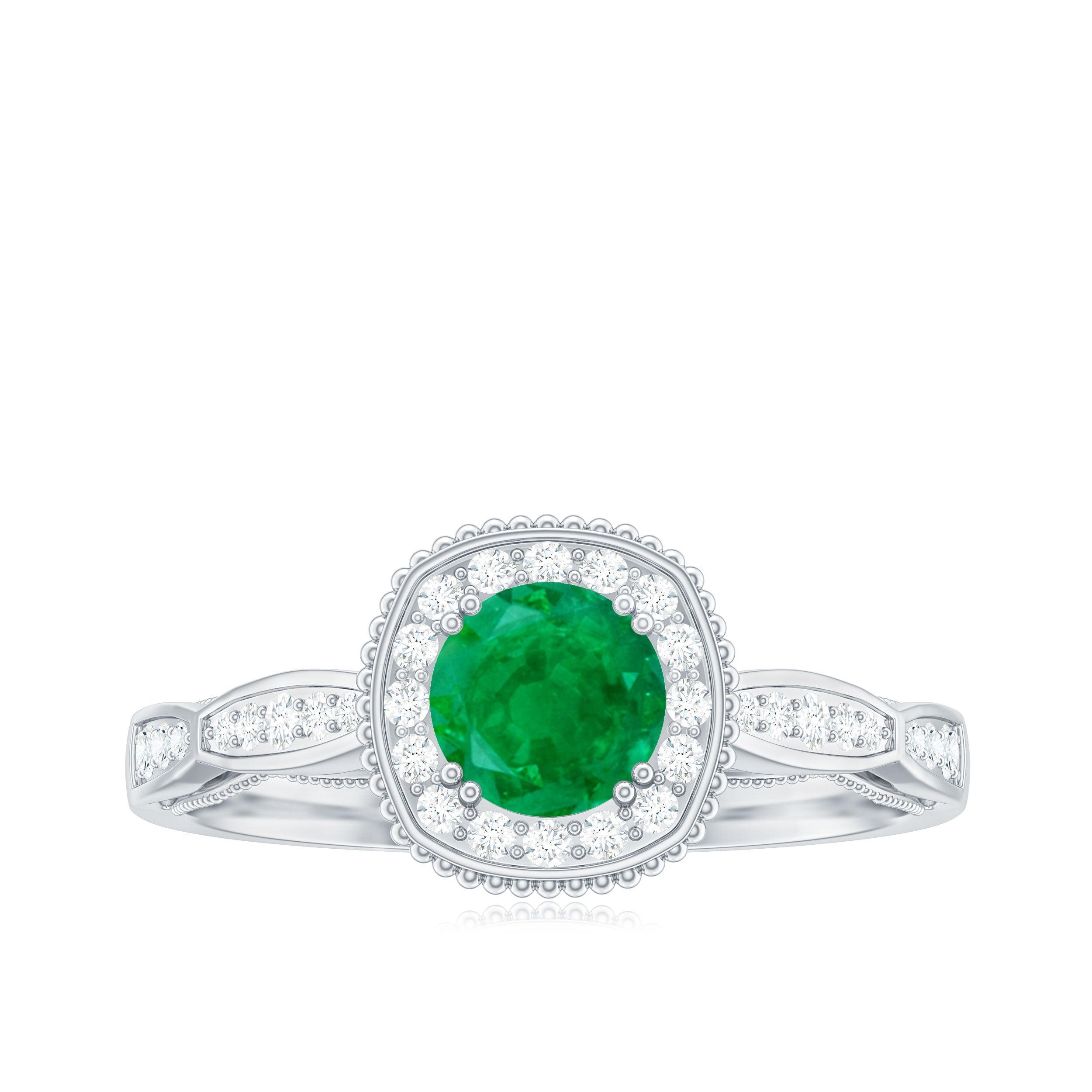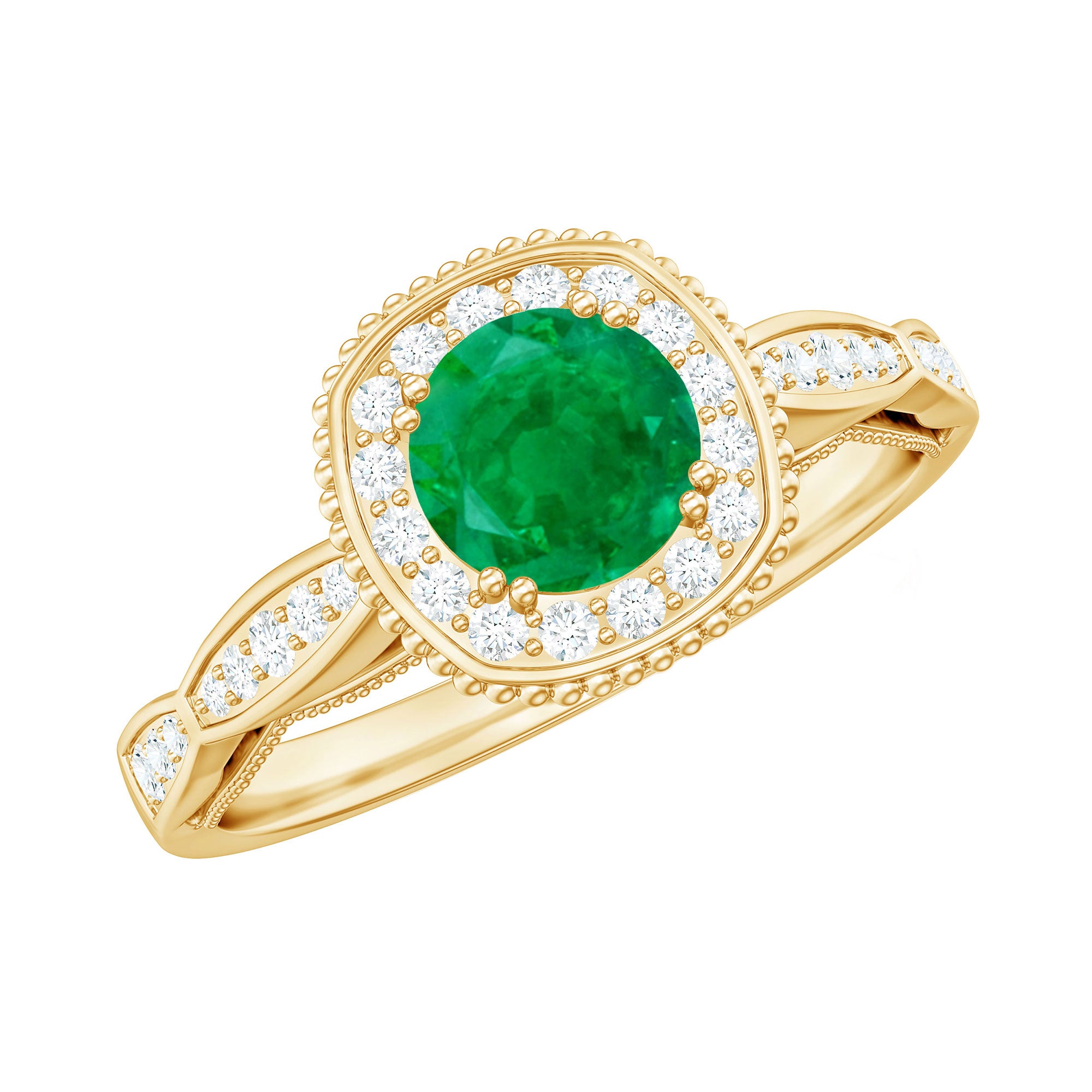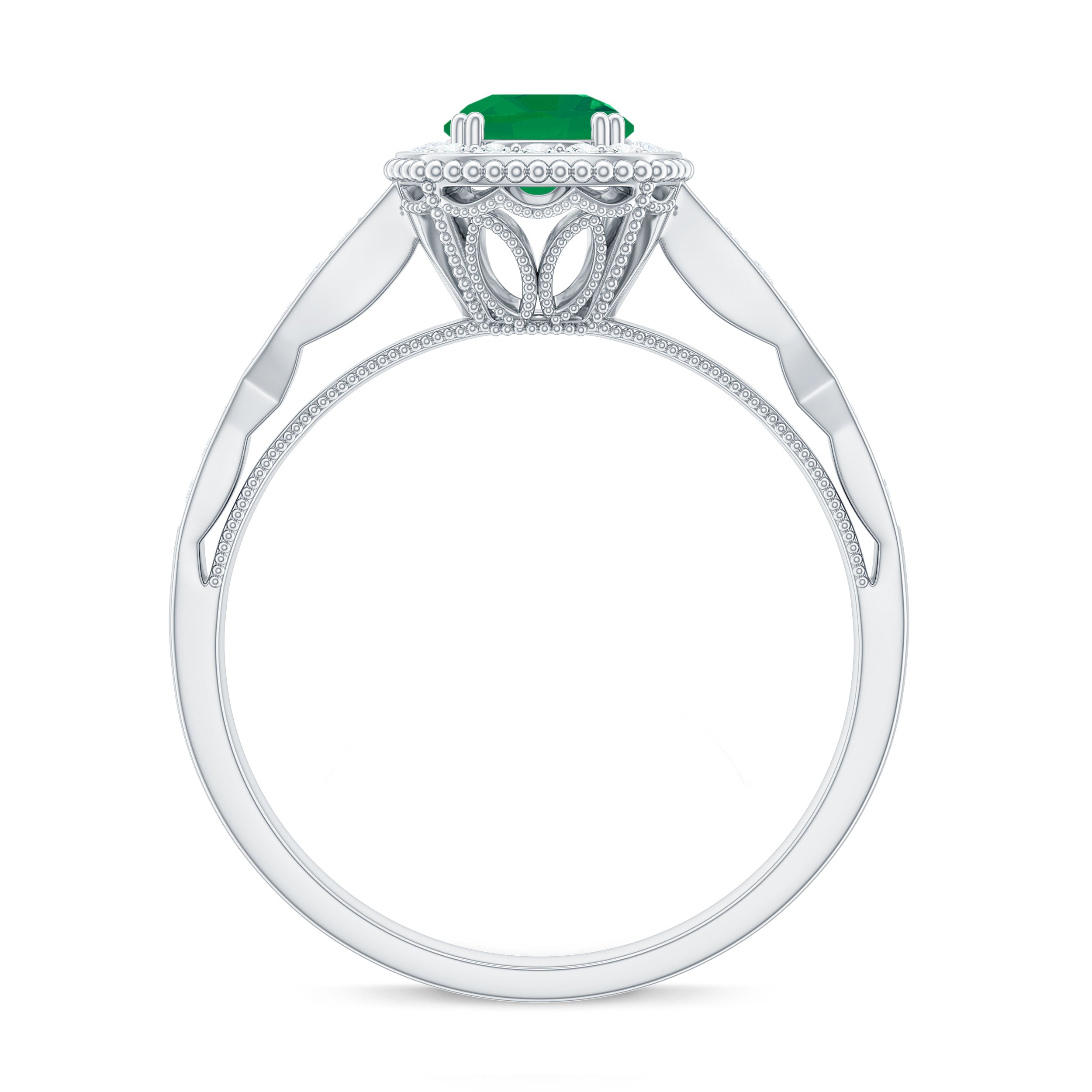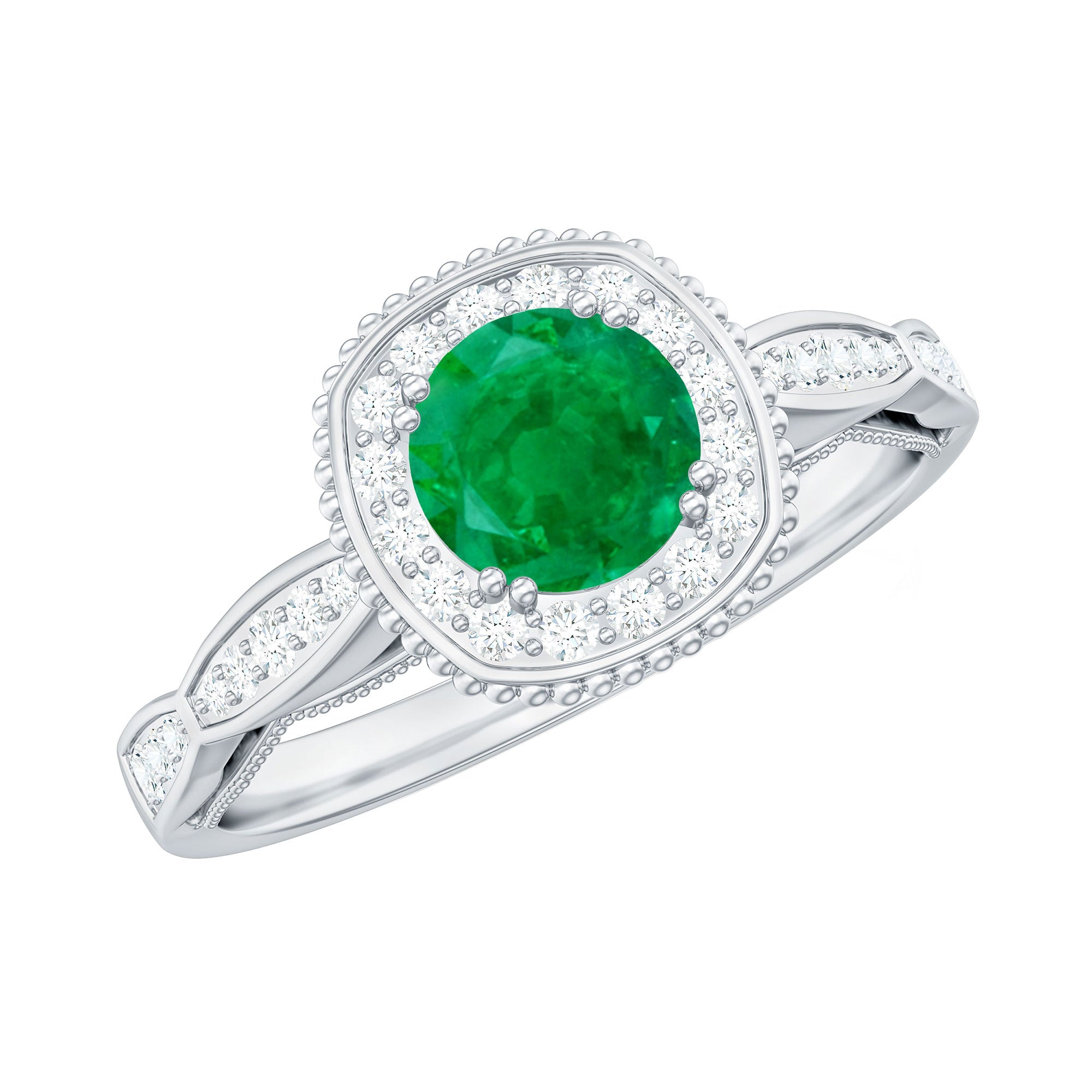 Celebrate a love that is as enduring as it is radiant with this stunning Emerald Halo Engagement Ring. At the center of this timeless piece rests a 5 MM round emerald, expertly cut to reflect exceptional brilliance and fire. Surrounded by a sparkling halo of petite diamond stones, the centerpiece appears even more luminous, catching light from every angle and creating a truly breathtaking glow. What sets this Antique Looking Engagement Ring apart is its vintage inspired charm. The band is detailed with intricate beaded accents and additional stones that echo the elegance of antique jewelry, adding texture and depth without overwhelming the design. This Vintage Engagement Ring is a beautiful balance of classic romance and contemporary style, thoughtfully crafted for the bride who finds beauty in tradition but writes her own story. The halo design amplifies the presence of the moissanite, presenting a gentle, feminine outline that exudes both luxury and sophistication. Each aspect has been meticulously crafted to showcase the stones brilliance and symbolize the importance of your commitment. This Emerald Engagement Ring comes in a stylish jewelry box, prepared for that memorable YES moment. Romantic, luminous, and inspired by retro aesthetics, it transcends being merely a ring; it represents an everlasting promise, beautifully set in a design she will cherish forever.