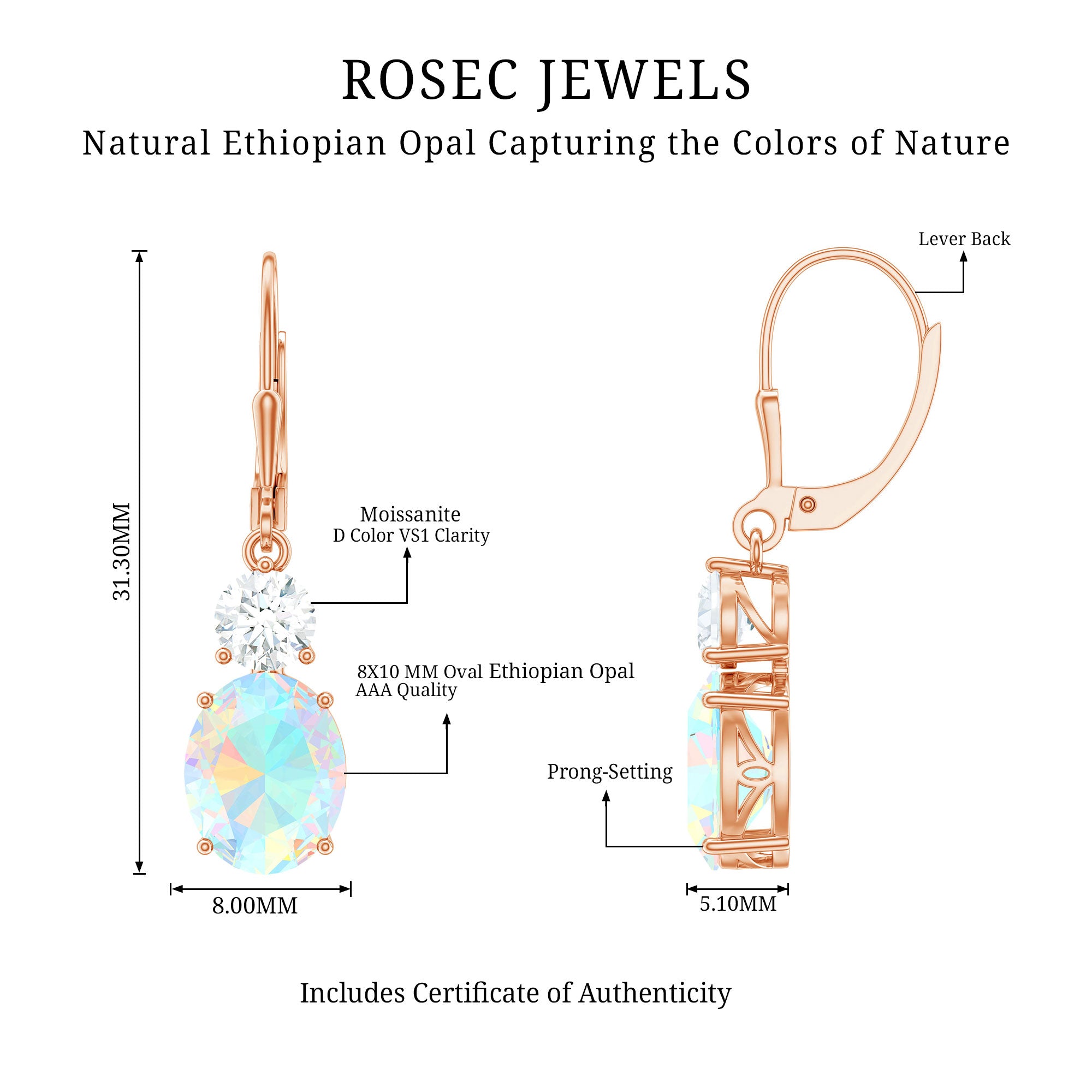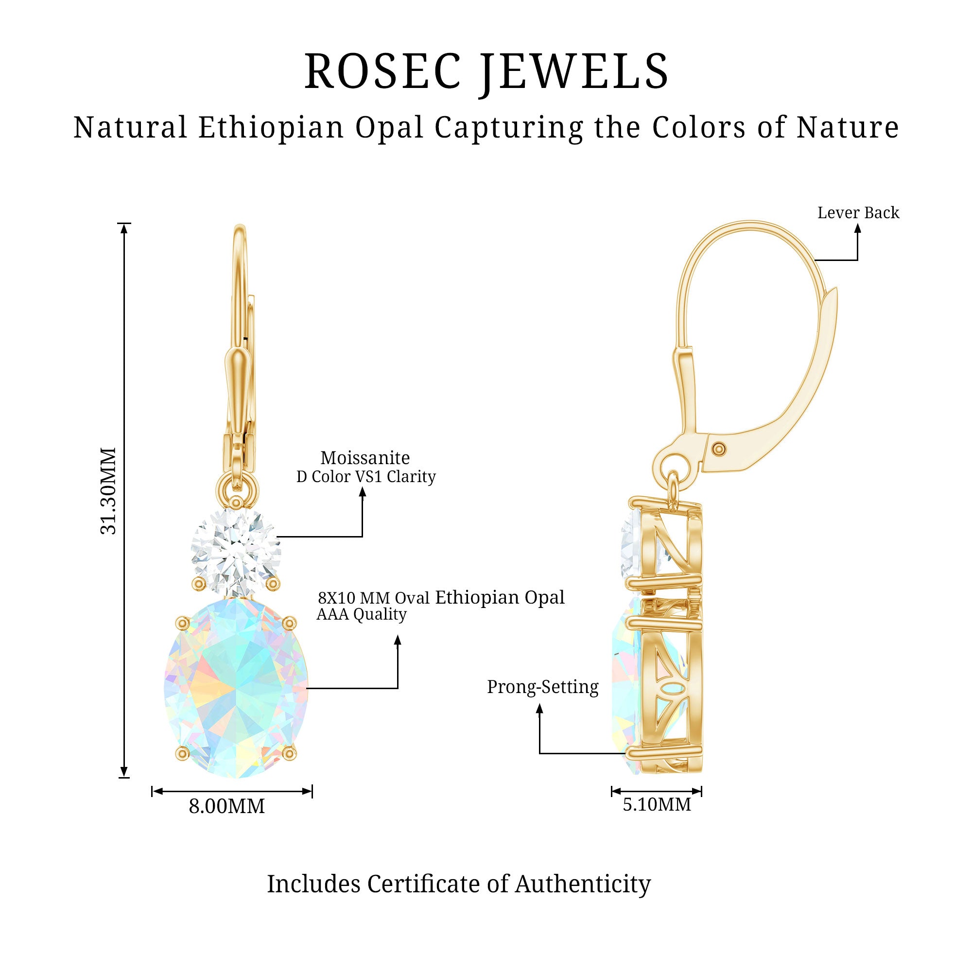Bring the spotlight on you when you wear these Ethiopian Opal Earrings and add a touch of mystique to your look. Showcasing 8X10 MM Oval Ethiopian Opal elegantly set in prong setting complimented by Round Moissanite shimmers from the top. To make you feel comfortable all the time, these opal earrings come with lever back closures that keep each earring safe in the right place. Sparkle up your look and capture the essence of timeless elegance with these drop earrings, a pair that is best suited for every occasion.
