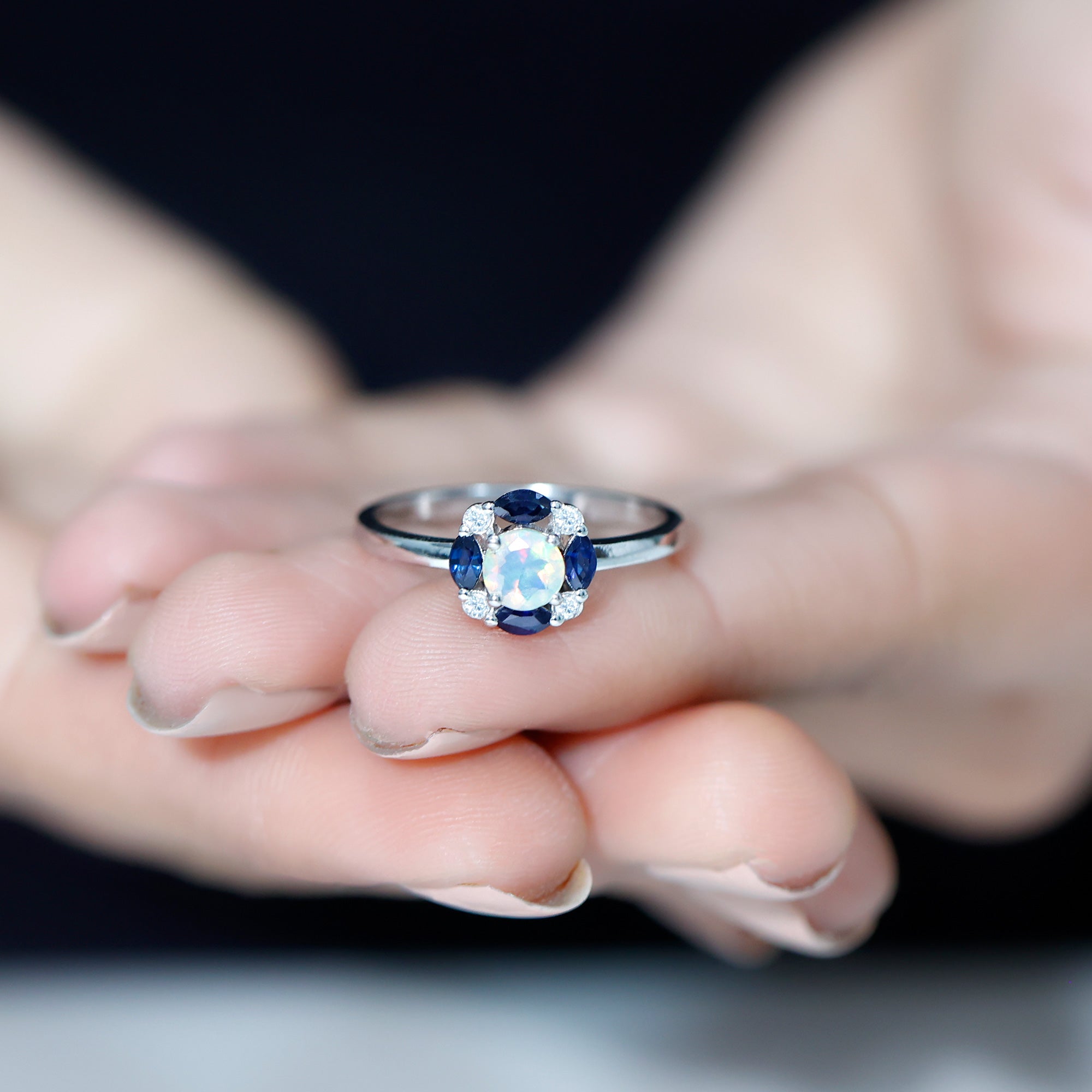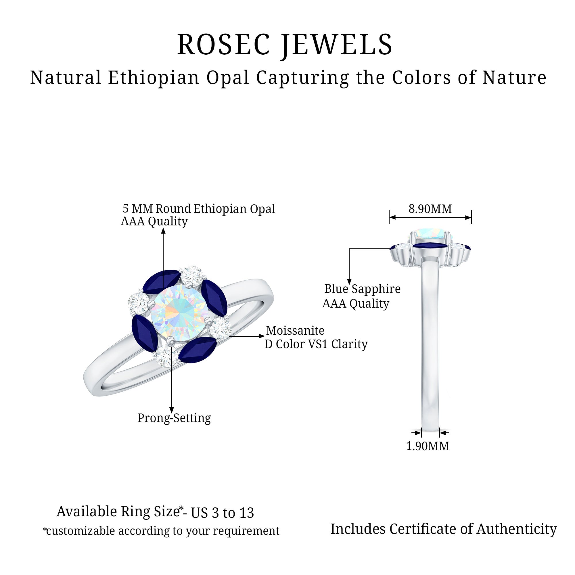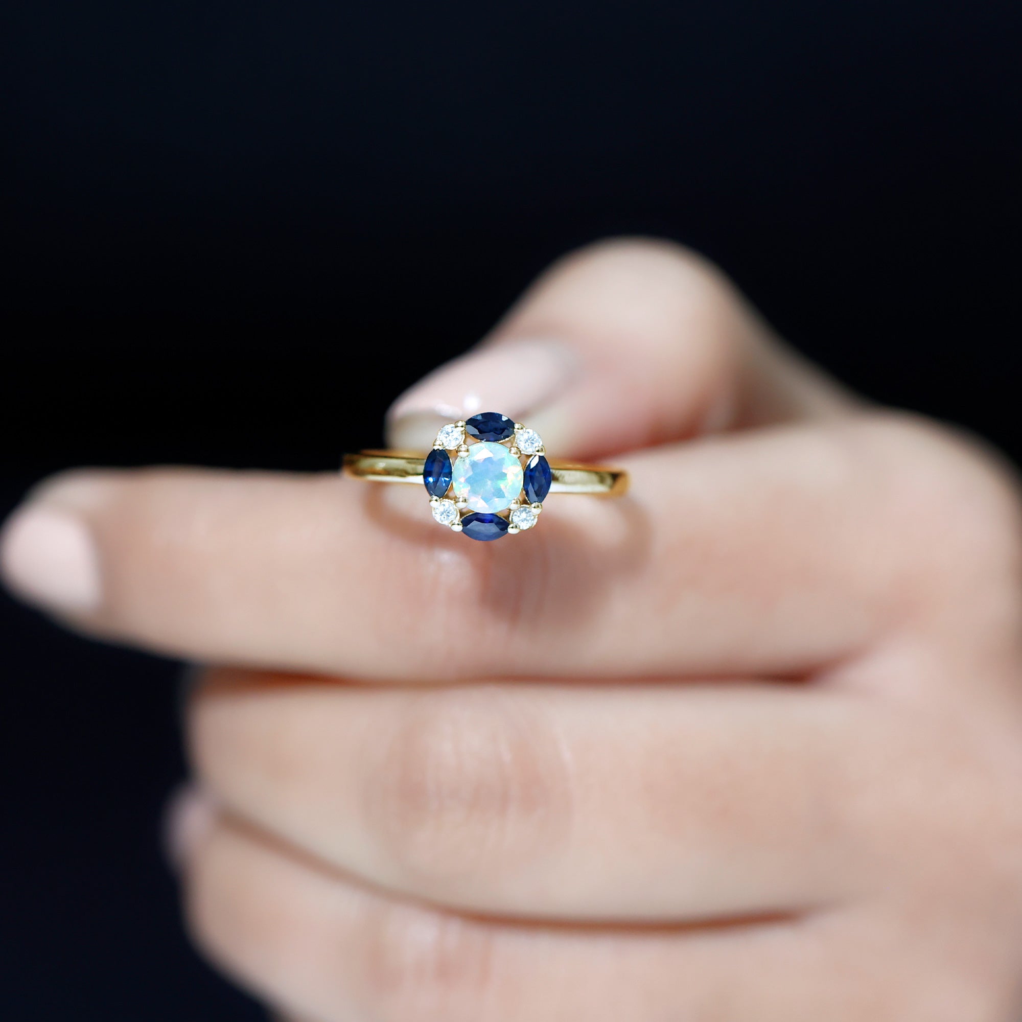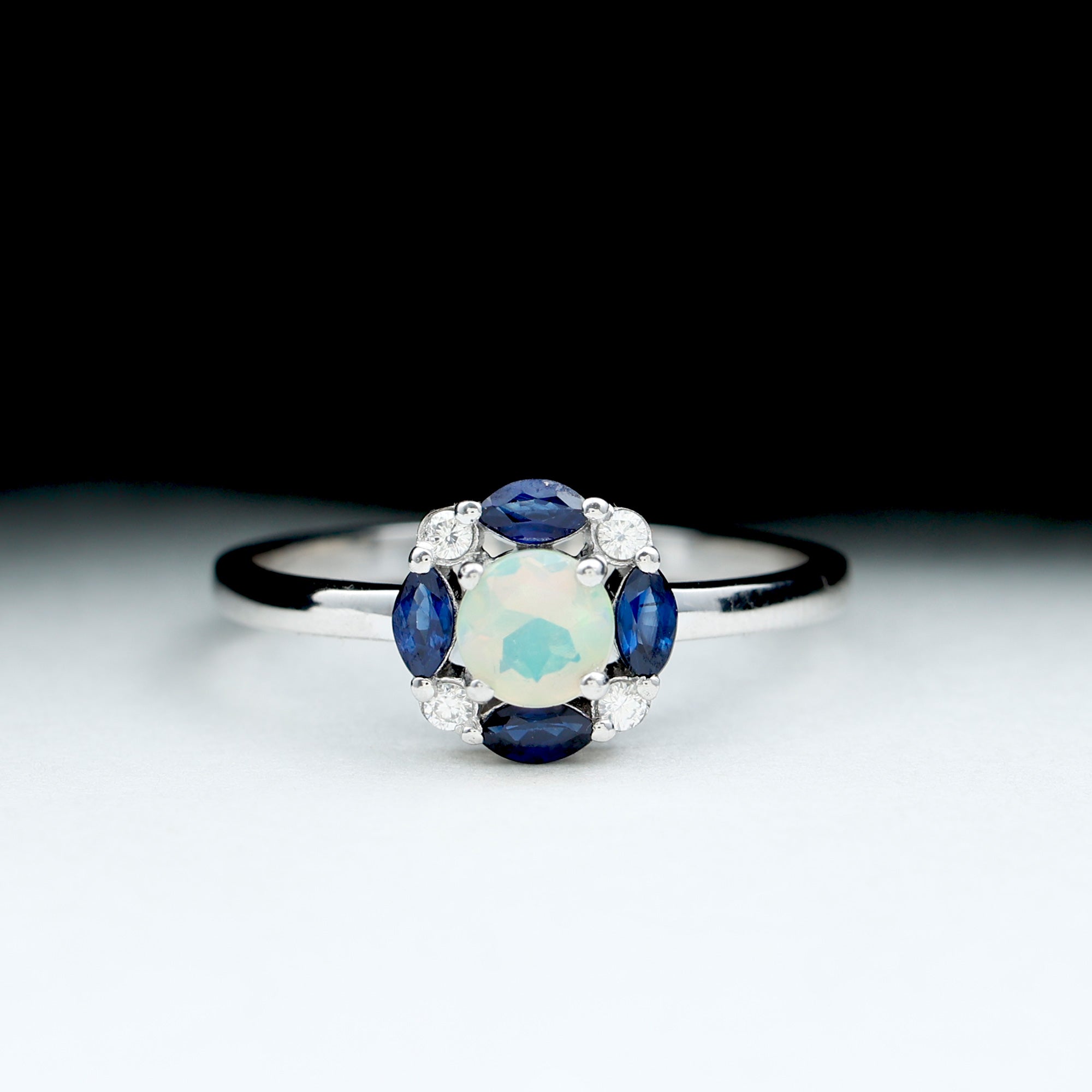 Unveil the magic of love with this Opal Engagement Ring with Halo, a captivating fusion of color and brilliance. This Fine Ring features a 5 mm Round Shape Ethiopian Opal in Prong Setting at the center, radiating a mesmerizing play of colors that shift with every angle. Surrounding the Opal is a Halo of Marquise Shape Blue Sapphire and Round Shape Moissanite, adding a burst of regal color and sparkle to the design. This Ethiopian Opal Engagement Ring captures the perfect balance of boldness and elegance, making it the ideal symbol of your unique love story. Whether you are proposing, celebrating an anniversary or marking a special occasion, this Real Opal Engagement Ring speaks volumes. Crafted with care and presented in a signature jewelry box, this Halo Engagement Ring with Opal is available in a variety of sizes for the perfect fit. Radiant and timeless, this Opal and Sapphire Engagement Ring is a true reflection of a love that is meant to last forever.