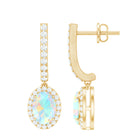 Elegant sparkle can transform any moment into something unforgettable, and these Hoop Drop Earrings are crafted to bring that special touch to your most meaningful occasions. Each earring highlights a 5X7 MM oval Ethiopian opal held securely in claw setting. Surrounding the center stone is a halo of bright round moissanites, adding extra brilliance. The J hoop is also accented with moissanites, creating a smooth trail of sparkle from top to bottom. Designed with comfort in mind, the screw-back closures keep the Oval Drop Earrings safely in place all day or night. Perfect for anniversaries, celebrations, or any moment when you want to show love and appreciation, these Ethiopian Opal Earrings make a meaningful and memorable gift. Whether she wears them with an elegant outfit or chooses them to add a hint of shine to her everyday style, these Opal and Moissanite Hoop Earrings will instantly elevate her look.