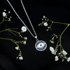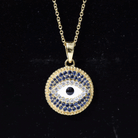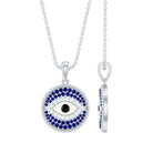 A stunning symbol of protection, this Third Eye Necklace is meticulously crafted from 14k white gold plated sterling silver and features the Evil Eye symbol at its center. This designer fashion necklace is made with Moissanites and lab created blue sapphires in a timeless design that promotes good karma and positive vibes. At the center, a black and white enameled eye shape is surrounded by shimmering round moissanites and lab grown blue sapphire stones, all framed with intricate beaded detailing. The Moissanite and Sapphire Necklace is suspended from a cable chain and connected securely with a lobster clasp. Elevate your neckline with this Evil Eye Pendant that is destined to become your new fashion staple. Eye-catching and stylish, it is exactly what you need to keep up with the latest trends.