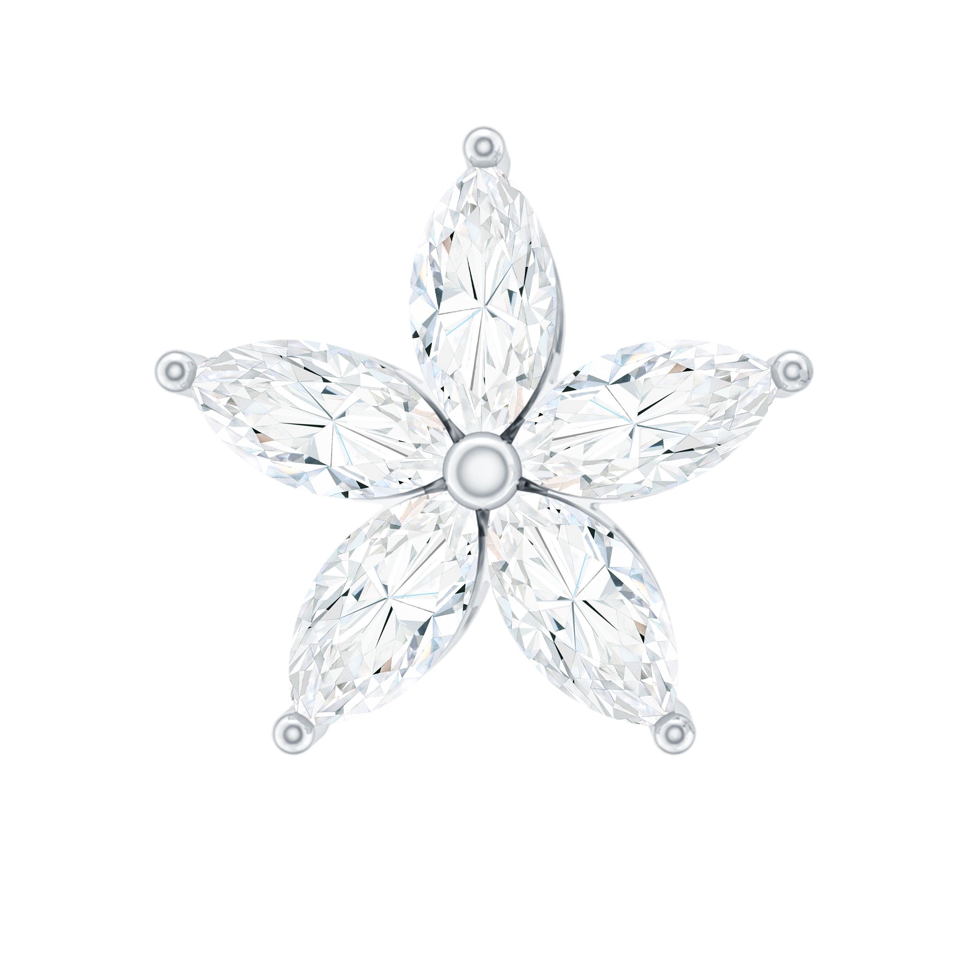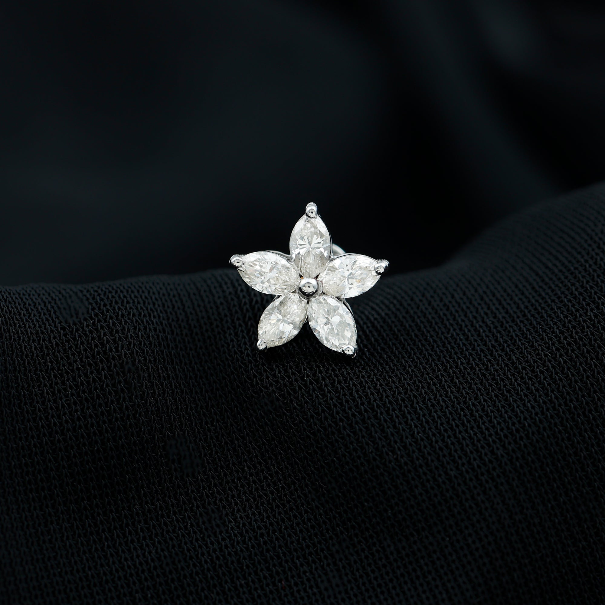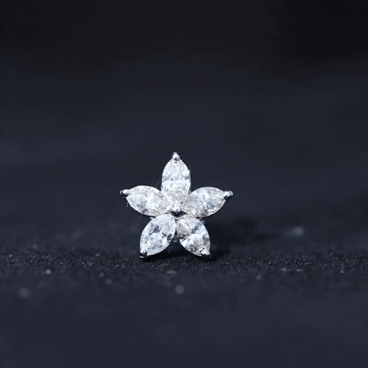 The Moissanite Flower Earring is a dazzling and elegant piece of jewelry that features five sparkling Marquise Cut Moissanite arranged in the shape of a beautiful flower design. Style this Floral Earring on your Helix, Cartilage, or Upper Lobe Piercing and pair it with your favorite outfits. The Flat Back Closure will keep it comfortably secured in place.