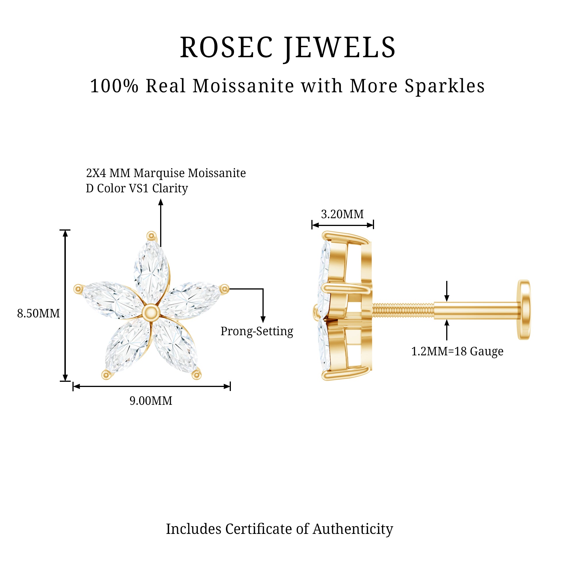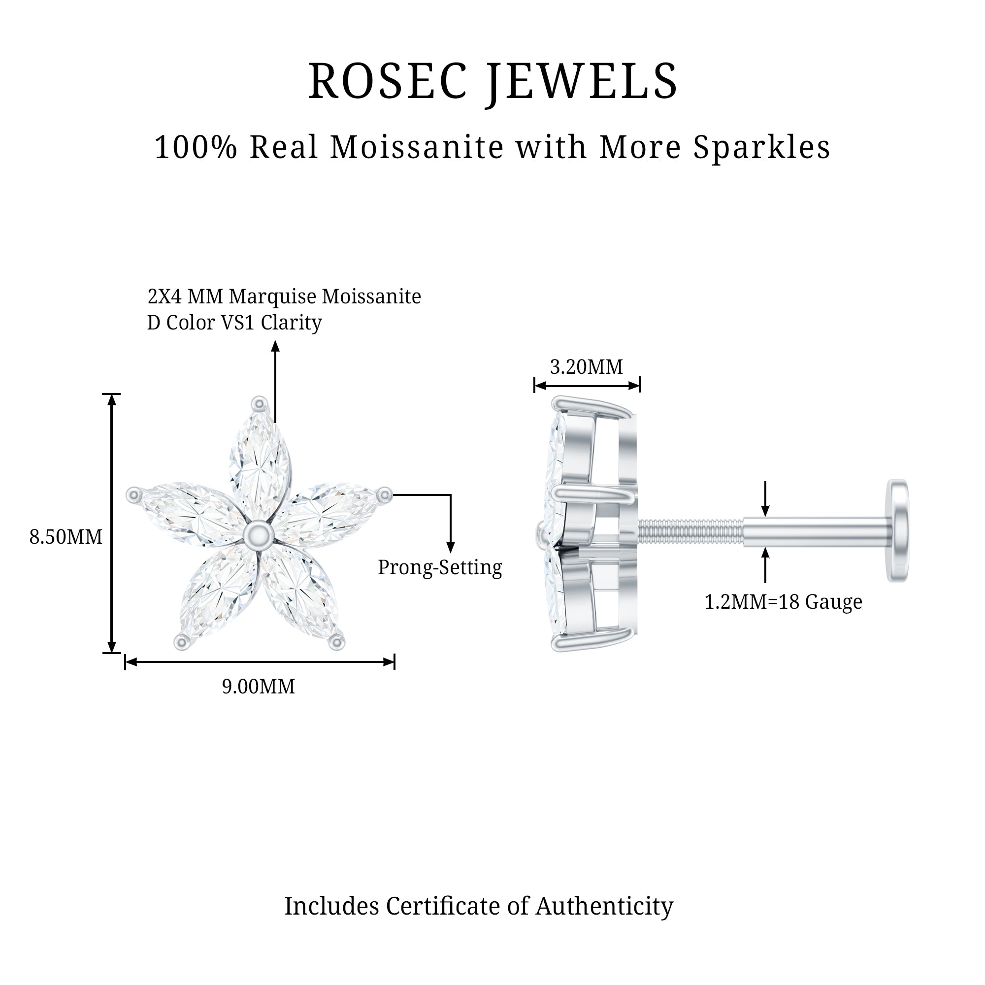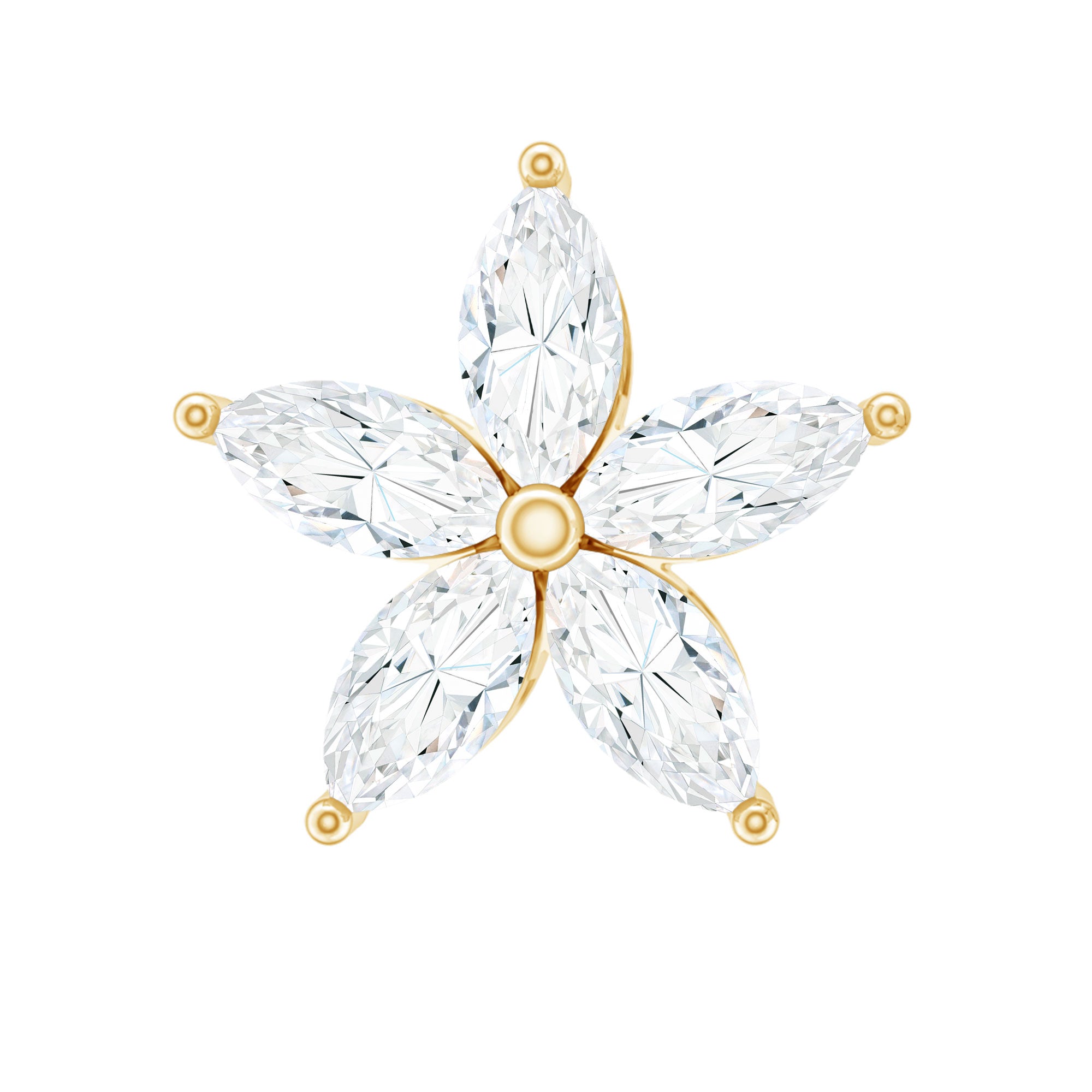 The Moissanite Flower Earring is a dazzling and elegant piece of jewelry that features five sparkling Marquise Cut Moissanite arranged in the shape of a beautiful flower design. Style this Floral Earring on your Helix, Cartilage, or Upper Lobe Piercing and pair it with your favorite outfits. The Flat Back Closure will keep it comfortably secured in place.