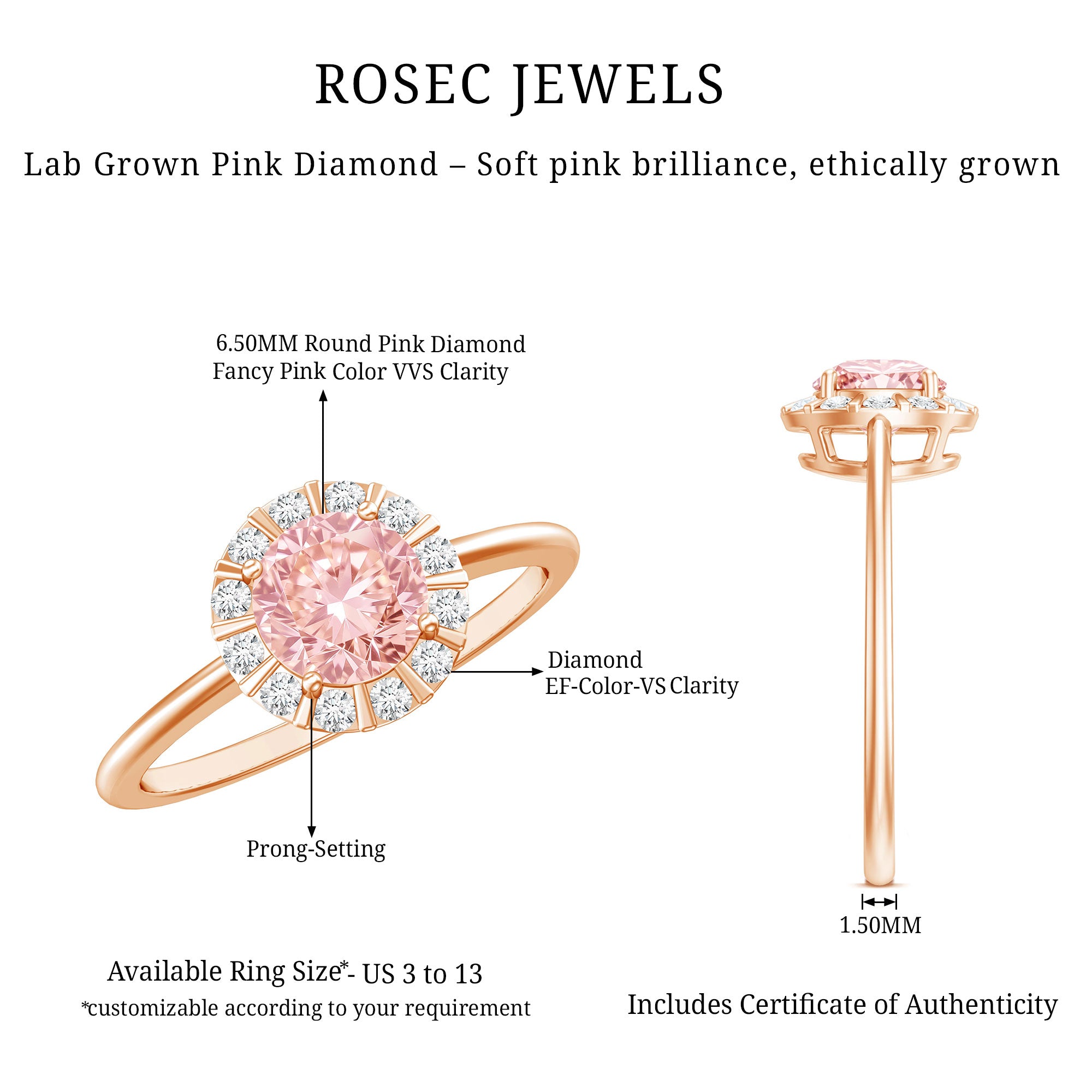 Gemstone Quality:VVS, Metal:14K Rose Gold, Select Your Ring Size (US):5