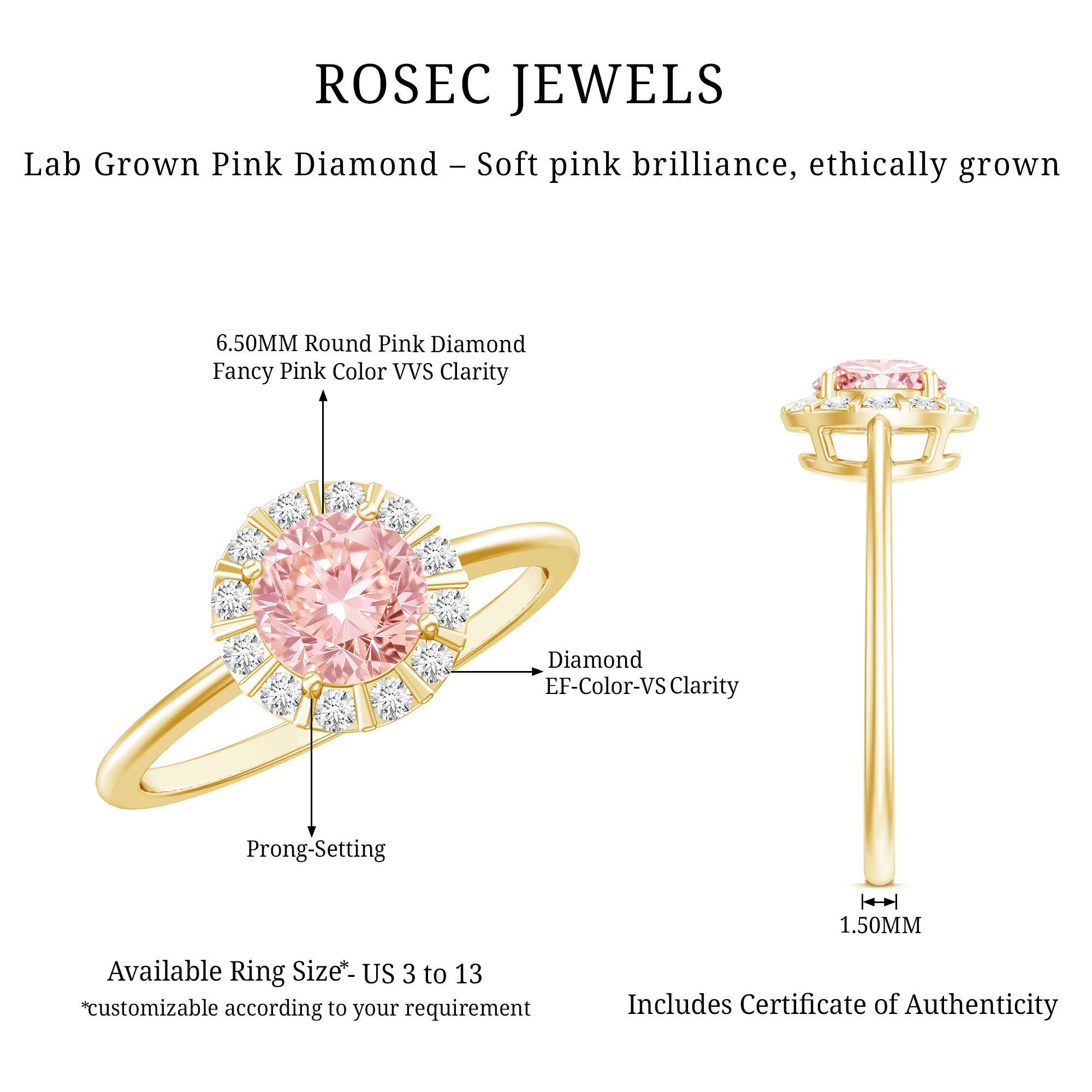 Get ready to receive a flood of compliments whenever you don this stunning Circle Engagement Ring. At its heart lies a 1 Carat Round Shaped Lab Grown Pink Diamond, securely held in prong setting and surrounded by a halo of delicate round cut lab grown white diamond gemstones. This Round Engagement Ring offers an affordable and sustainable choice for those seeking sparkling rings for their special day. This Halo Engagement Ring is the perfect gift for her, ideal for commemorating the love and bond you share, and it comes with a Certificate of Authenticity, guaranteeing outstanding craftsmanship and quality. It beautifully merges timeless elegance with a contemporary flair, delivering a sophisticated appearance that shines with remarkable brilliance. This Lab Grown Pink Diamond Ring is available in a range of sizes, ensuring a perfect fit that feels custom-made for you. Every detail of this Pink Diamond Engagement Ring for Women showcases precision, passion, and a touch of magic that only true craftsmanship can offer. Let your fingers tell your story and allow your love to shine with a brilliance as unique as your relationship.