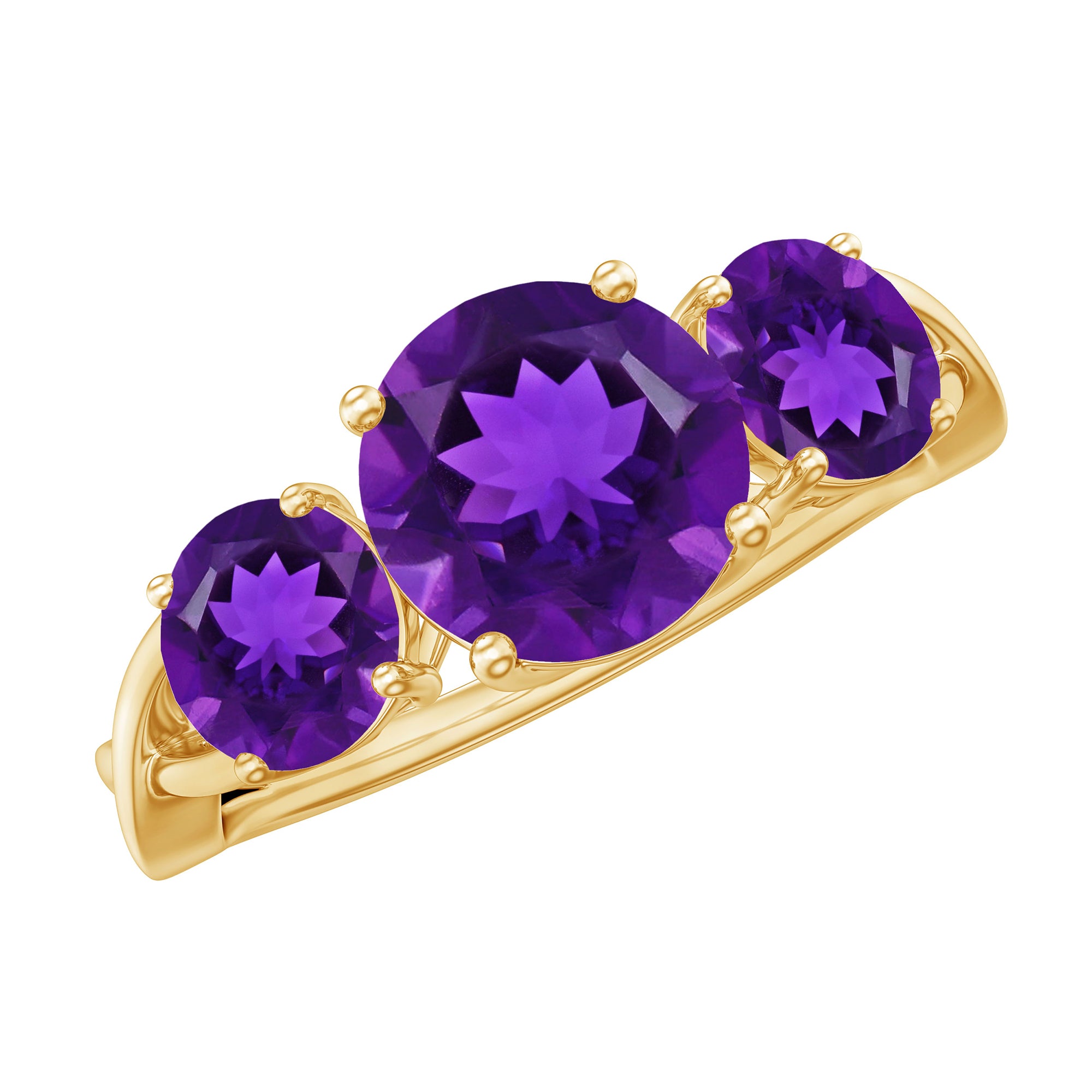 Celebrate the special occasion of your life by gifting your beloved this lovely Three Stone Ring adorned with round shape Amethyst in Prong Setting. This Anniversary Ring for Women is crafted with a Crossover Shank to make her fall in love with you all over again.
