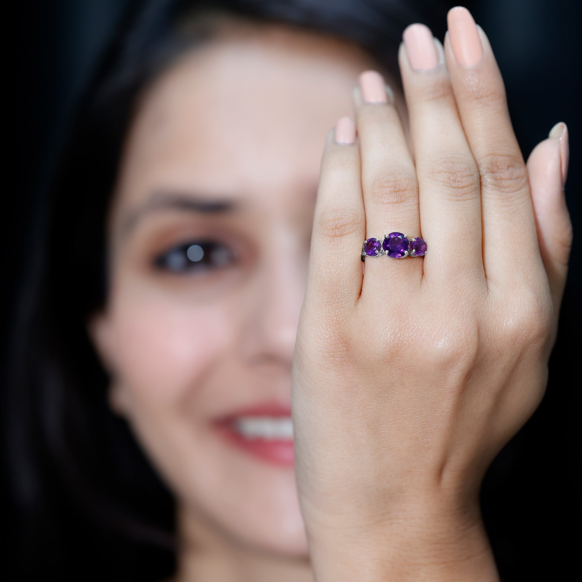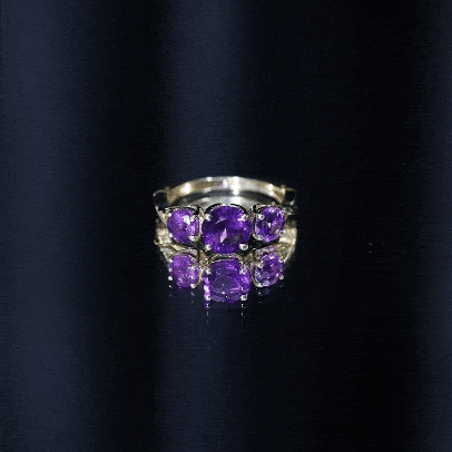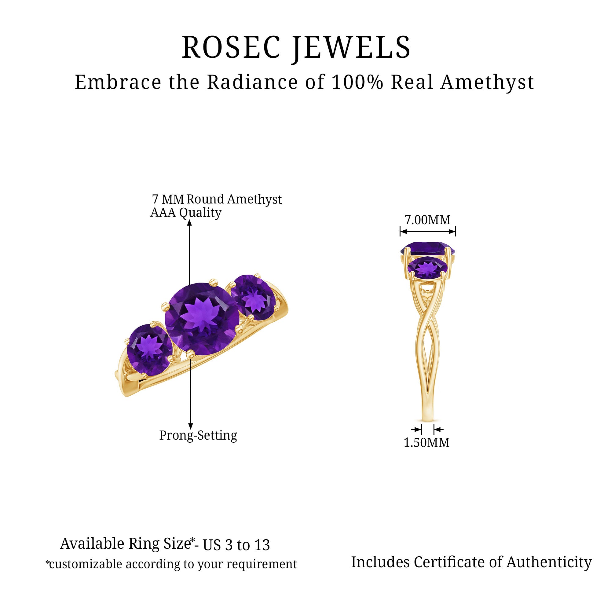 Celebrate the special occasion of your life by gifting your beloved this lovely Three Stone Ring adorned with round shape Amethyst in Prong Setting. This Anniversary Ring for Women is crafted with a Crossover Shank to make her fall in love with you all over again.