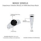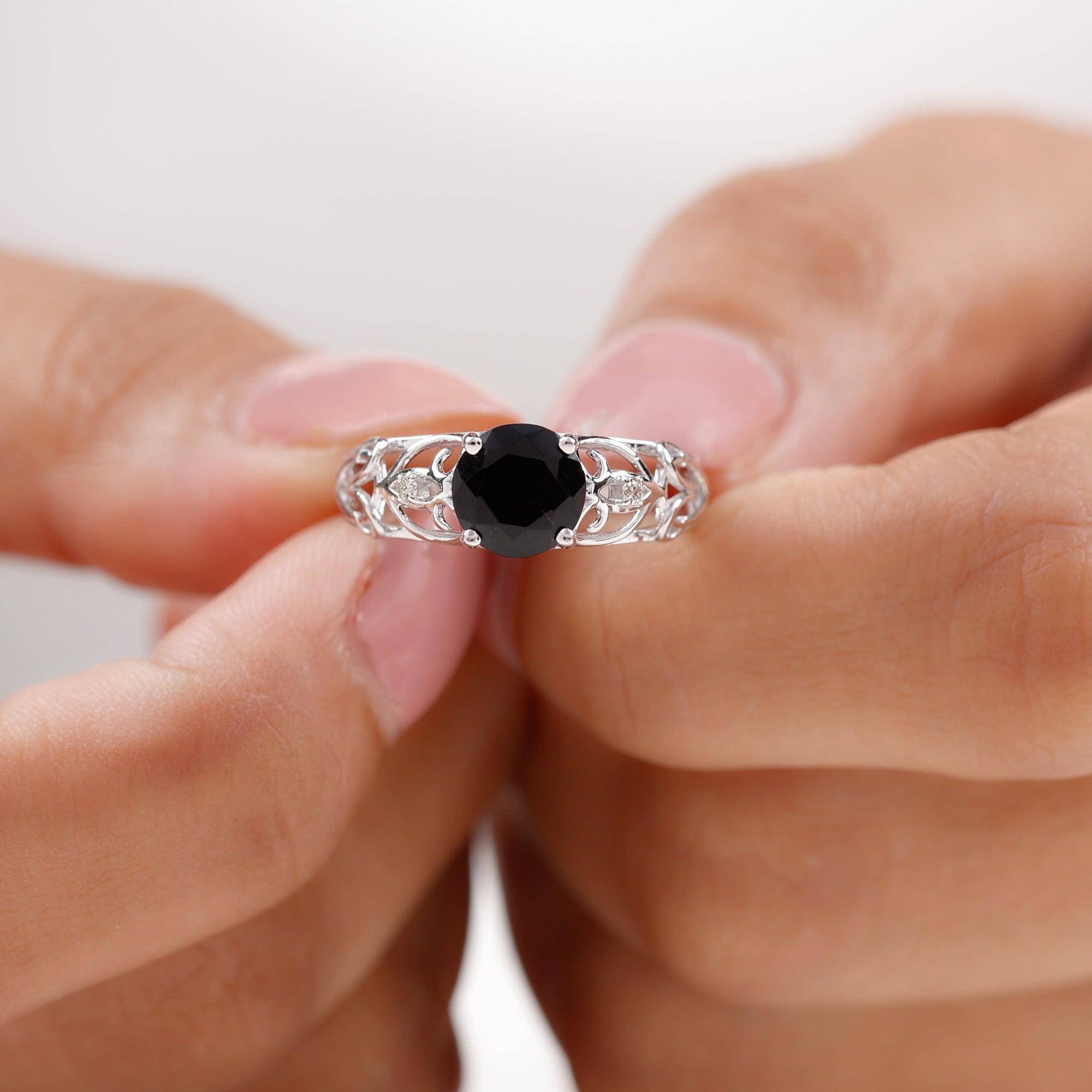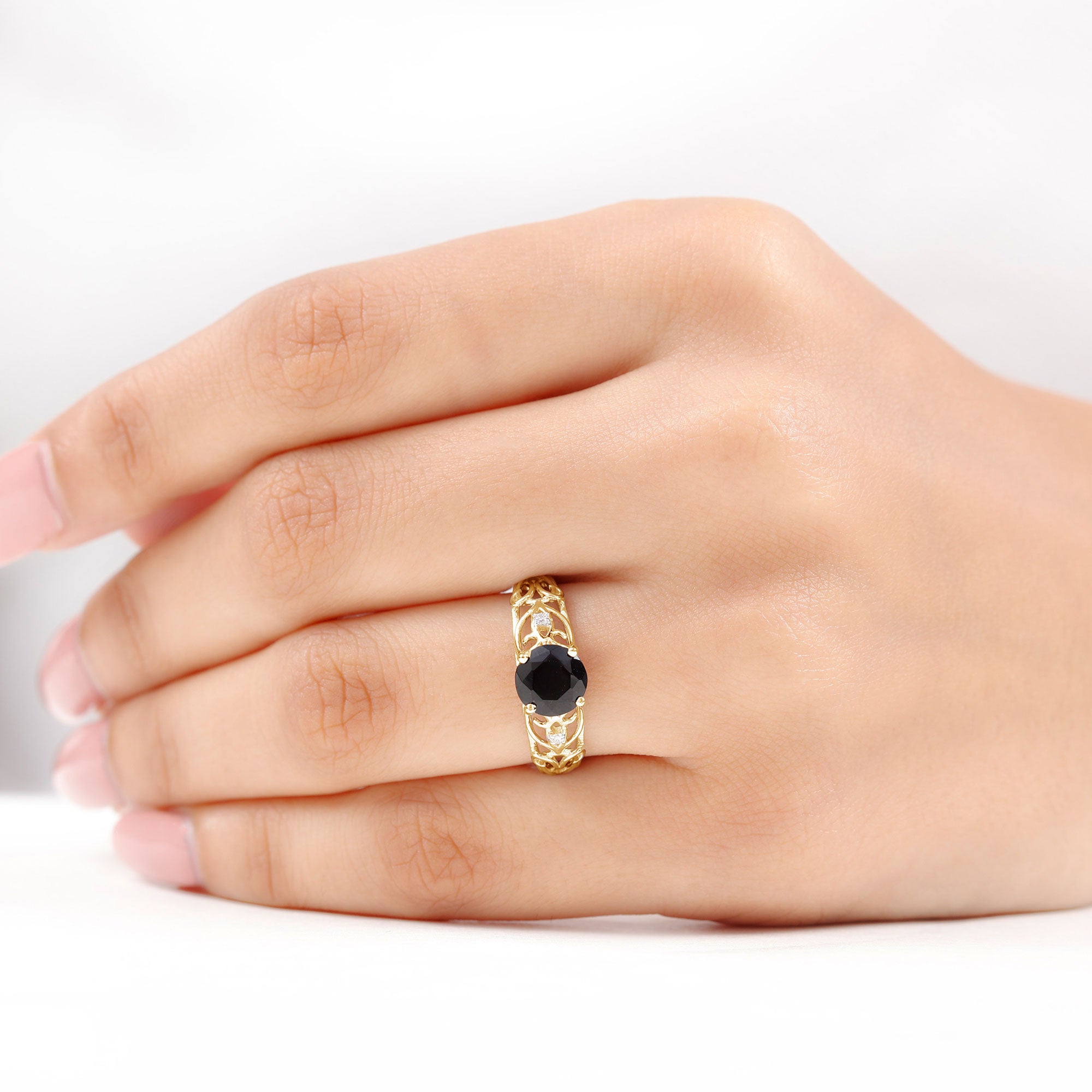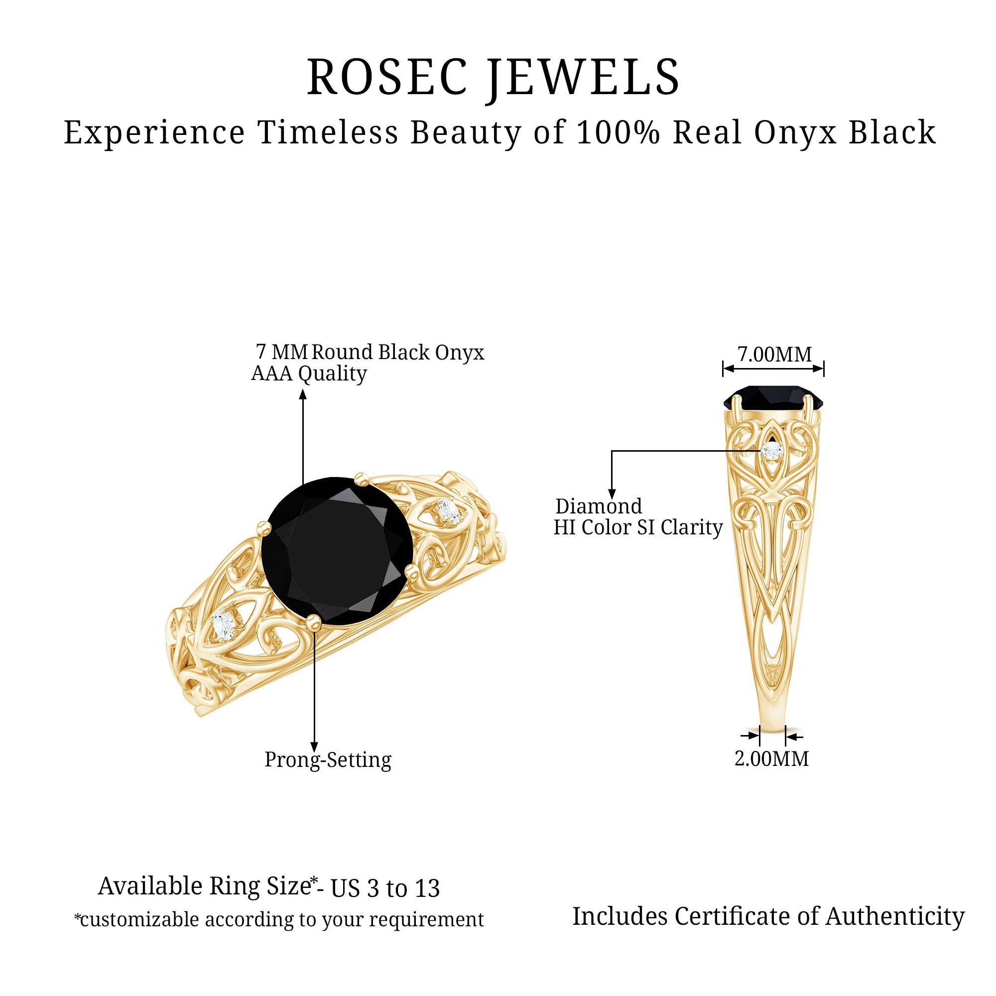 Step into a world of timeless design with this Black Onyx Engagement Ring that brings together elegance, boldness, and charm. At the center sits an 8 MM round cut black onyx, securely set in prong setting. What makes this Vintage Black Onyx Ring truly stand out is the intricate filigree detailing along the band. Crafted to reflect the beauty of old-world design, the fine metalwork is accented with dainty round cut diamonds that offer a soft sparkle and highlight the antique feel of the ring. Every detail is thoughtfully placed to give the piece a classic look with a romantic soul. This thoughtful blend of vintage influence and modern wearability makes it ideal for someone who appreciates classic style with a twist of individuality. Whether you are choosing it for an engagement, a meaningful gift, or simply to add to your own collection, this Black Onyx and Diamond Ring is designed to leave a lasting impression. It is perfect for everyday wear or for marking life’s special milestones, offering both durability and timeless appeal. Crafted with care and available in various sizes, the Antique Looking Engagement Ring comes in a beautifully packaged box, ready to become part of someone’s story.