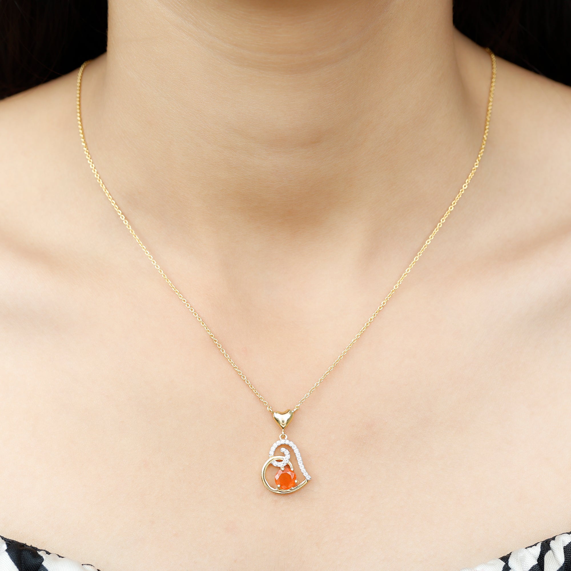Be Dazzle with these beautiful Heart Drop Pendant embellished with Round Shape Fire Opal as Solitaire in 3 Prong Setting and Round Shape Diamond in Prong Setting, Crafted in Solid Gold.