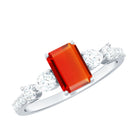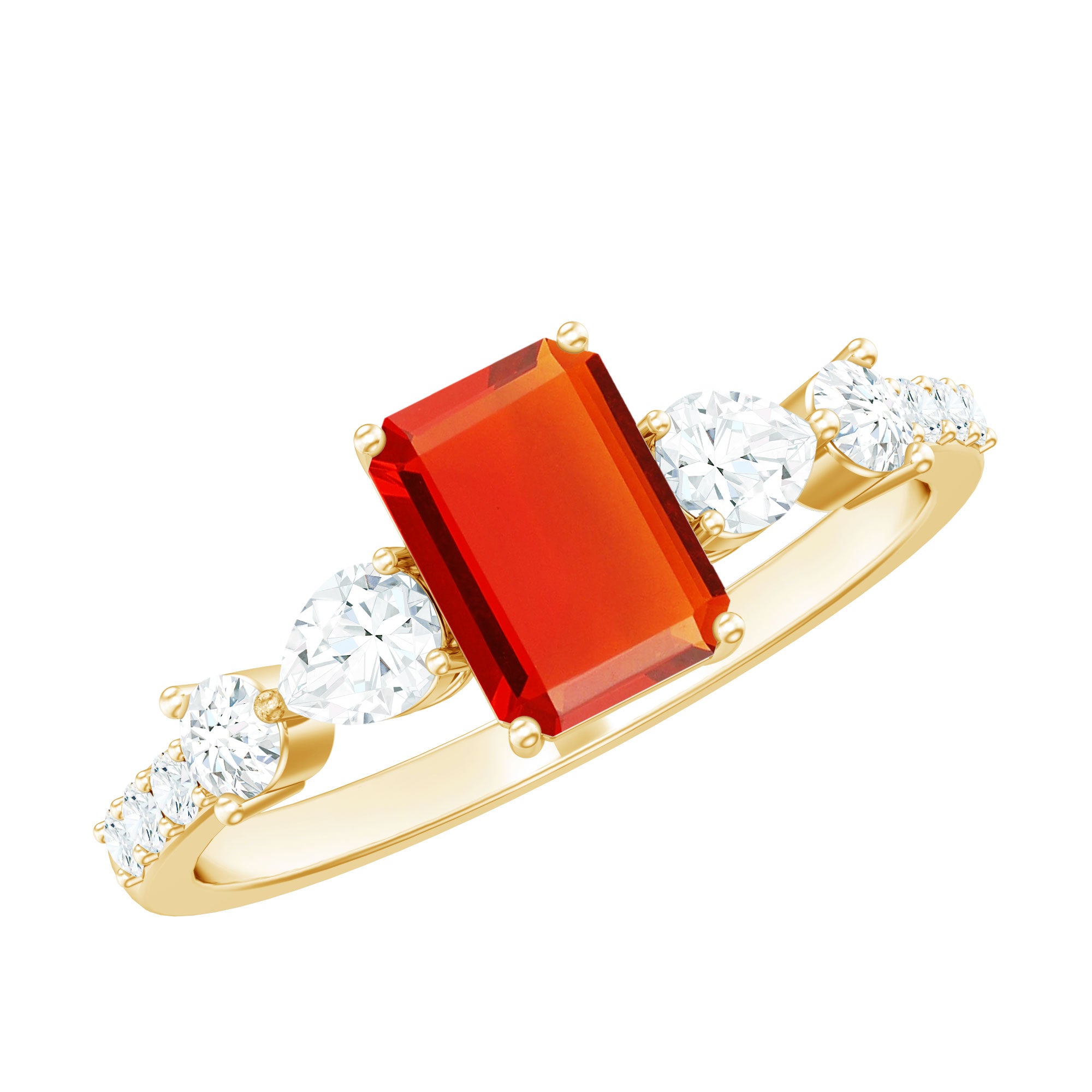 Express your love to your beloved with this Solitaire Fire Opal Engagement Ring. This Classic Engagement Ring is decorated with Octagon Cut Fire Opal as a solitaire in a prong setting with Round and Pear Cut Moissanite in a side stone setting. This October Birthstone Ring is all your need to make her feel special.