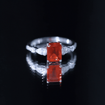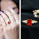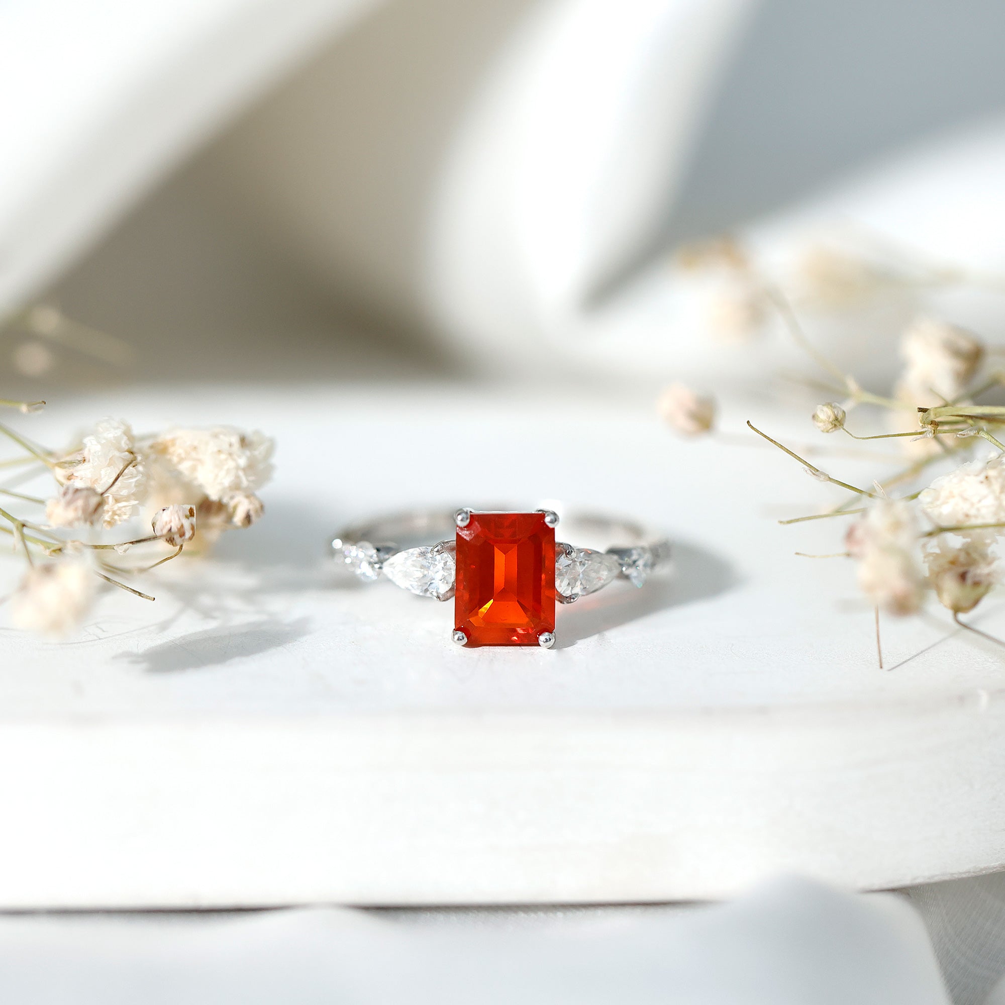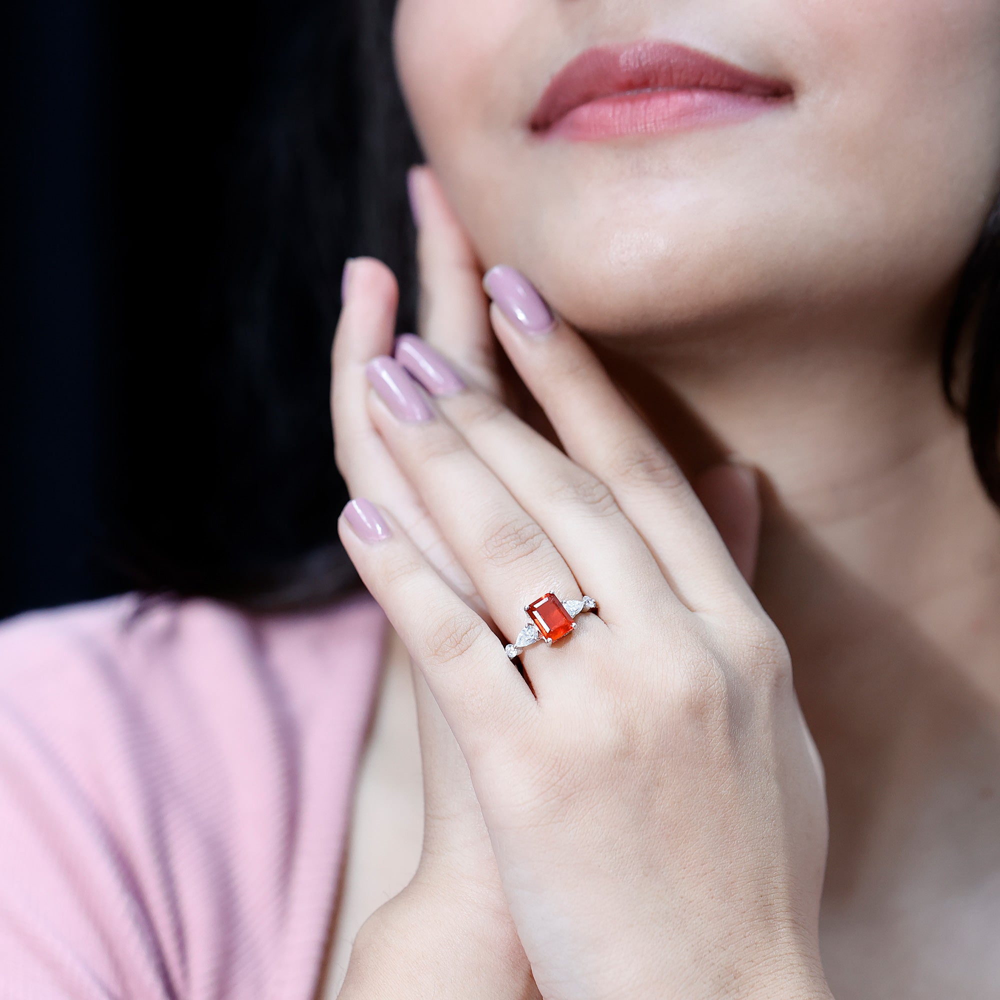 Express your love to your beloved with this Solitaire Fire Opal Engagement Ring. This Classic Engagement Ring is decorated with Octagon Cut Fire Opal as a solitaire in a prong setting with Round and Pear Cut Moissanite in a side stone setting. This October Birthstone Ring is all your need to make her feel special.