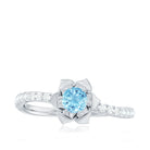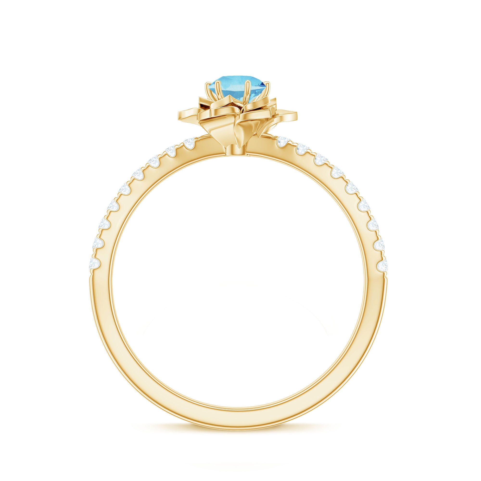 The Perfect Combination of Aquamarine and Diamond in this Rose Flower Ring is mesmerizing. The Round Natural Aquamarine is set in Centre of a Gold Petals of Rose Flower in the curved shank. Get this Floral Inspired Engagement Ring for your Blooming Lady Love, this Aquamarine and Diamond Engagement Ring is a stunning jewelry, which she will cherish her whole life.