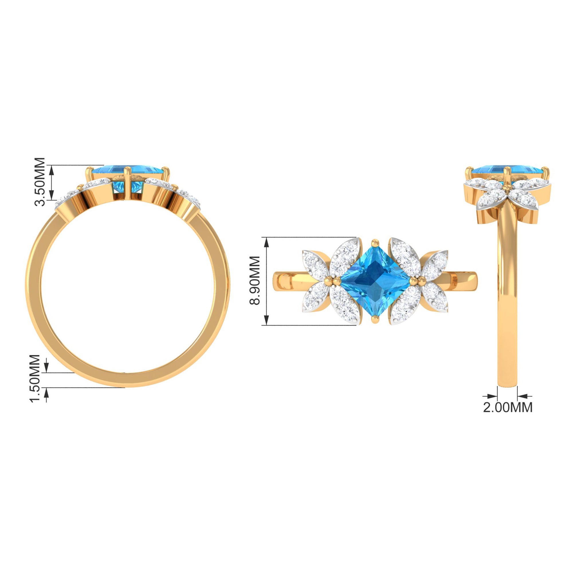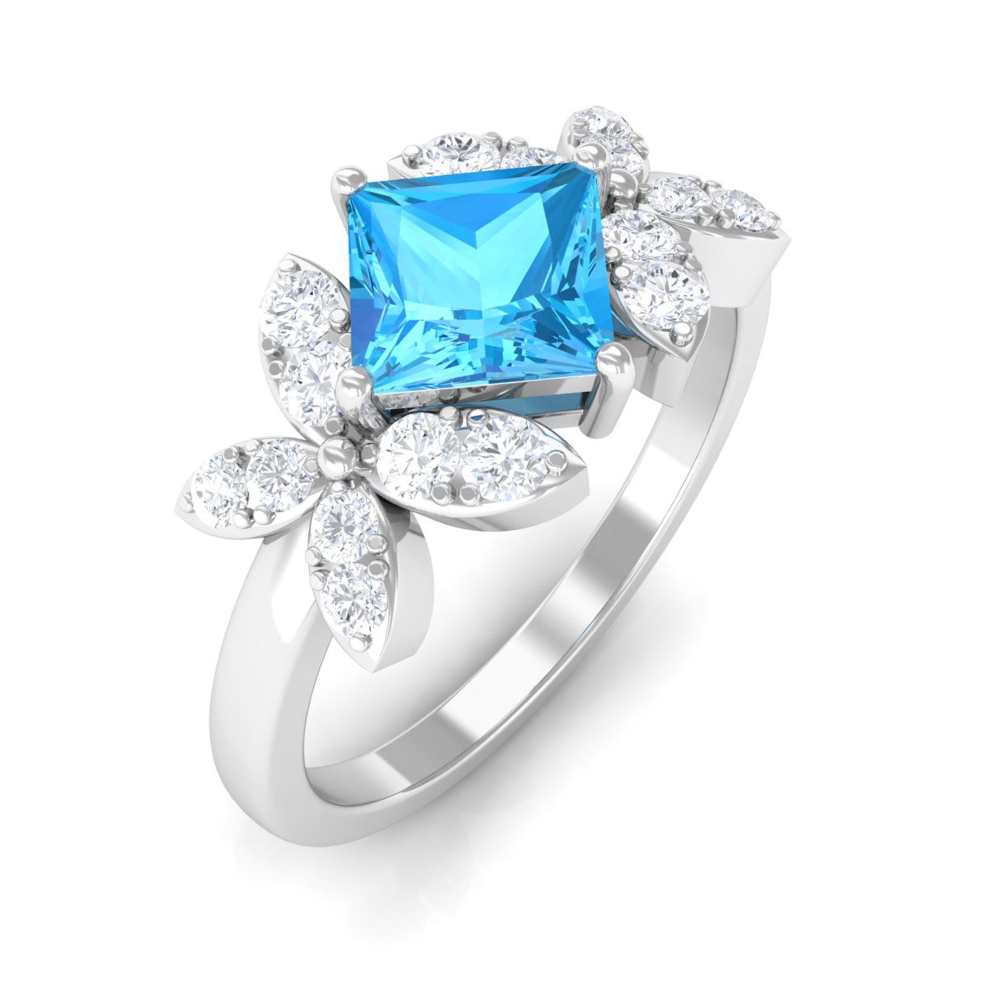 Ignite the magic of love with our enchanting Princess Cut Swiss Blue Topaz Engagement Ring, a perfect expression of your deep affection. The central focus, a stunning Princess Cut Swiss Blue Topaz, radiates with a regal hue, symbolizing the depth of your commitment. Surrounding the centerpiece, Round Shape Diamond Stones add a brilliant halo, elevating the rings allure. Meticulously designed, this engagement ring is a testament to your enduring love and the promise of a shared future. The vibrant blue of the Swiss Blue Topaz represents tranquility, while the Diamond stones symbolize the everlasting sparkle of your bond. Surprise her with this captivating ring, a symbol of your cherished and eternal love.