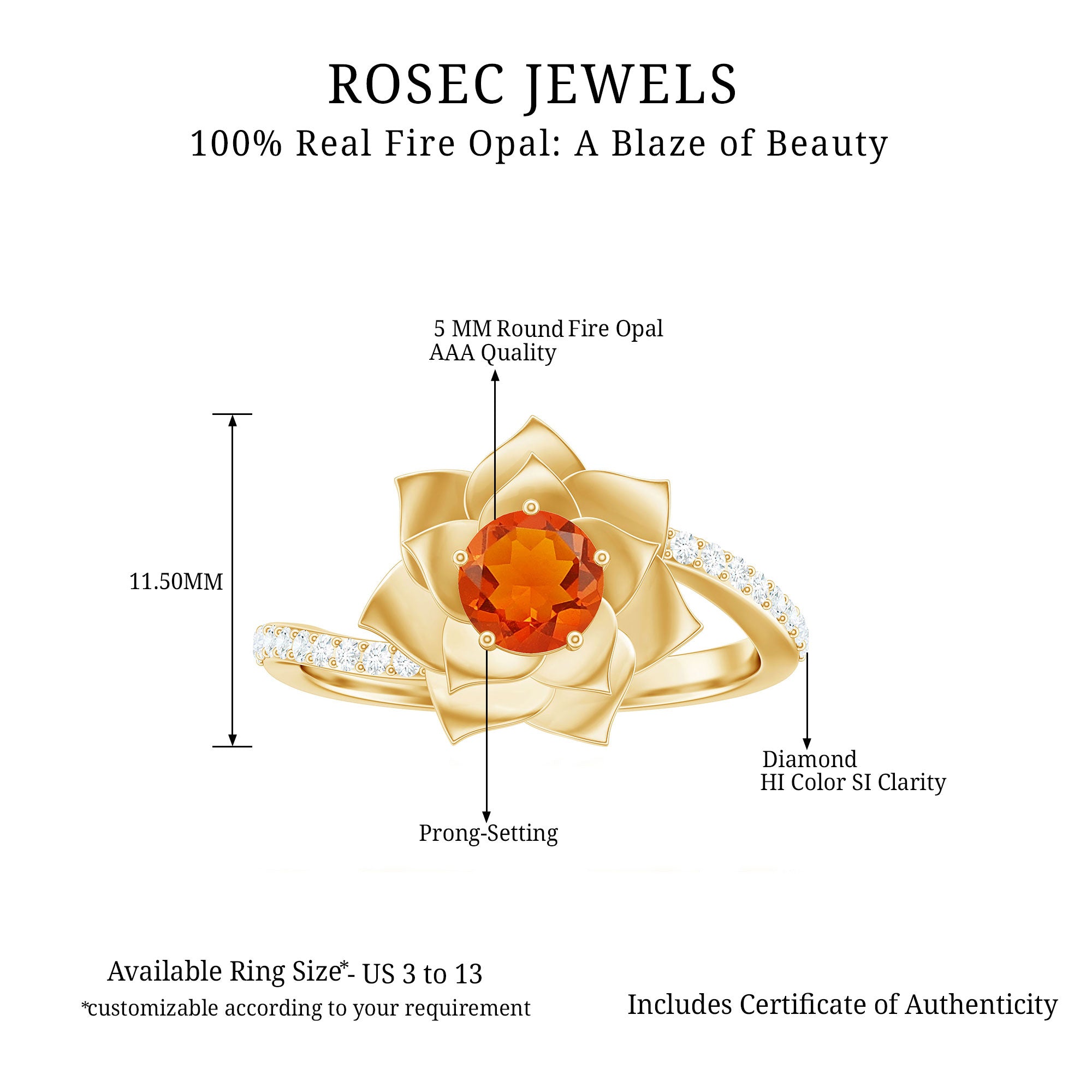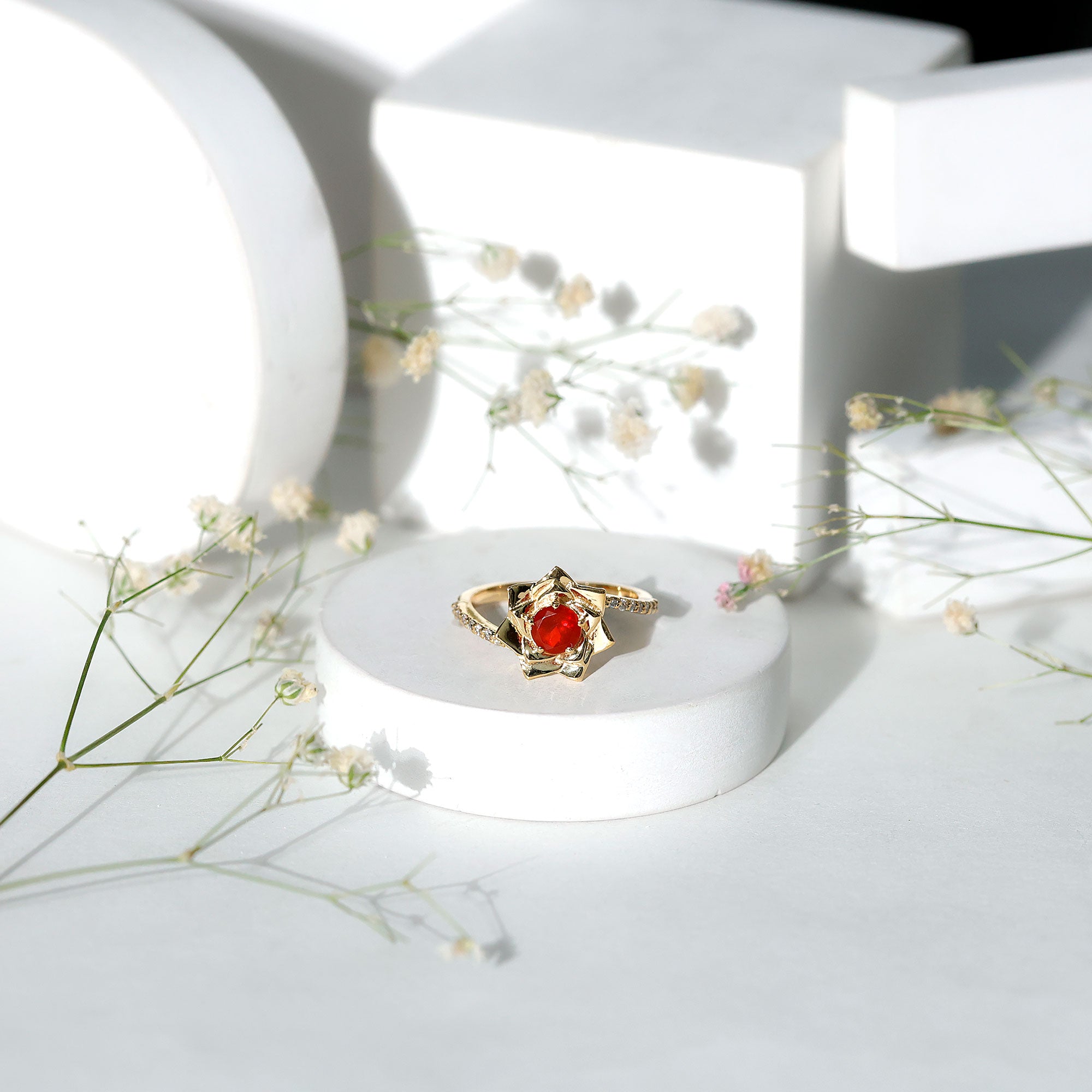 The Perfect Combination of Fire Opal and Diamond in this Rose Flower Ring is mesmerizing. The Round Natural Fire Opal is set in Centre of a Gold Petals of Rose Flower. Get this Floral Inspired Engagement Ring for your Blooming Lady Love, this Fire Opal and Diamond Engagement Ring is a stunning jewelry, which she will cherish her whole life.