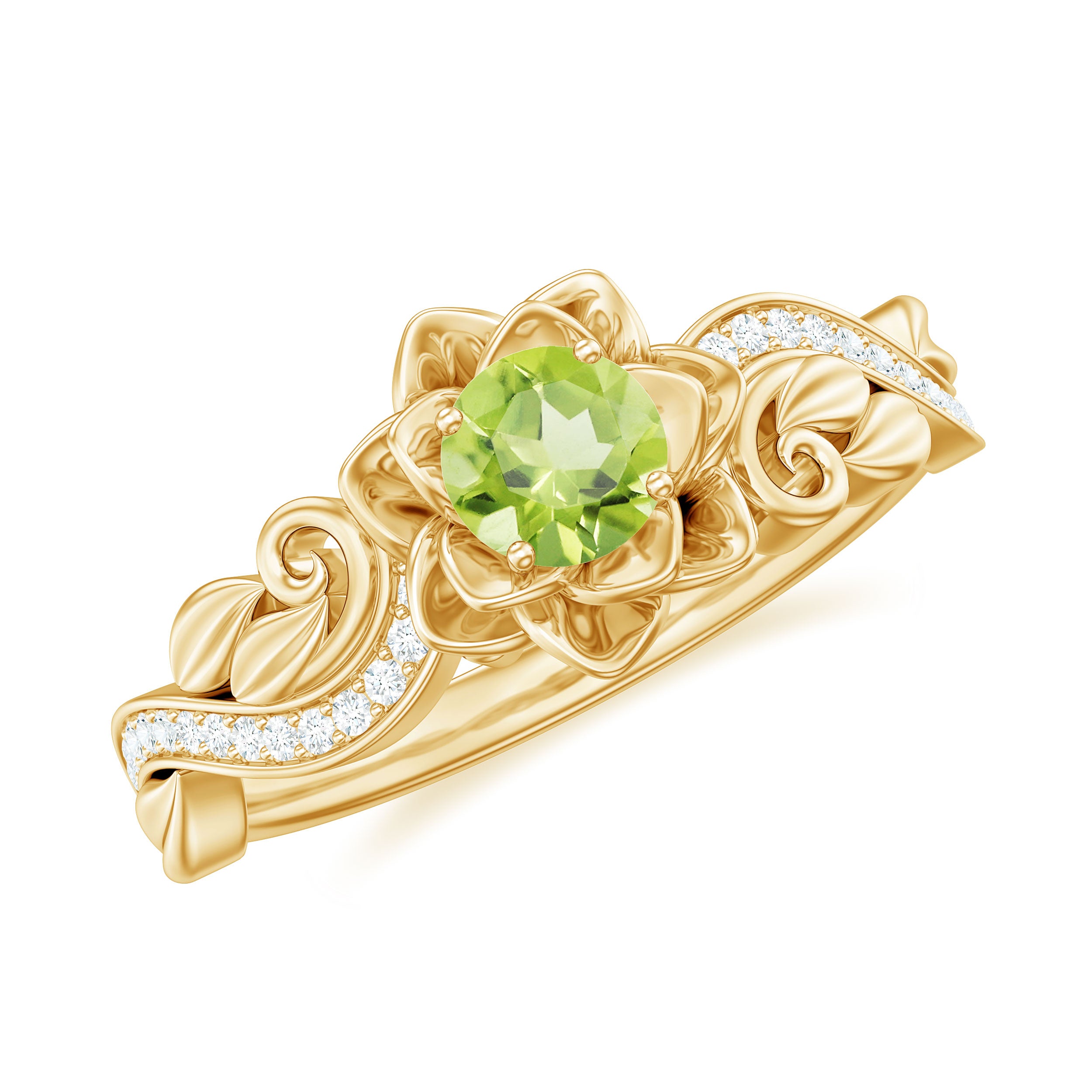 Experience the elegance of this Peridot Floral Engagement Ring. Its flower-shaped gold metal band, sparkling Diamond stones on the shank, and radiant Peridot create a glamorous and classic look. Expertly crafted from solid gold, this Peridot ring is the perfect choice for the fashion-forward woman.
